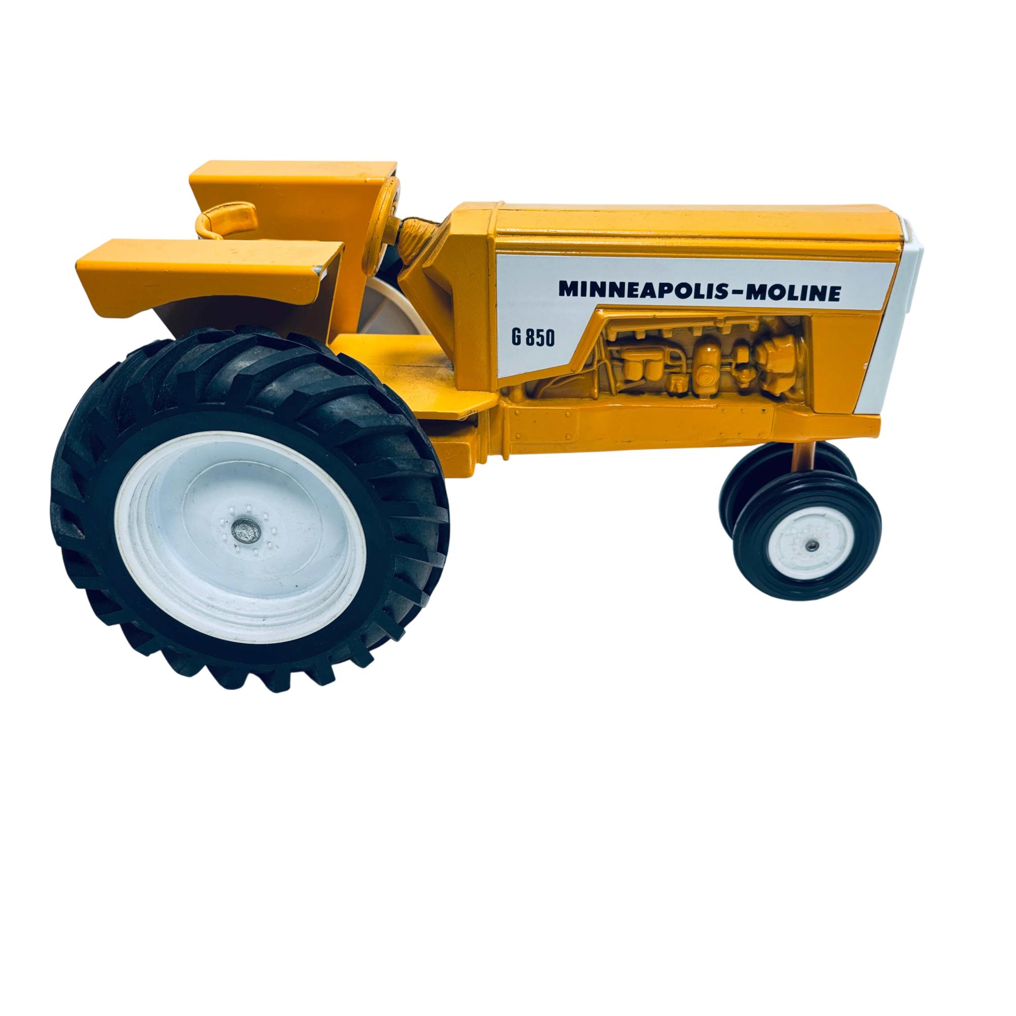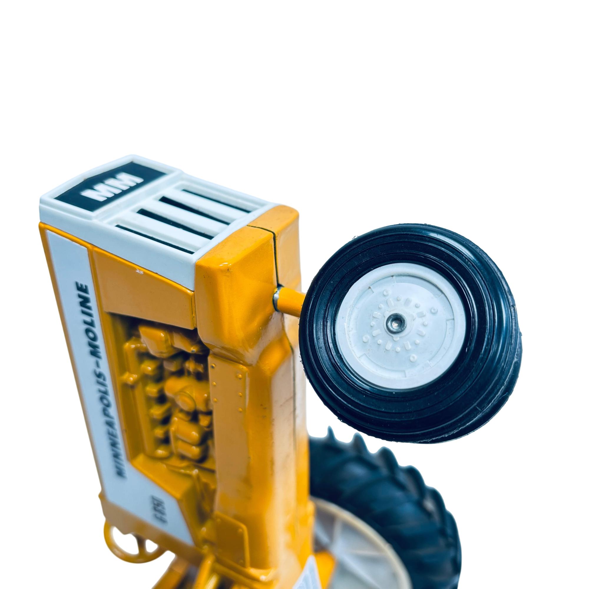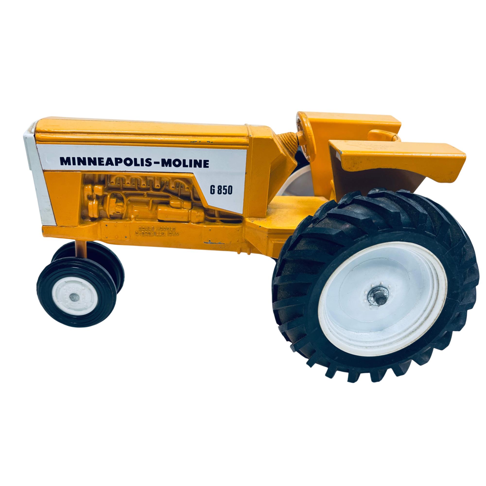 Minneapolis-Moline G850 1/16 Scale Model Toy Tractor by Scale Models is a detailed replica of the classic agricultural machine, featuring a vivid yellow body and realistic black wheels. This finely crafted scale model captures the distinct design elements of the original G850 tractor, making it an excellent collectible for fans of vintage farm equipment and model tractors.