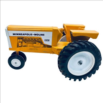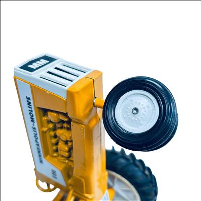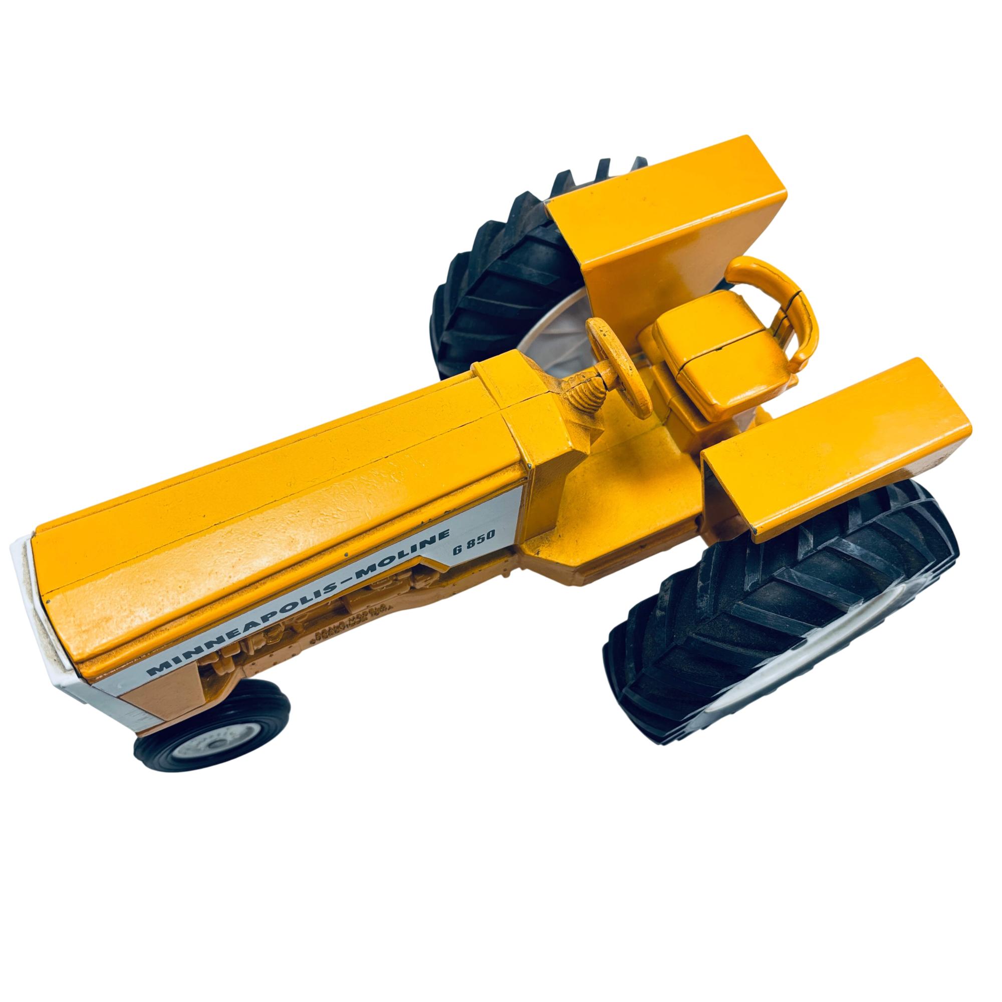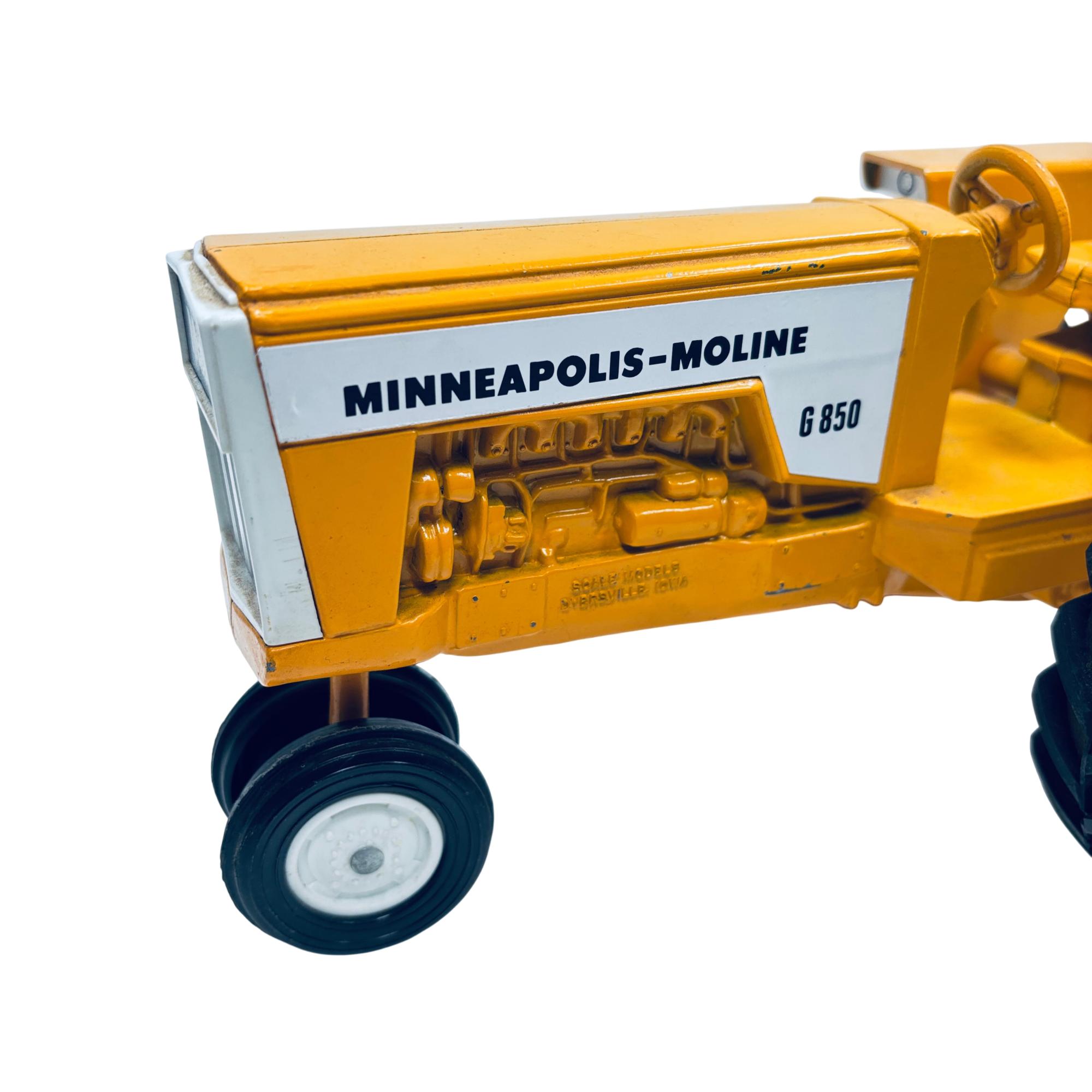 Minneapolis-Moline G850 1/16 Scale Model Toy Tractor by Scale Models is a detailed replica of the classic agricultural machine, featuring a vivid yellow body and realistic black wheels. This finely crafted scale model captures the distinct design elements of the original G850 tractor, making it an excellent collectible for fans of vintage farm equipment and model tractors.