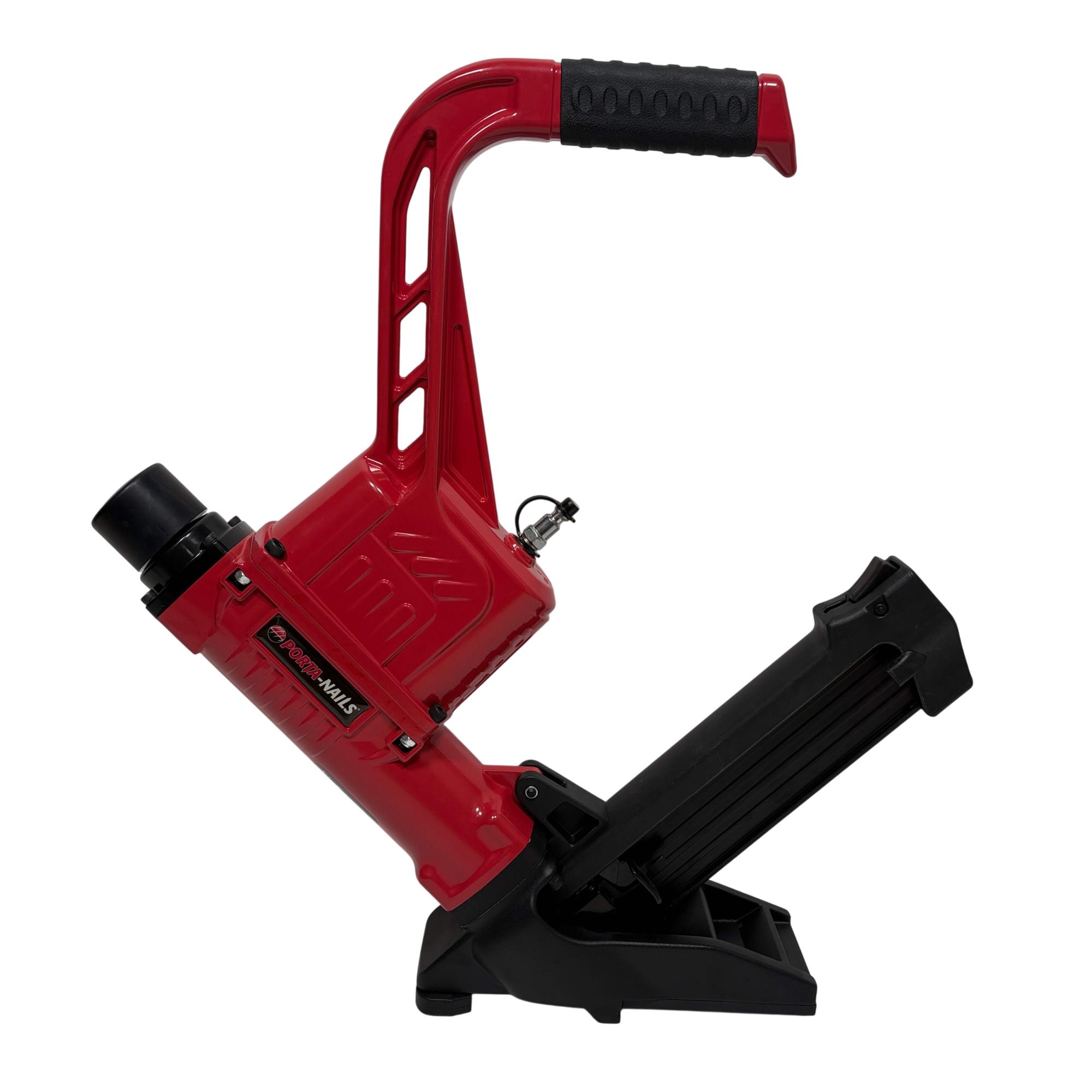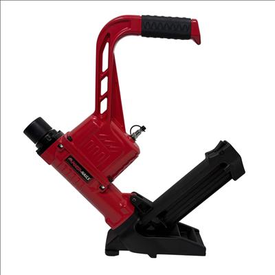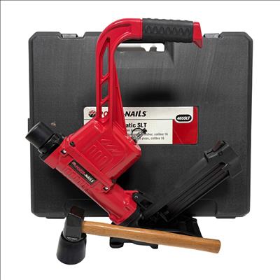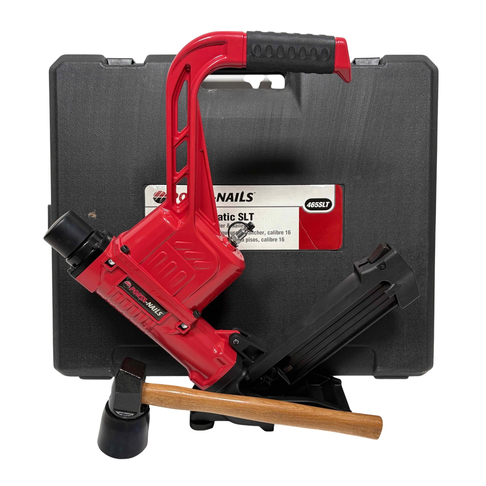 PORTA-NAILS 465SLT Portamatic SLT 3-in-1 Pneumatic 16-Gauge Floor Nailer & Stapler offers versatile functionality for flooring installation with its ability to operate as a nailer, stapler, and cleat nailer. Designed for professional use, this pneumatic tool delivers consistent power at a maximum of 120 PSI, capable of driving 16-gauge fasteners for secure floor attachment. Its red and black ergonomic design includes a dual handle for better control and precision on various flooring materials.