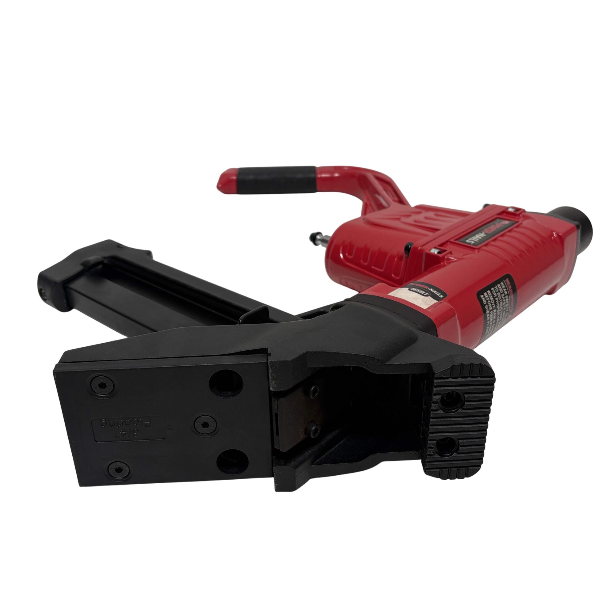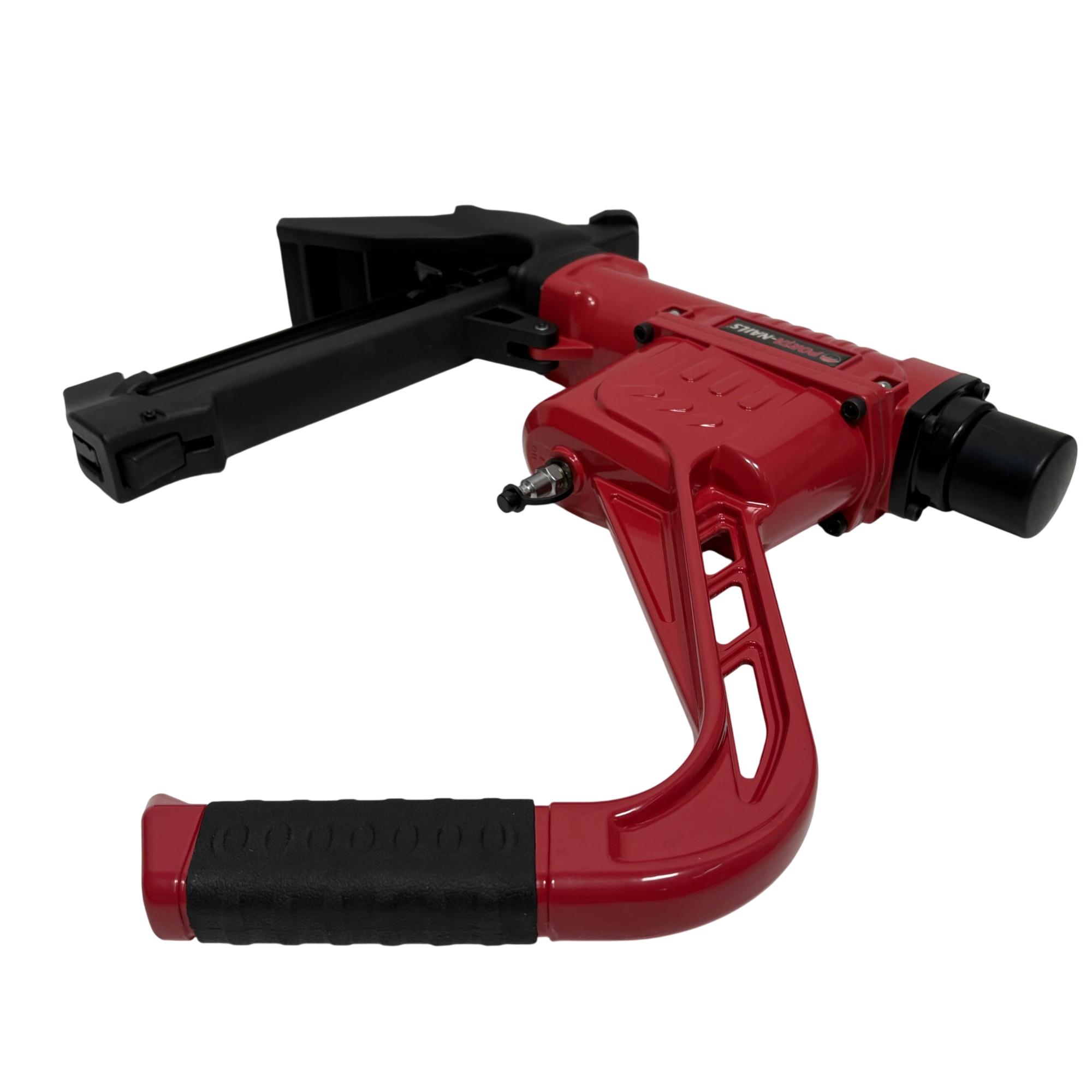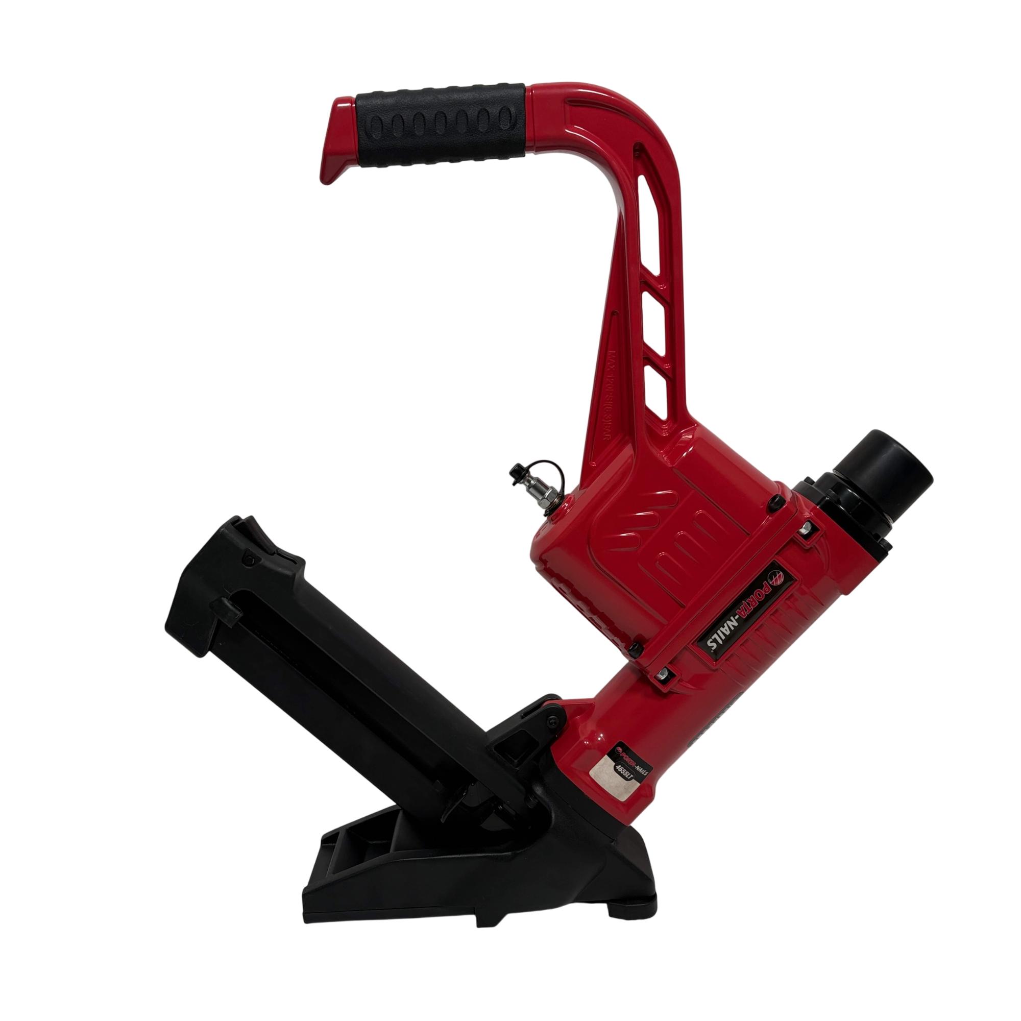 PORTA-NAILS 465SLT Portamatic SLT 3-in-1 Pneumatic 16-Gauge Floor Nailer & Stapler offers versatile functionality for flooring installation with its ability to operate as a nailer, stapler, and cleat nailer. Designed for professional use, this pneumatic tool delivers consistent power at a maximum of 120 PSI, capable of driving 16-gauge fasteners for secure floor attachment. Its red and black ergonomic design includes a dual handle for better control and precision on various flooring materials.