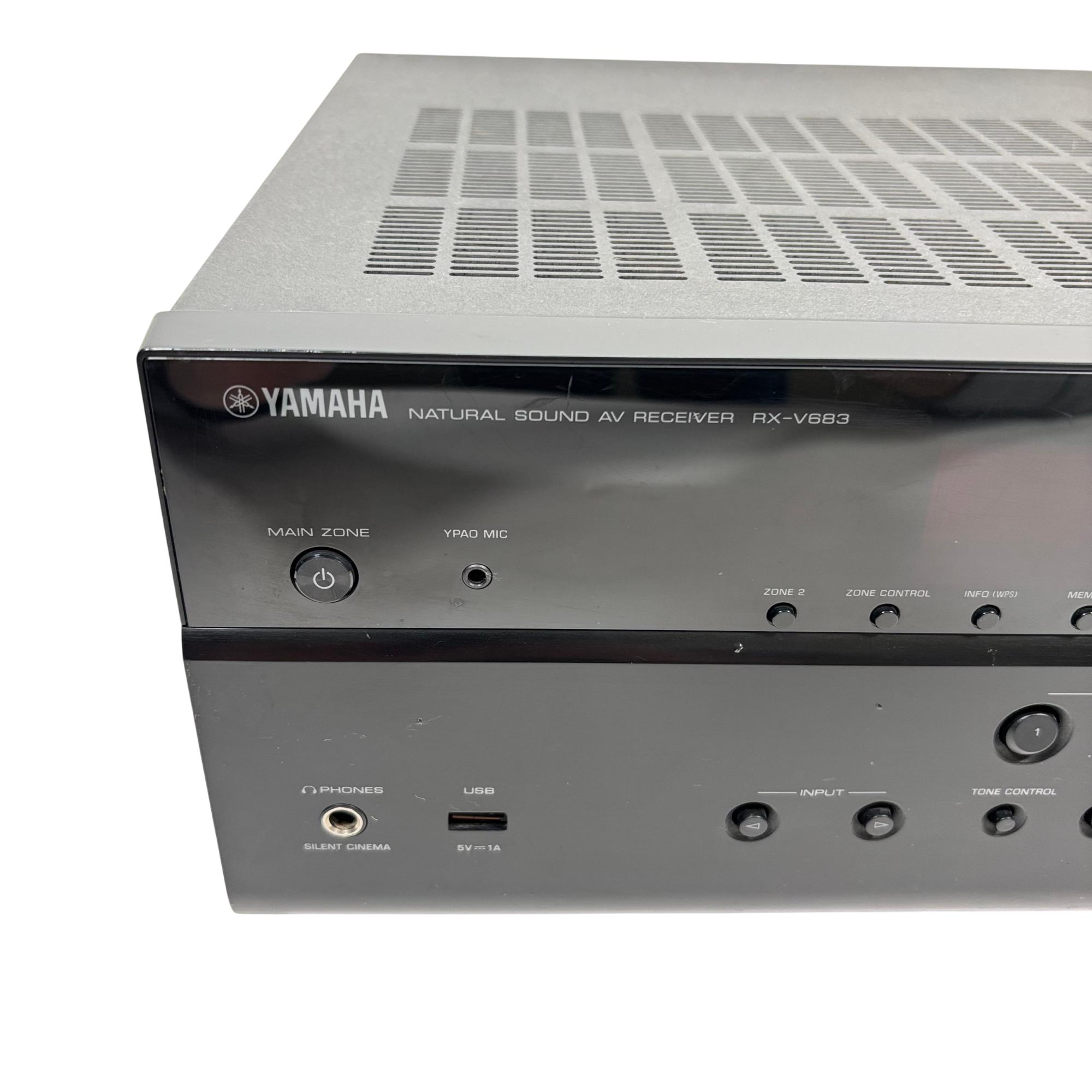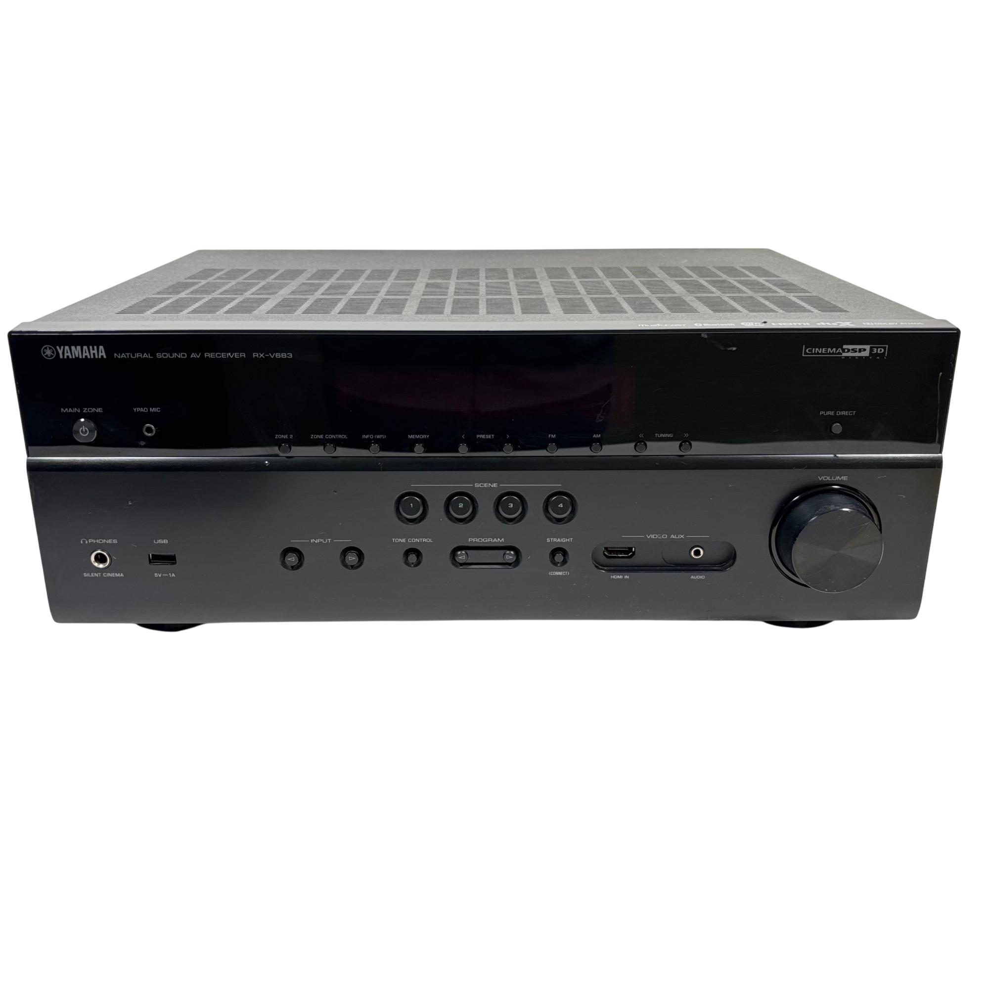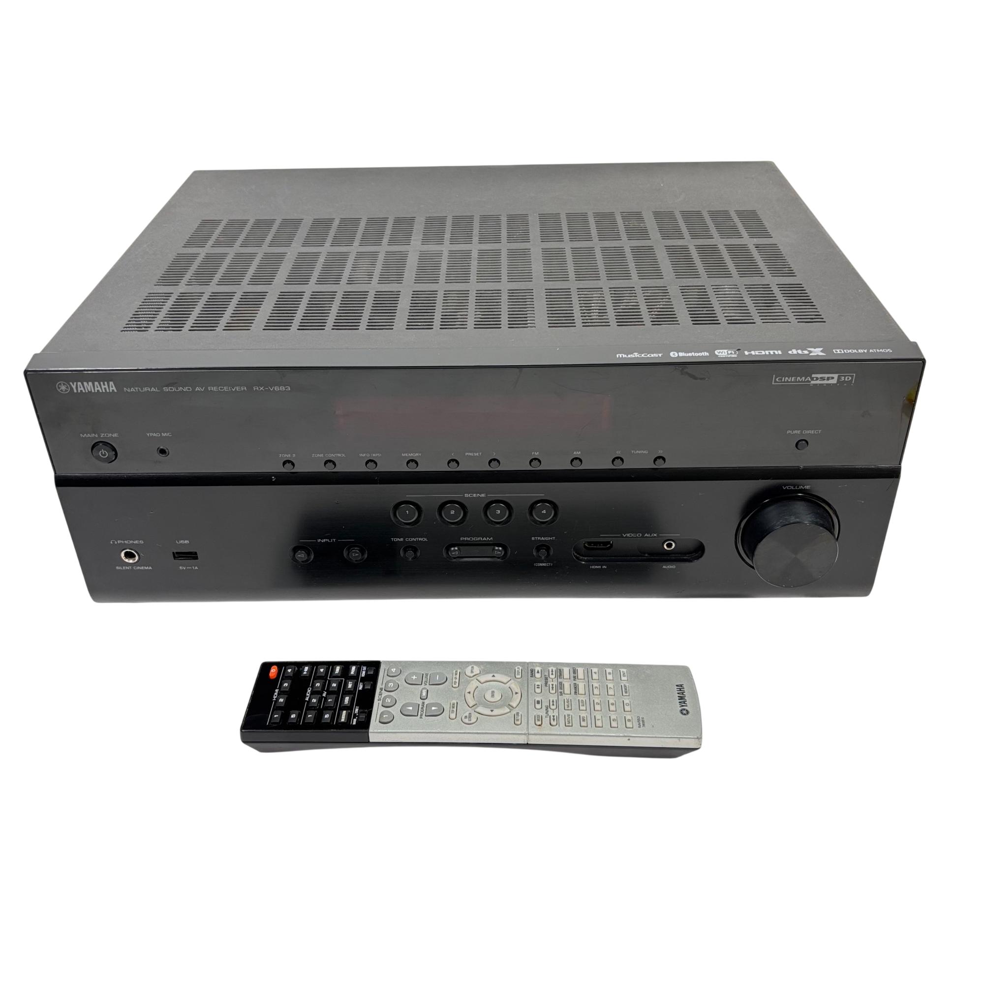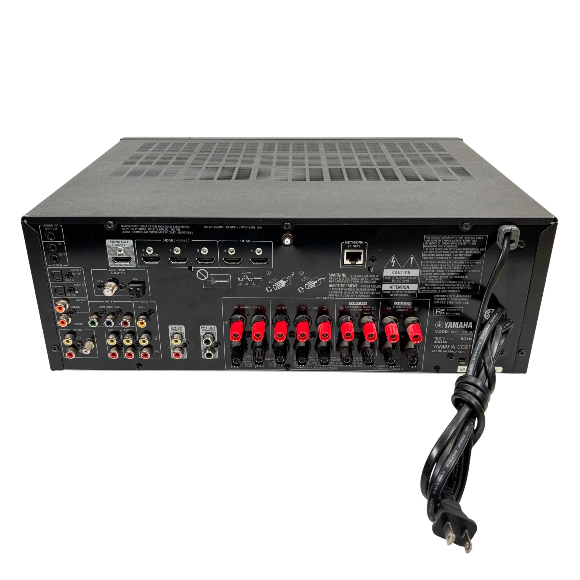 Yamaha RX-V683 7.2 Channel Network AV Receiver delivers immersive surround sound with advanced support for Dolby Atmos and DTS technologies, providing rich, natural audio for home theater setups. This receiver features comprehensive network connectivity options, including MusicCast and Bluetooth, allowing seamless streaming and multi-room integration with precise volume and tone controls for a customized listening experience.