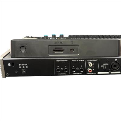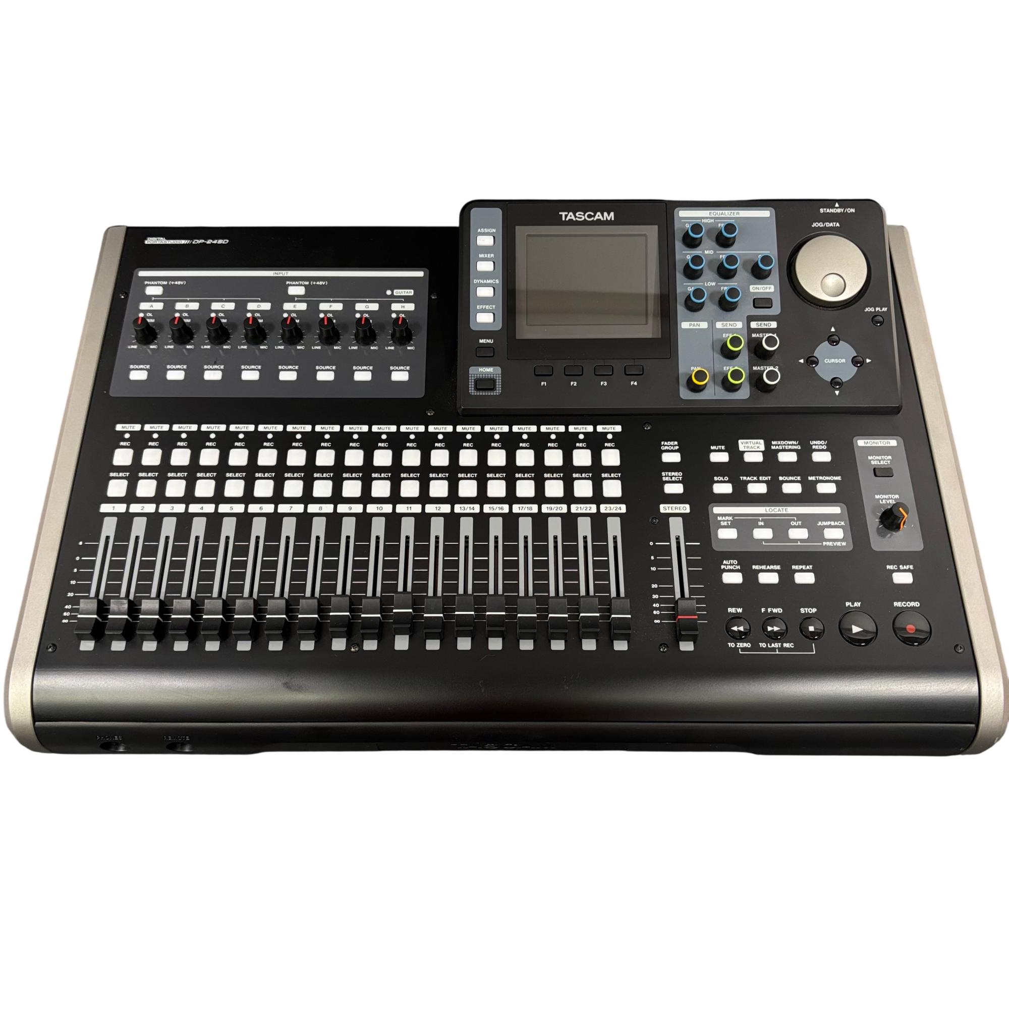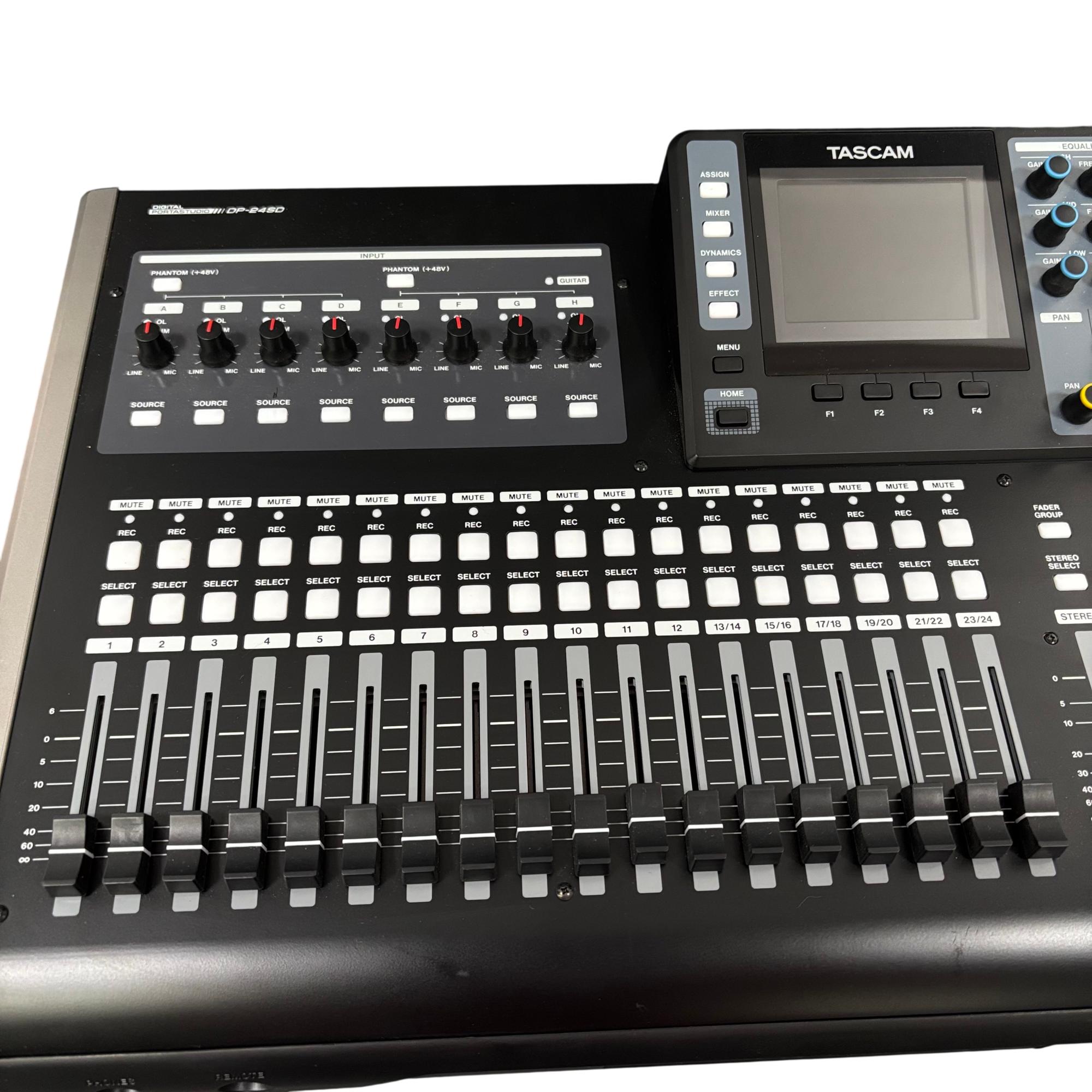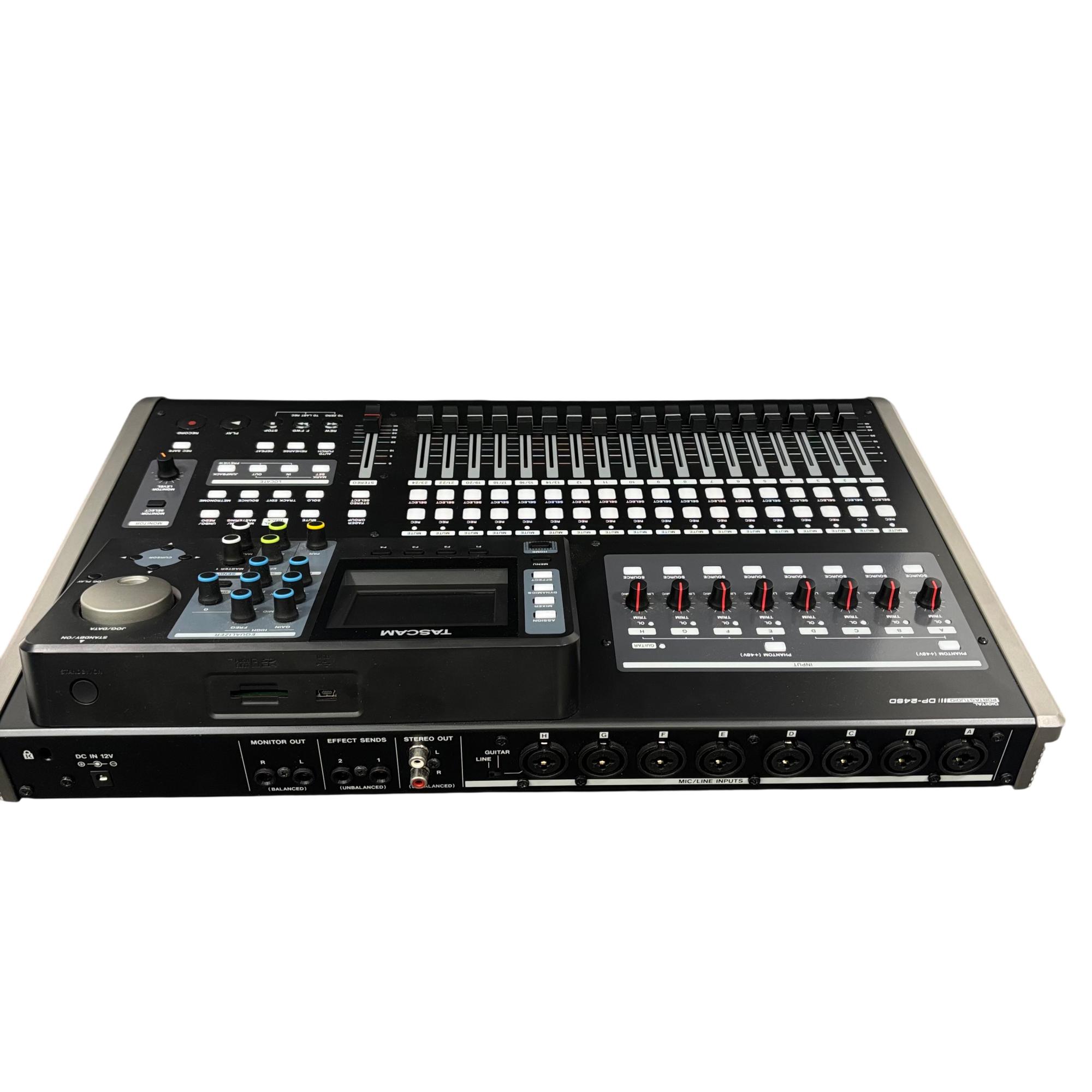 Tascam DP-24SD 24-Track Digital Portastudio Multitrack Recorder is a versatile audio recording device designed for professional and home studio use. It features 24 tracks of digital recording with intuitive button controls, balanced and unbalanced line inputs, and stereo outputs for precise mixing and monitoring. This compact unit integrates a control panel with effects sends, a built-in metronome, and comprehensive playback options to streamline multitrack production workflows.