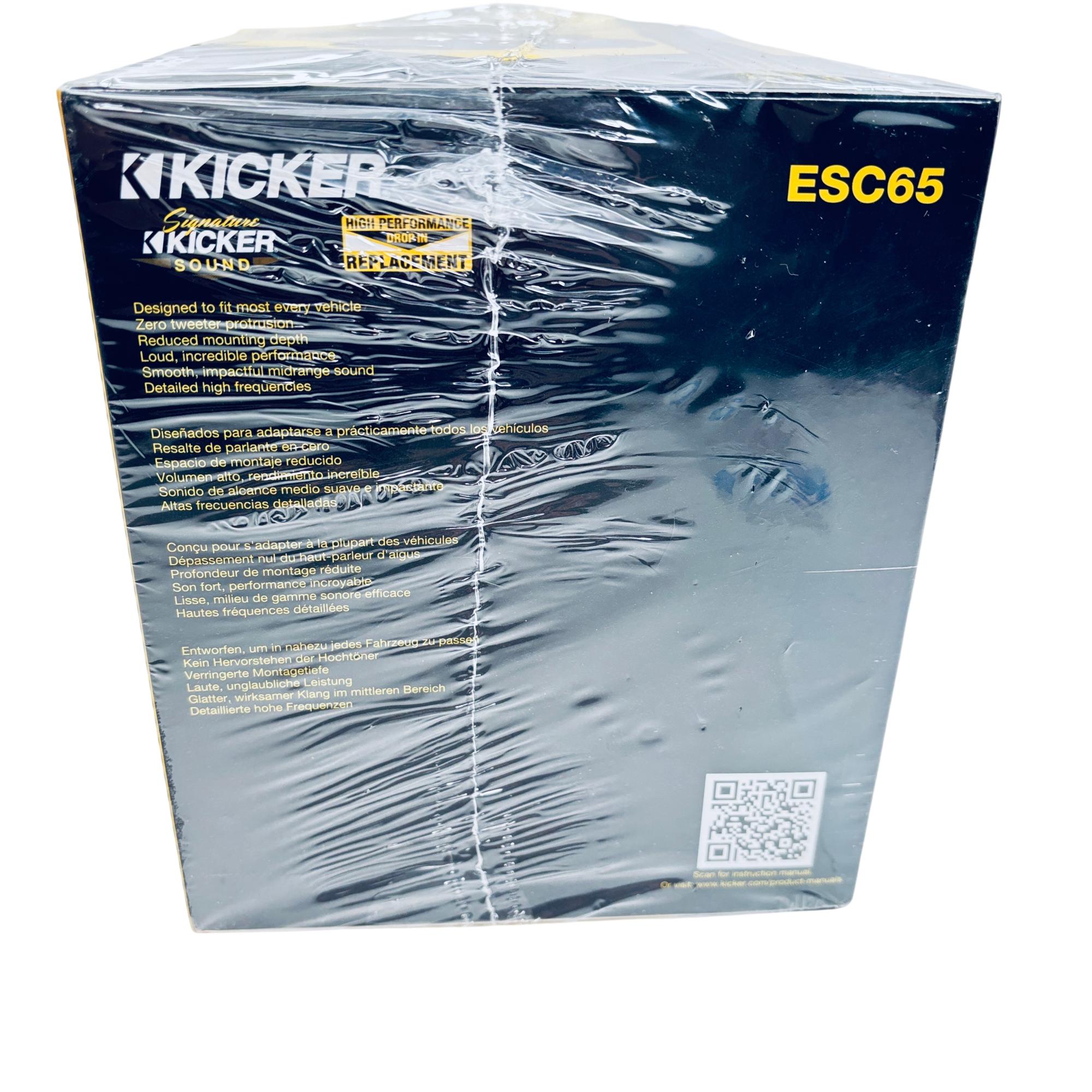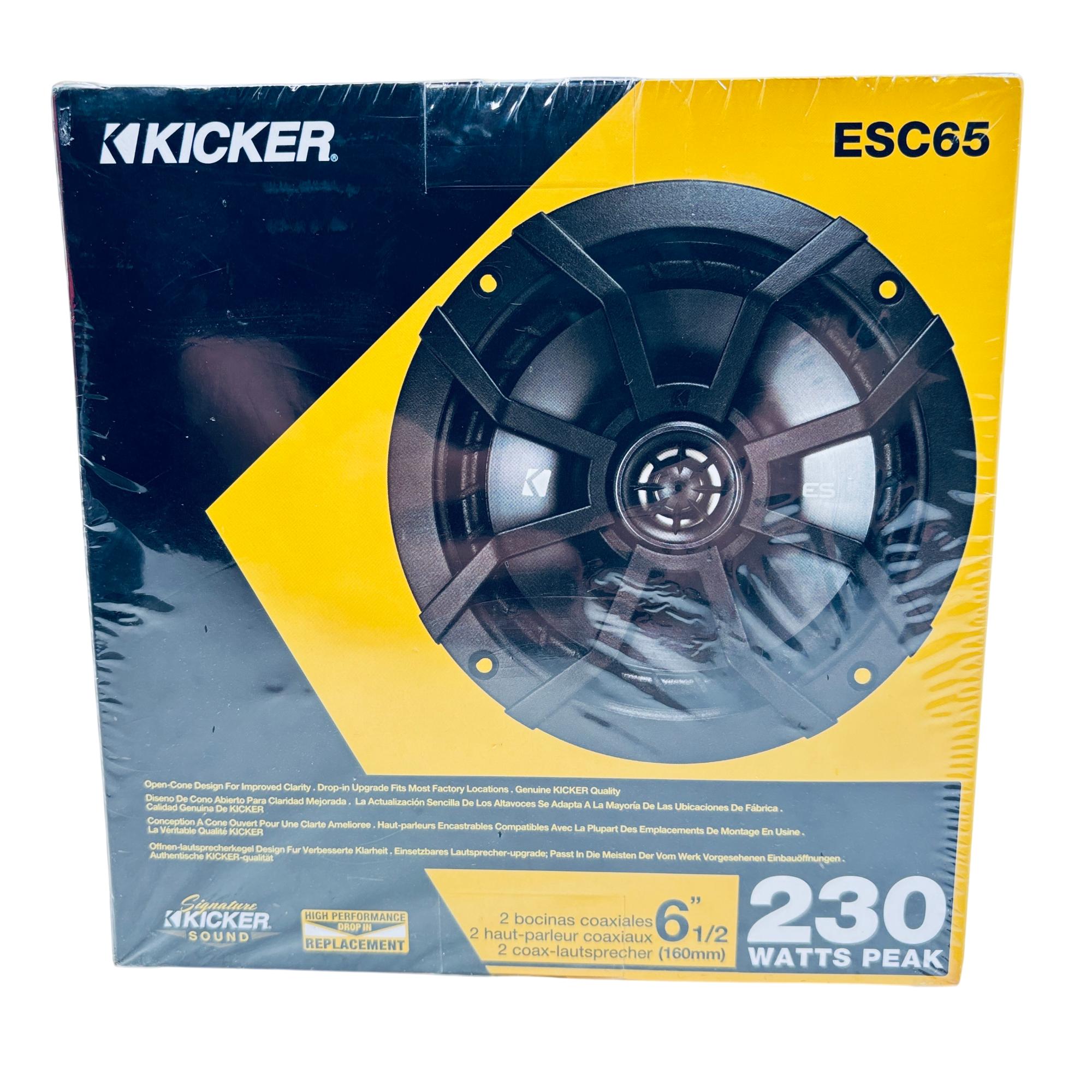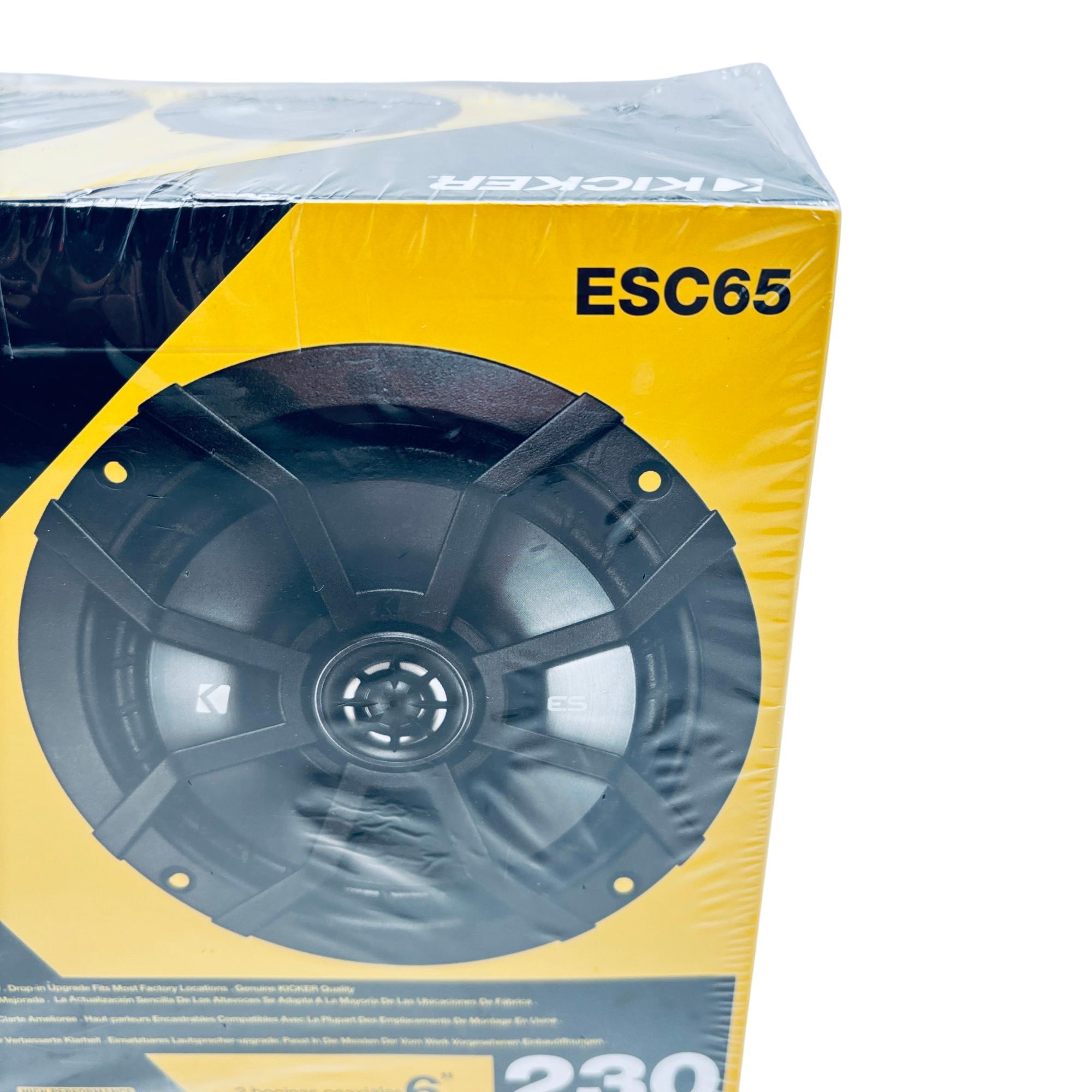 Kicker ESC65 6.5-Inch (160mm) 2-Way Coaxial Car Speakers deliver high performance with a recommended amplifier power range of 15 to 55 watts RMS and peak power handling of 230 watts. These speakers feature a 6.5-inch woofer and a 0.5-inch tweeter designed to provide a frequency response from 40 Hz to 20 kHz, ensuring clear and detailed sound reproduction for car audio systems.