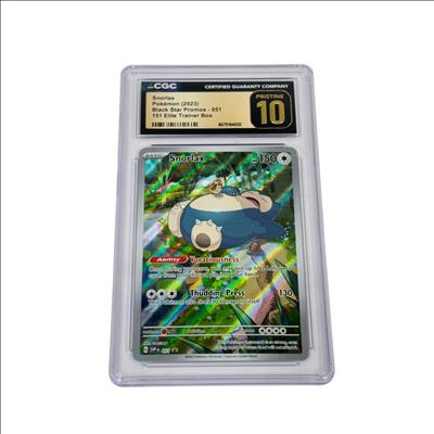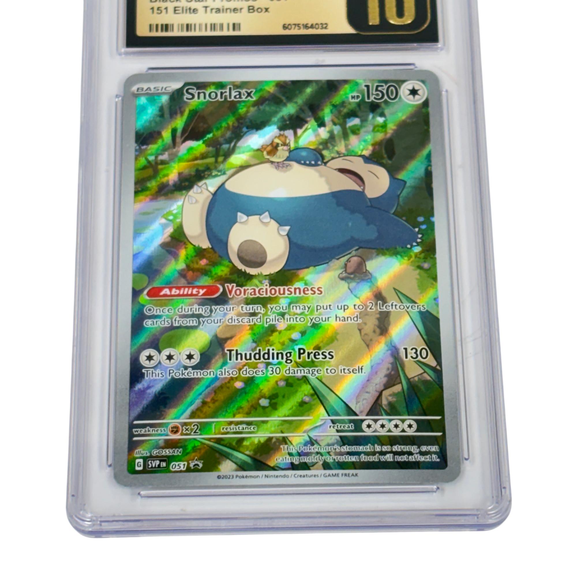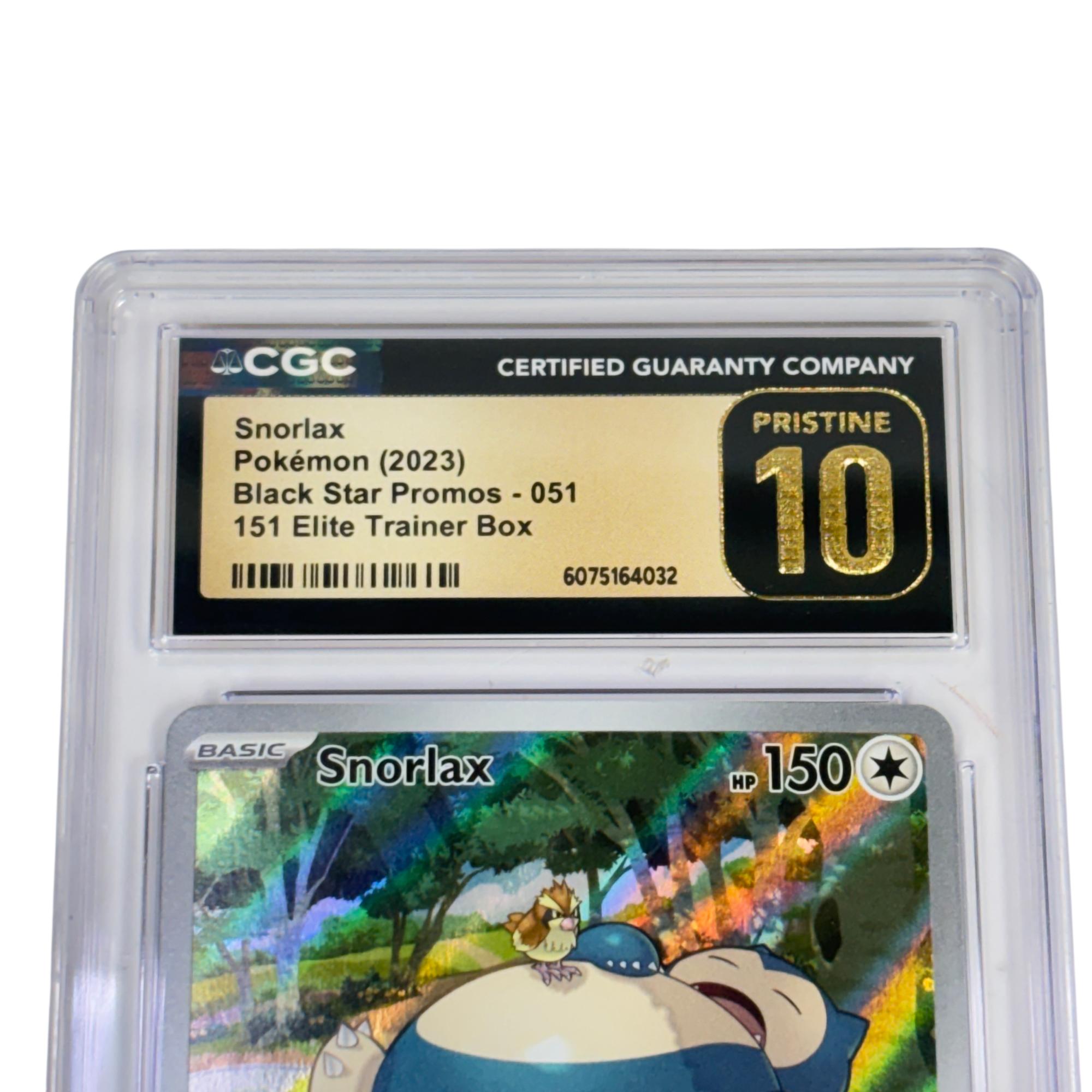 This CGC Pristine 10 Snorlax Black Star Promos 051 Pokémon (2023) 151 Elite Trainer Box features a highly detailed Snorlax card with 150 HP and the ability Voraciousness. This ultra-rare promo card from the 2023 Pokémon collection showcases premium artwork and distinct game stats, making it a valuable addition for collectors and competitive players alike. Its Black Star Promos numbering and pristine grading highlight its exceptional condition and authenticity.