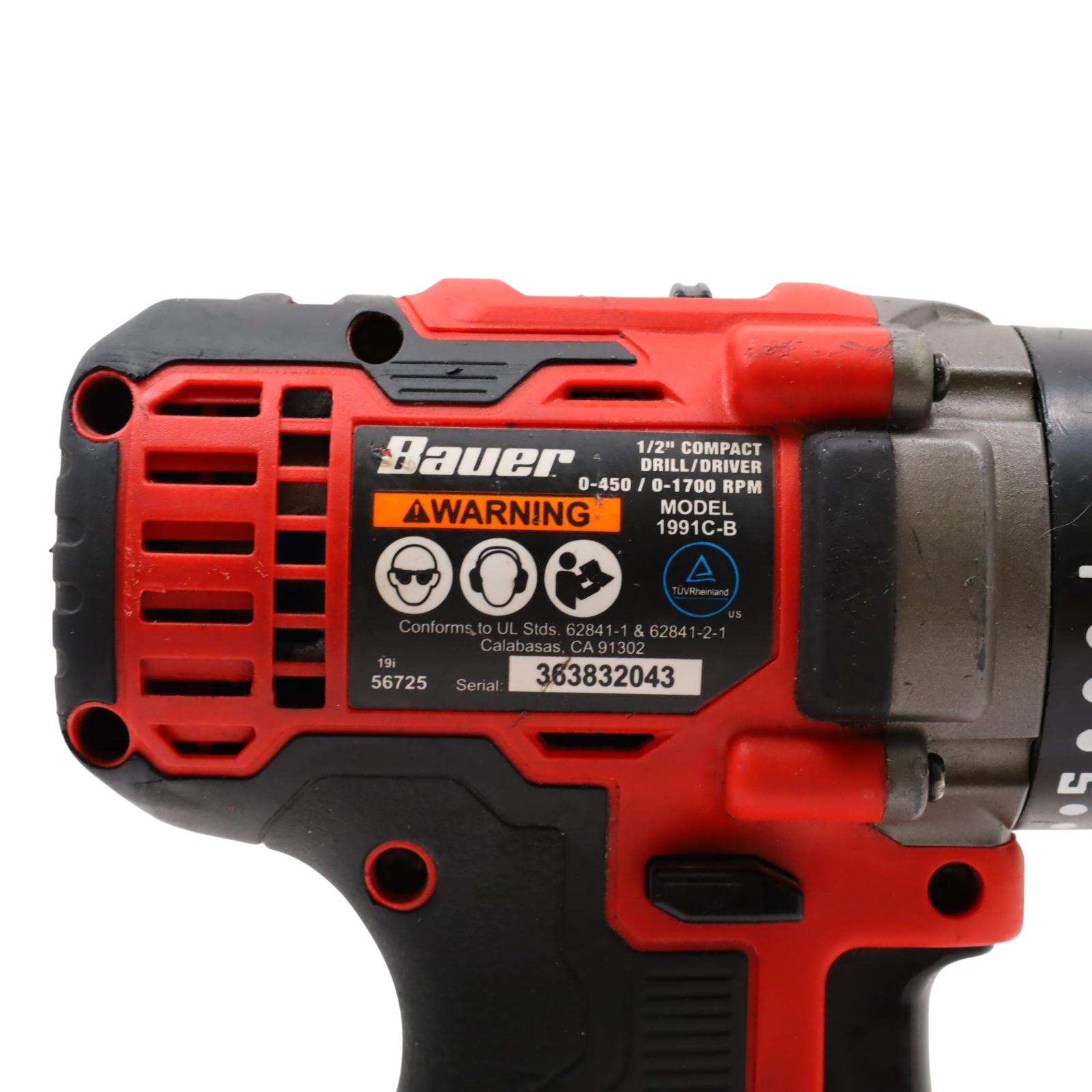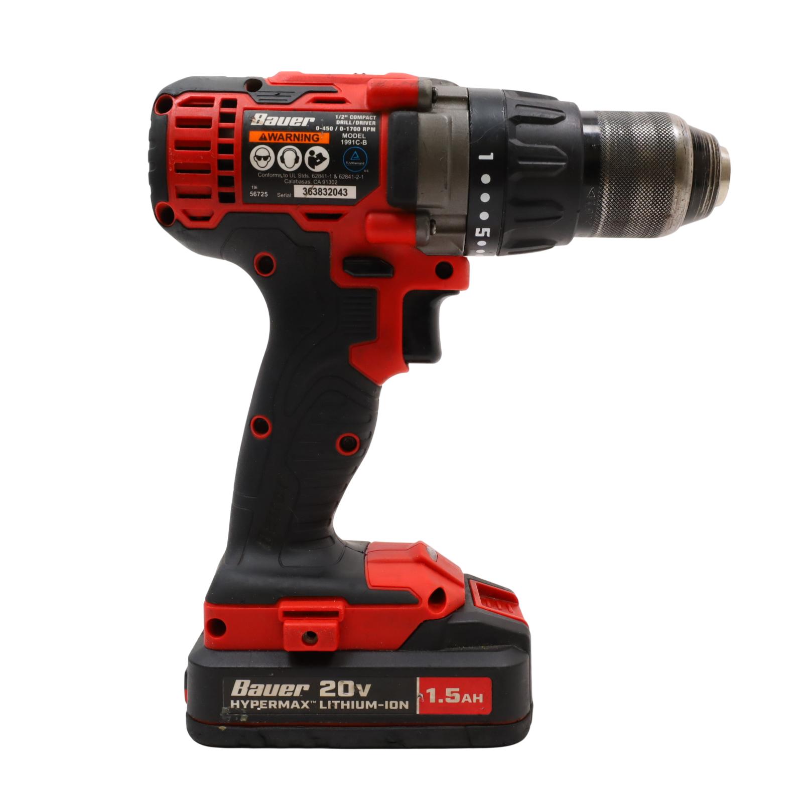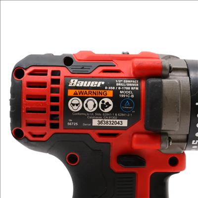 Designed for driving fasteners into various materials and offers robust performance for frequent use thanks to its all-metal gear construction. It features a 1/2 inch keyless chuck for easy bit changes and a two-speed selector, allowing adjustment between 450 and 1700 RPM to suit the task. The drill incorporates a compact, lightweight design with a textured grip for user comfort, and includes an LED spotlight to improve visibility in low-light conditions, delivering up to 450 inch-pounds of torque.