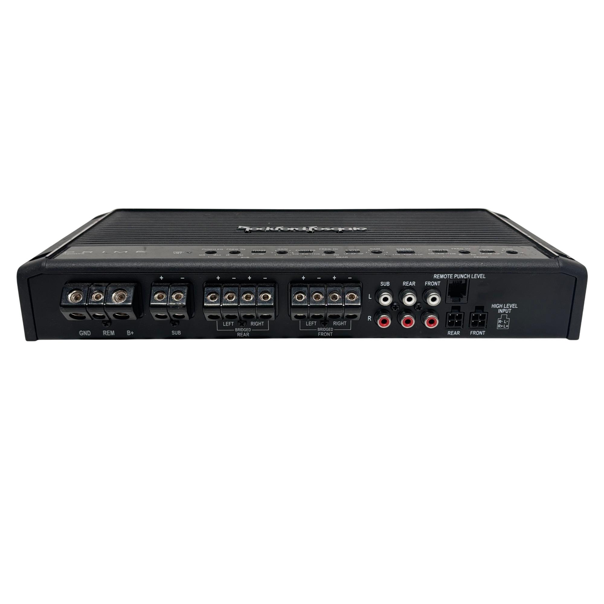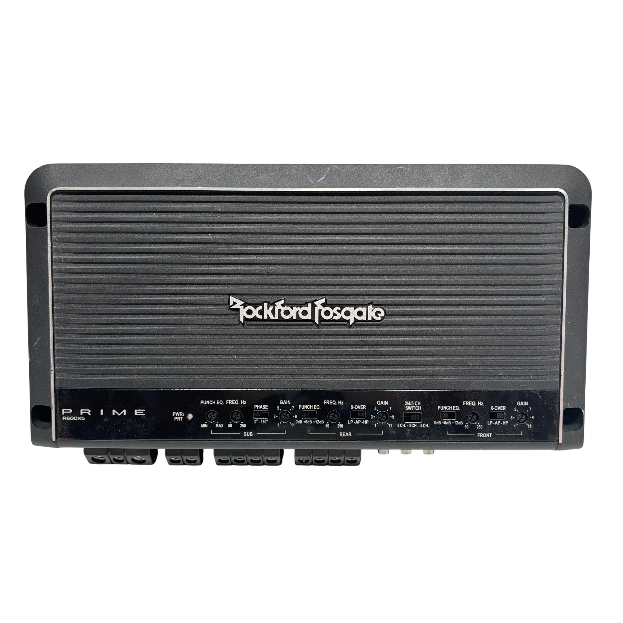 Rockford Fosgate R600X5 Prime 5-Channel Car Amplifier delivers a powerful 600 watts RMS output with advanced Punch EQ and flexible crossover settings. This Class AB amplifier features adjustable frequency and gain controls, supporting 2, 4, or 5-channel configurations for versatile car audio system integration. Designed for clear, dynamic sound enhancement, it offers precision tuning tailored to high, mid, and low-frequency ranges.