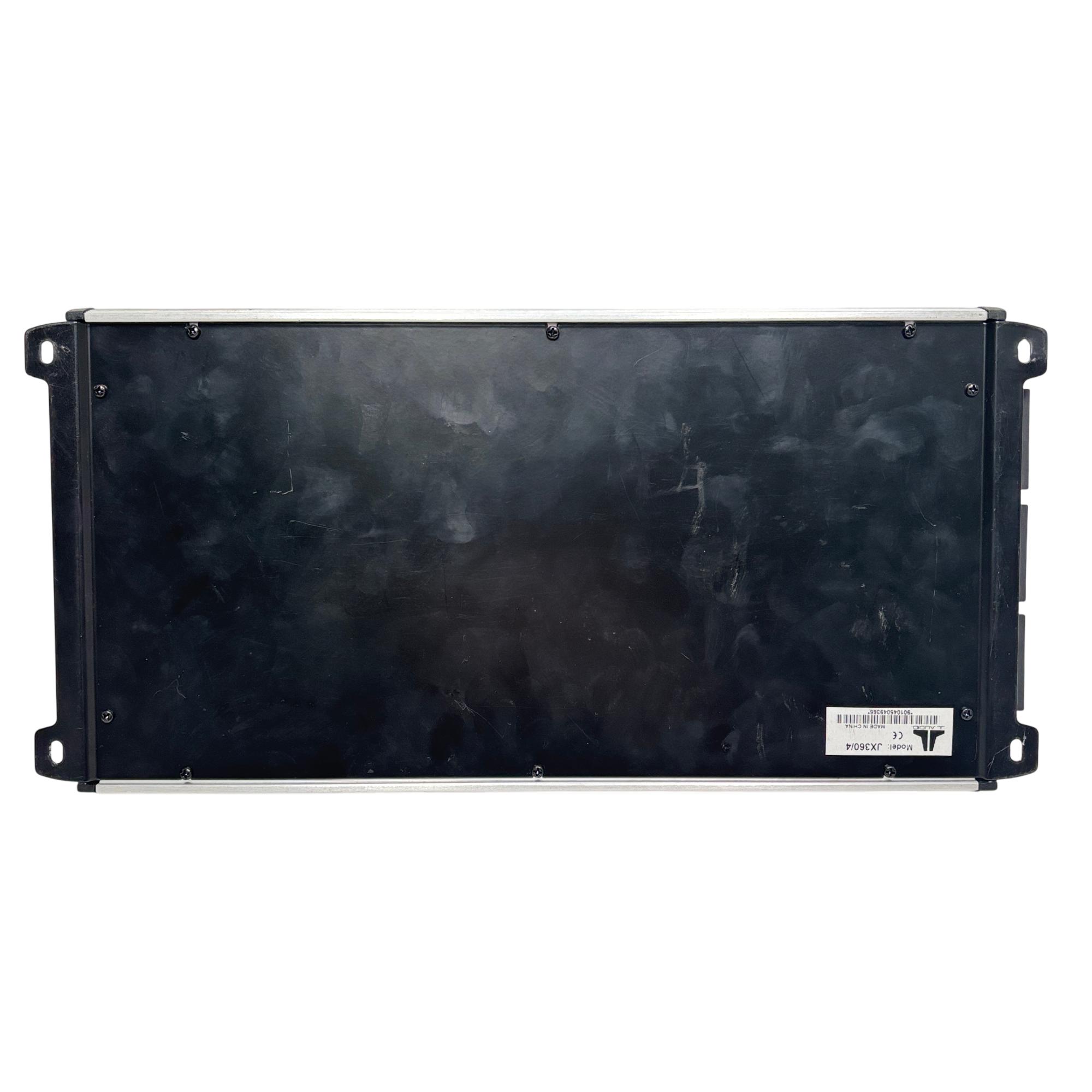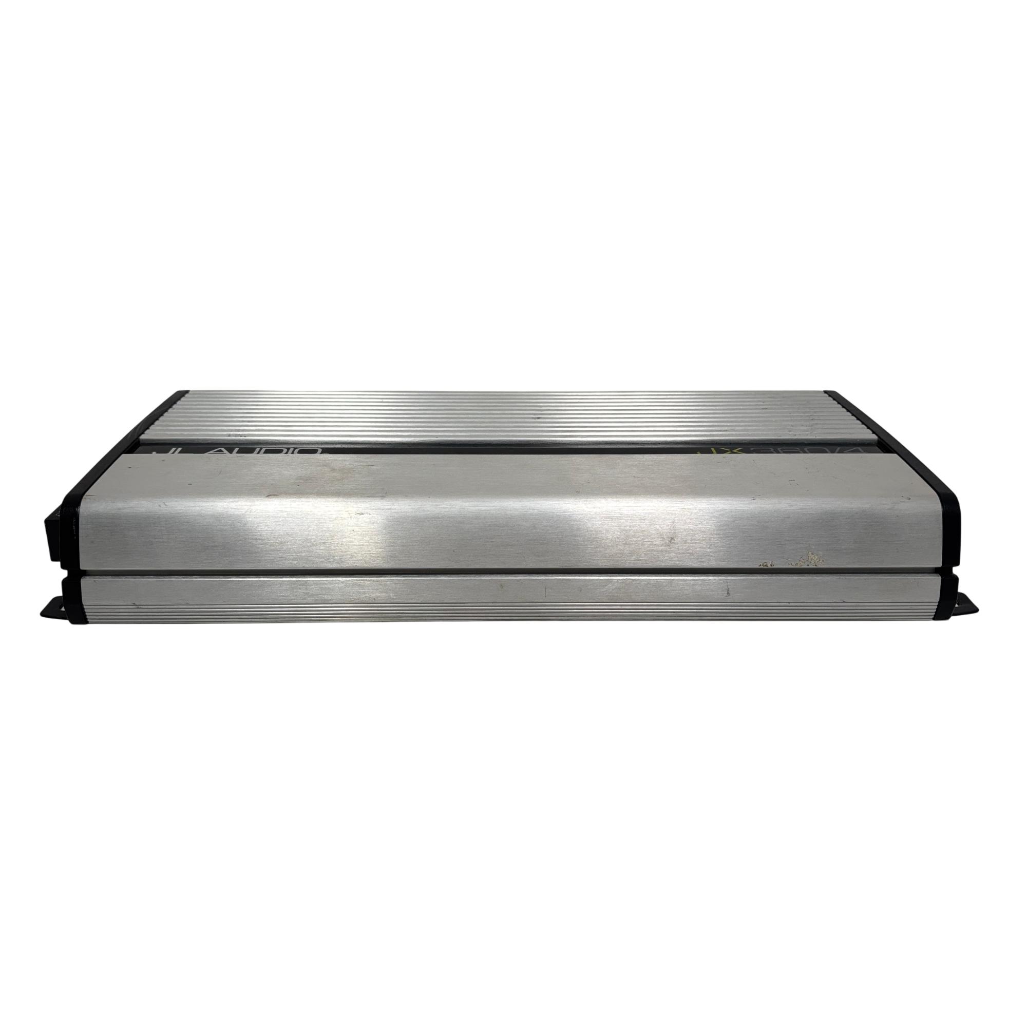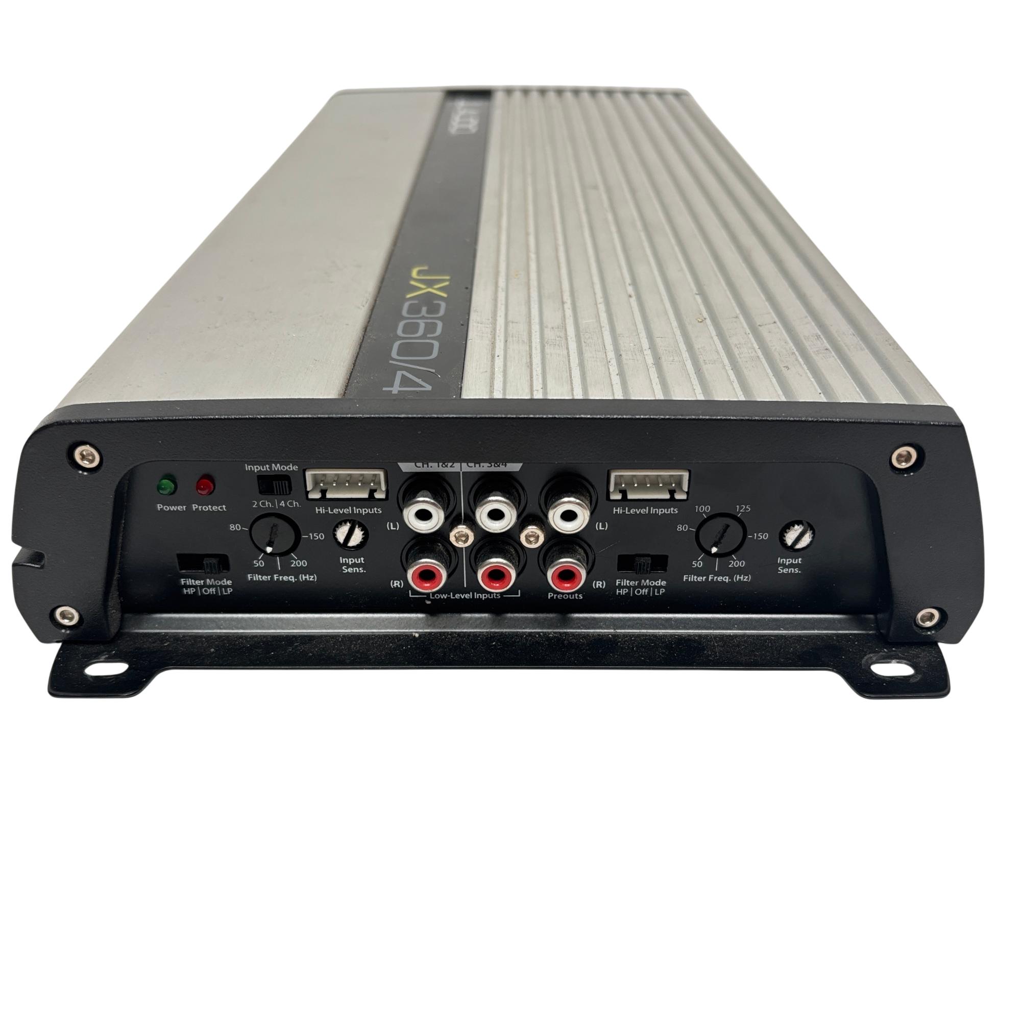 JL Audio JX360/4 360W 4-Channel Class A/B Car Amplifier delivers high-quality audio performance with a robust Class A/B design, providing clear and dynamic sound output. This silver rectangular amplifier features distinct black edges and stripes, designed to fit seamlessly into automotive audio systems while ensuring efficient power distribution across four channels.
