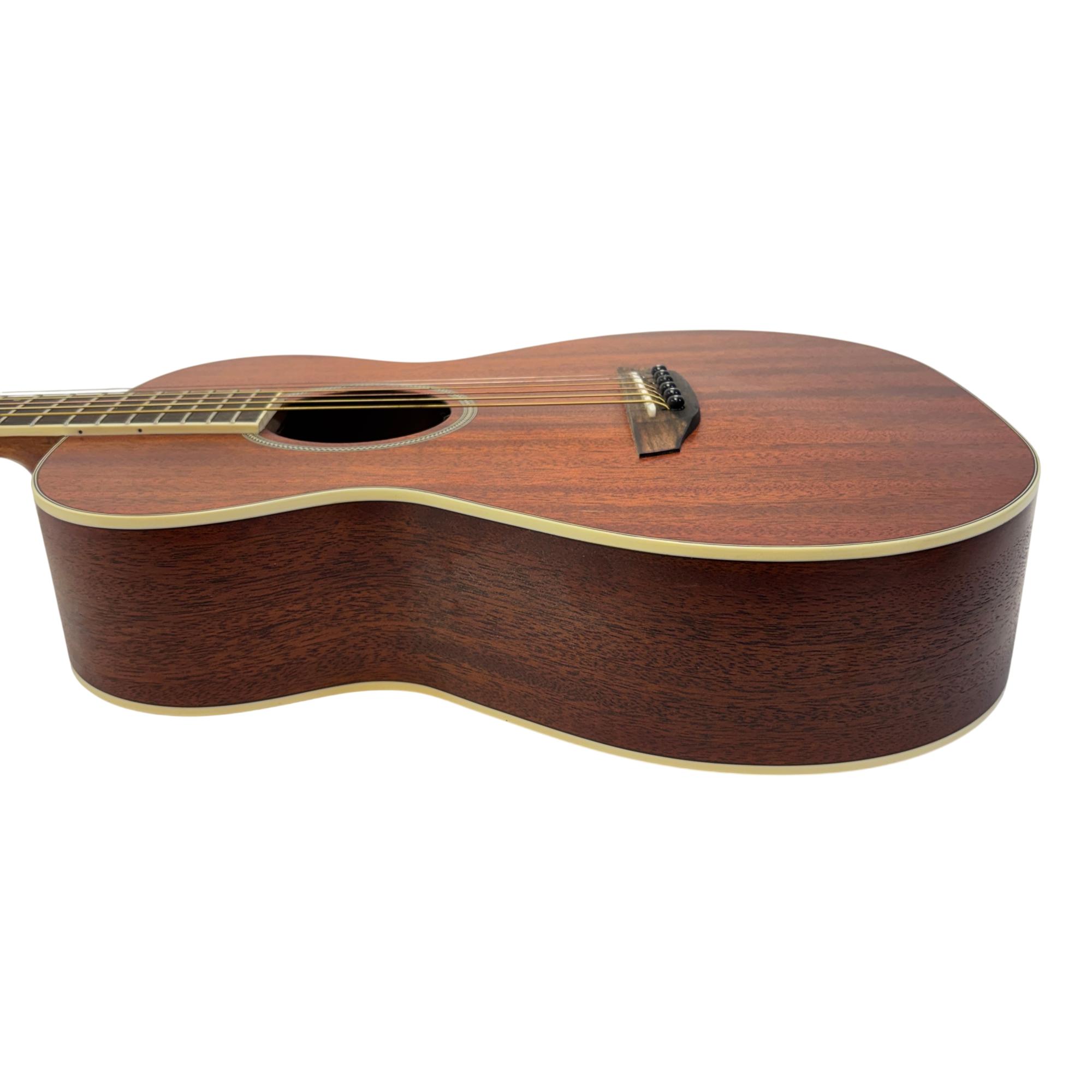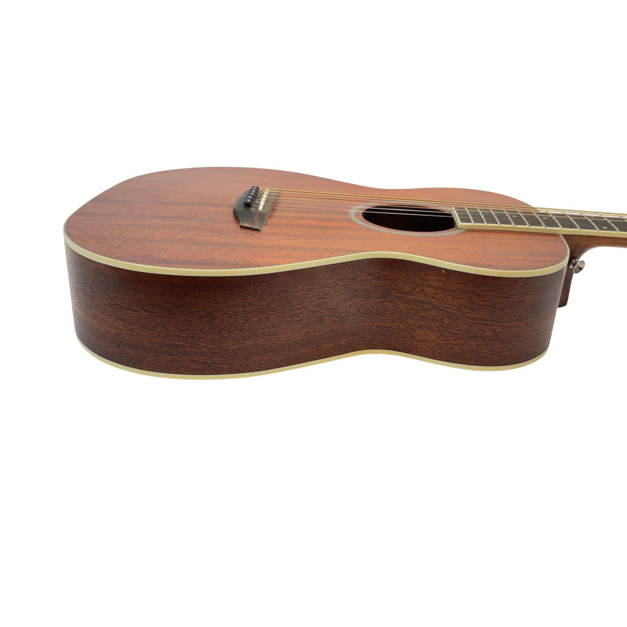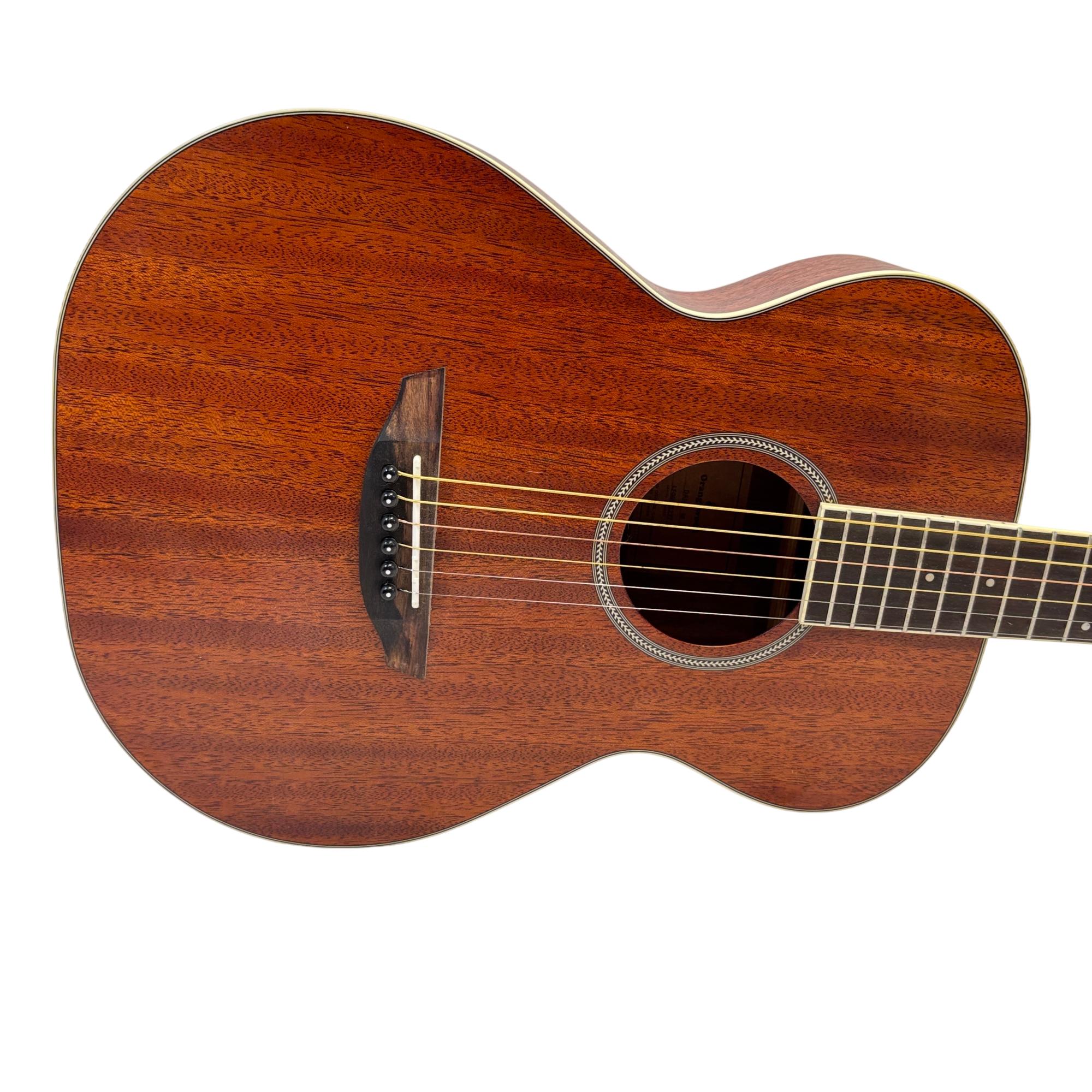 Orangewood Dana Mahogany Mini Travel Acoustic Guitar features a layered mahogany top known for delivering warm, balanced tones ideal for travel and practice. Its compact design and quality craftsmanship make this guitar a reliable choice for musicians seeking portability without sacrificing sound performance.