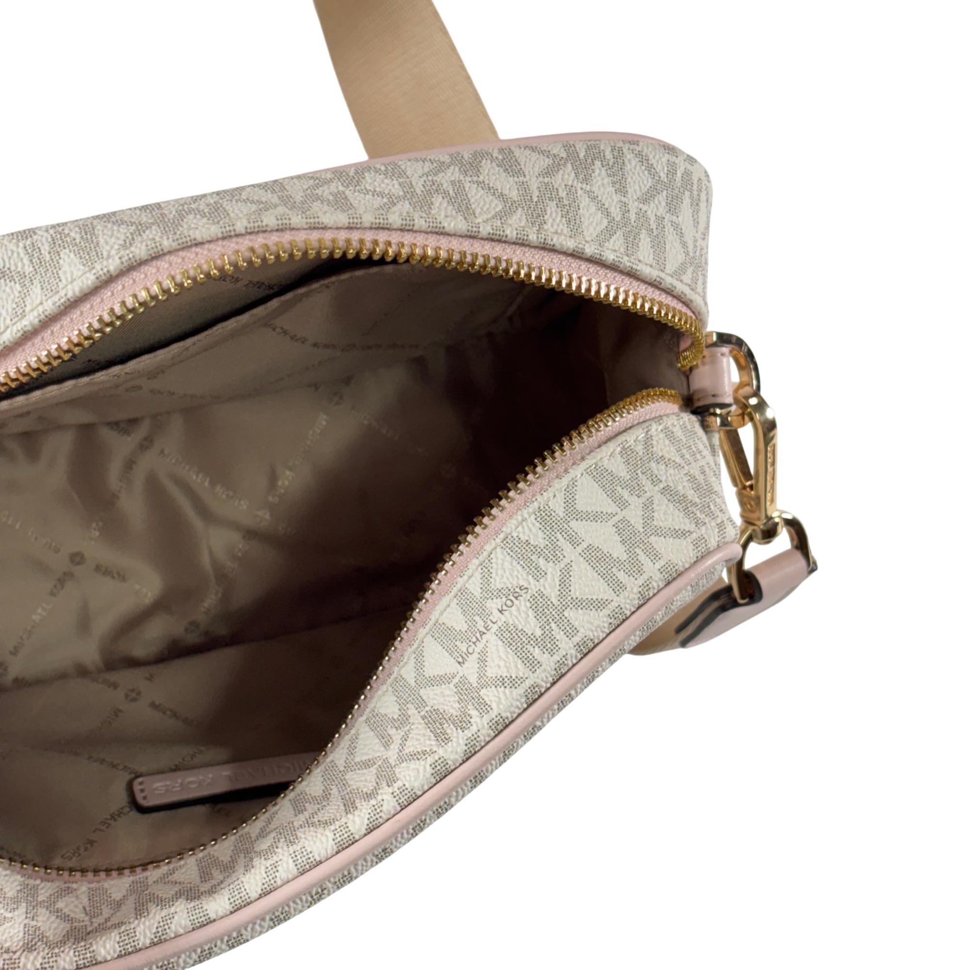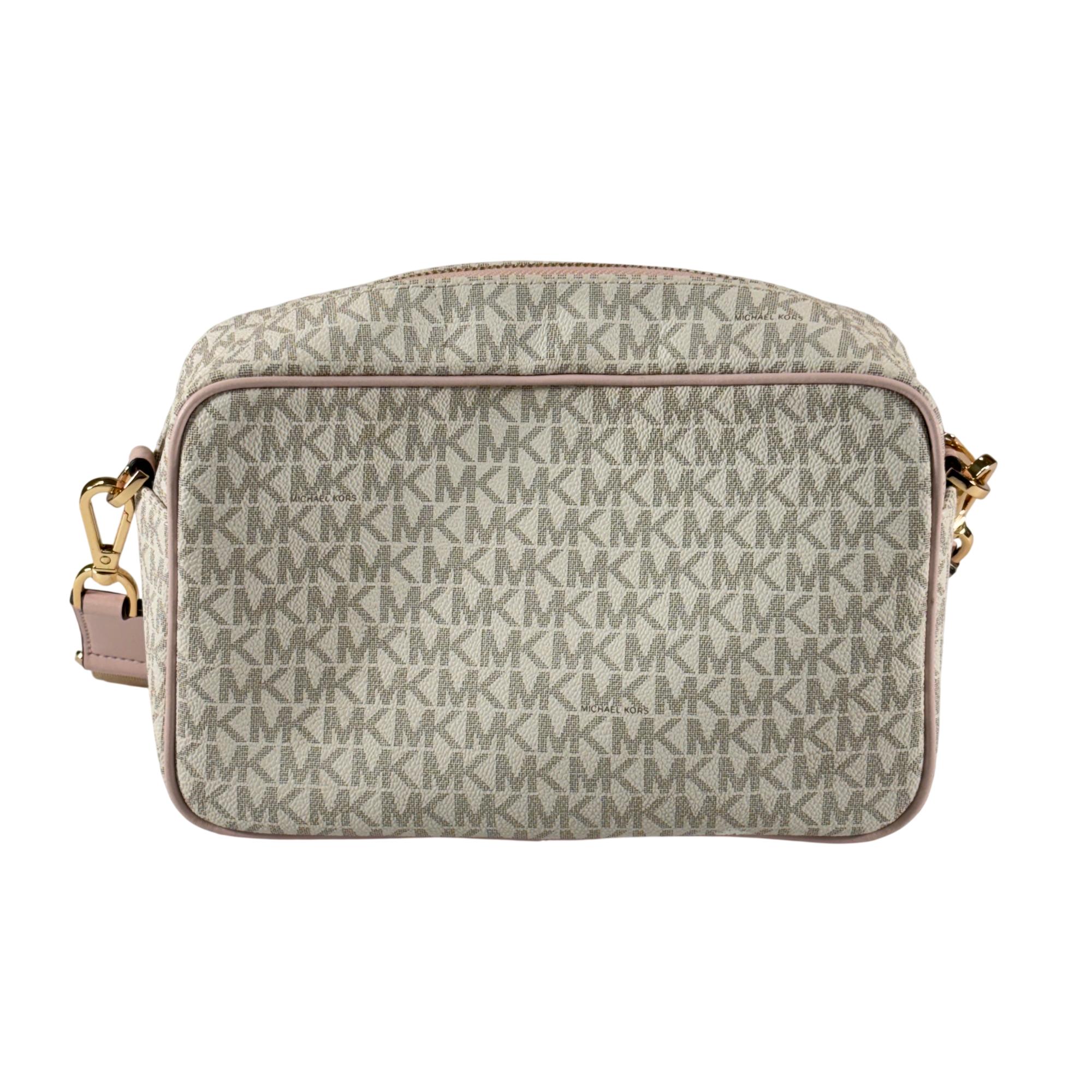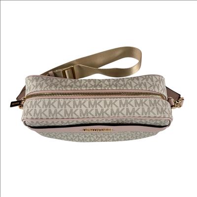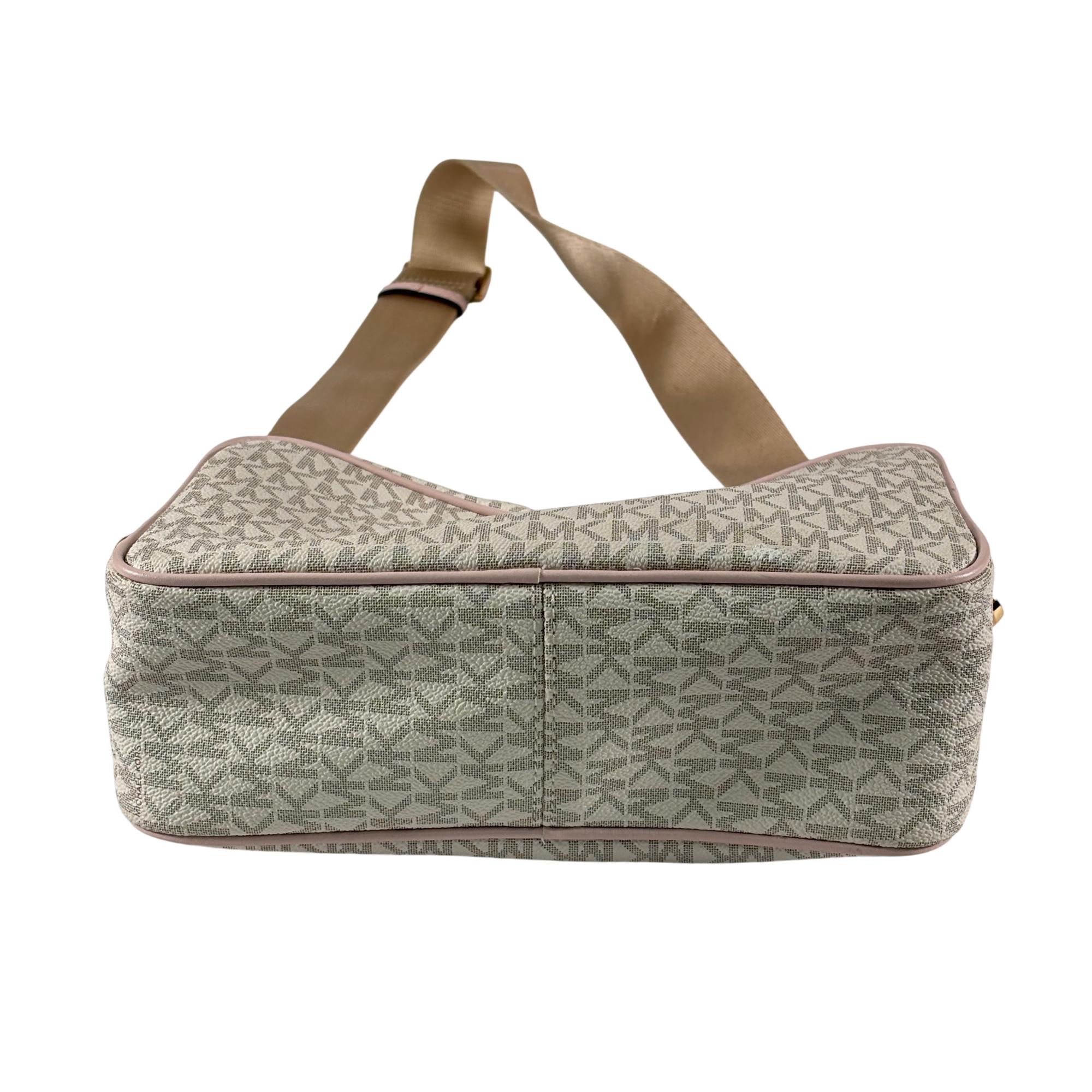 Michael Kors Kenly large logo pocket crossbody bag crafted from logo-print coated canvas with gold-tone hardware. It features a front snap pocket, interior slip and zip pockets, and a zip closure. Measuring 9.75" W x 6" H x 3.75" D, it has an adjustable 14–25" strap for versatile wear and a durable polyester lining.