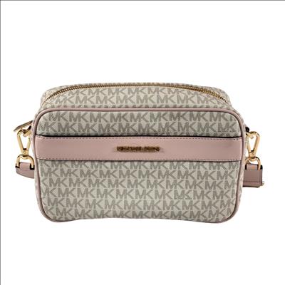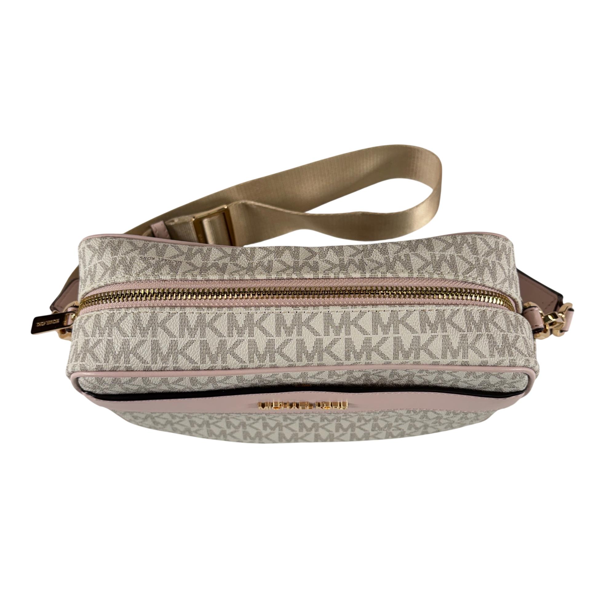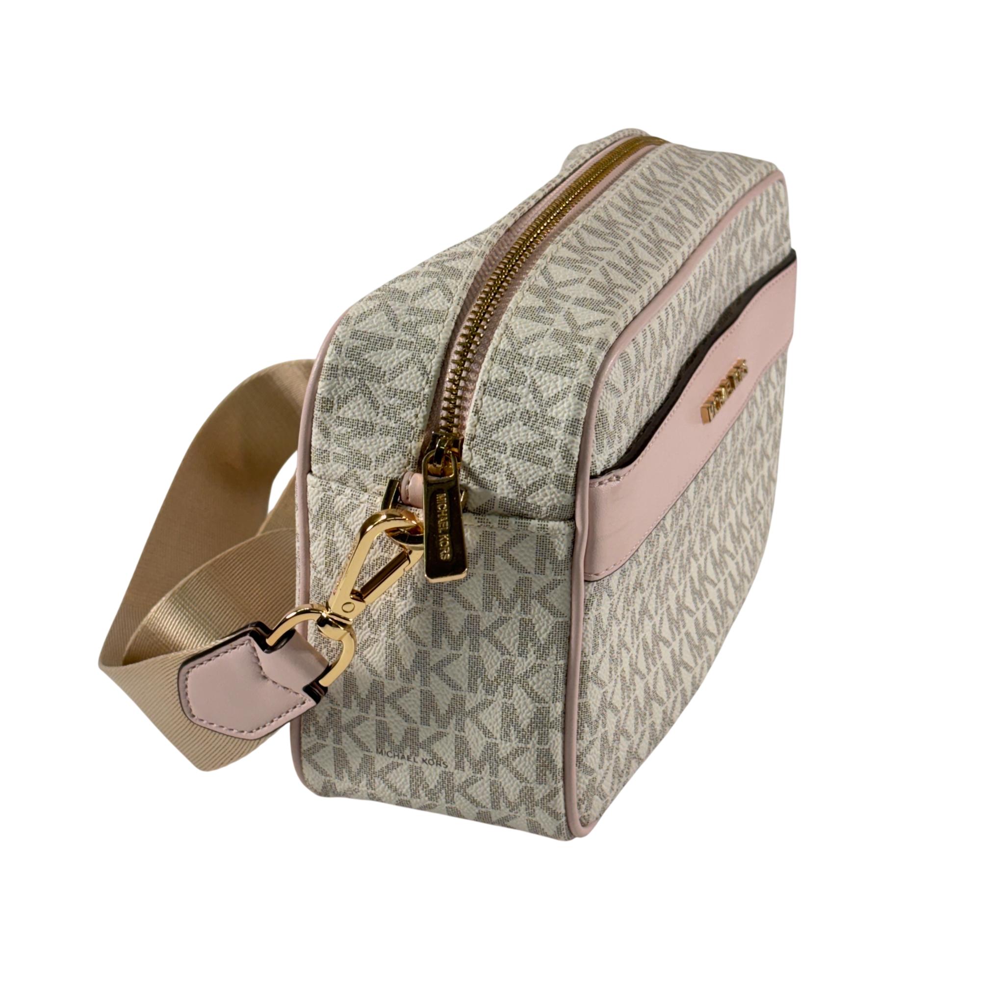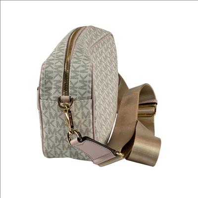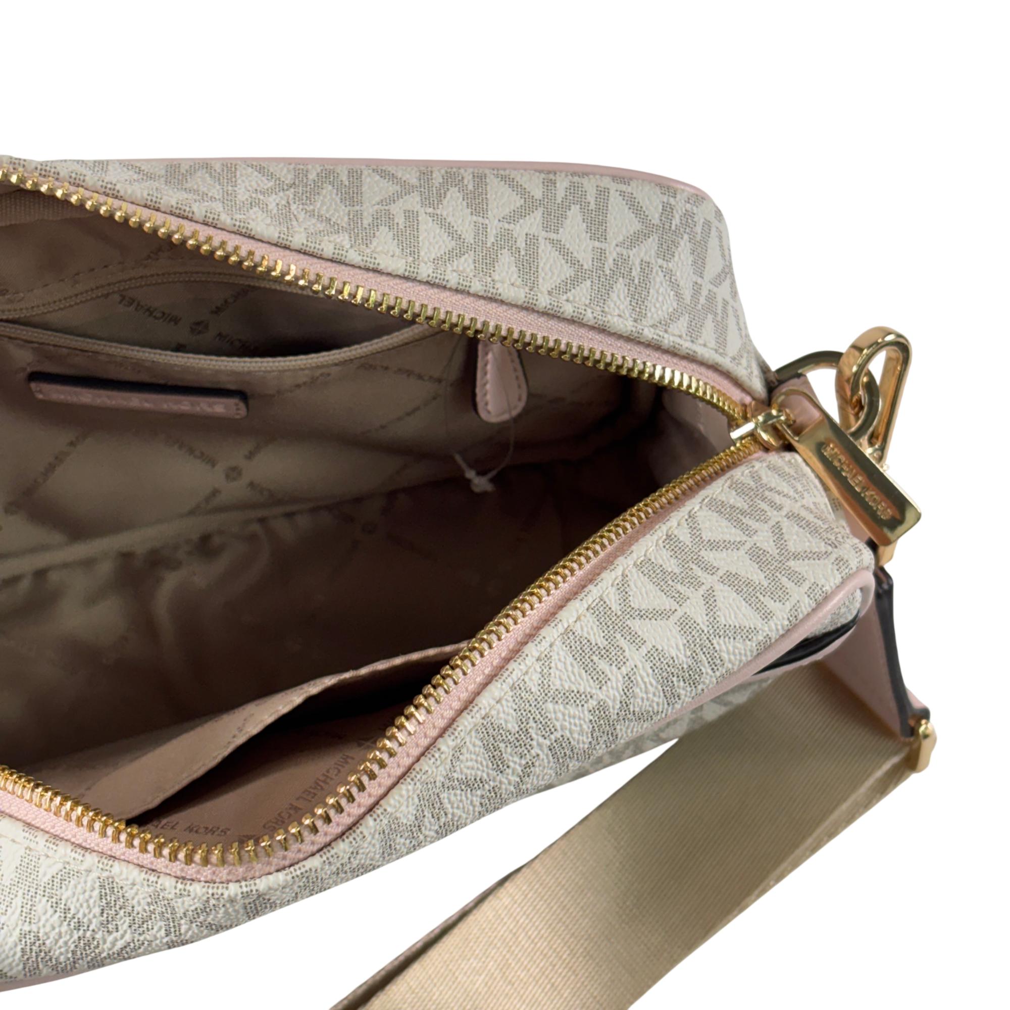 Michael Kors Kenly large logo pocket crossbody bag crafted from logo-print coated canvas with gold-tone hardware. It features a front snap pocket, interior slip and zip pockets, and a zip closure. Measuring 9.75" W x 6" H x 3.75" D, it has an adjustable 14–25" strap for versatile wear and a durable polyester lining.