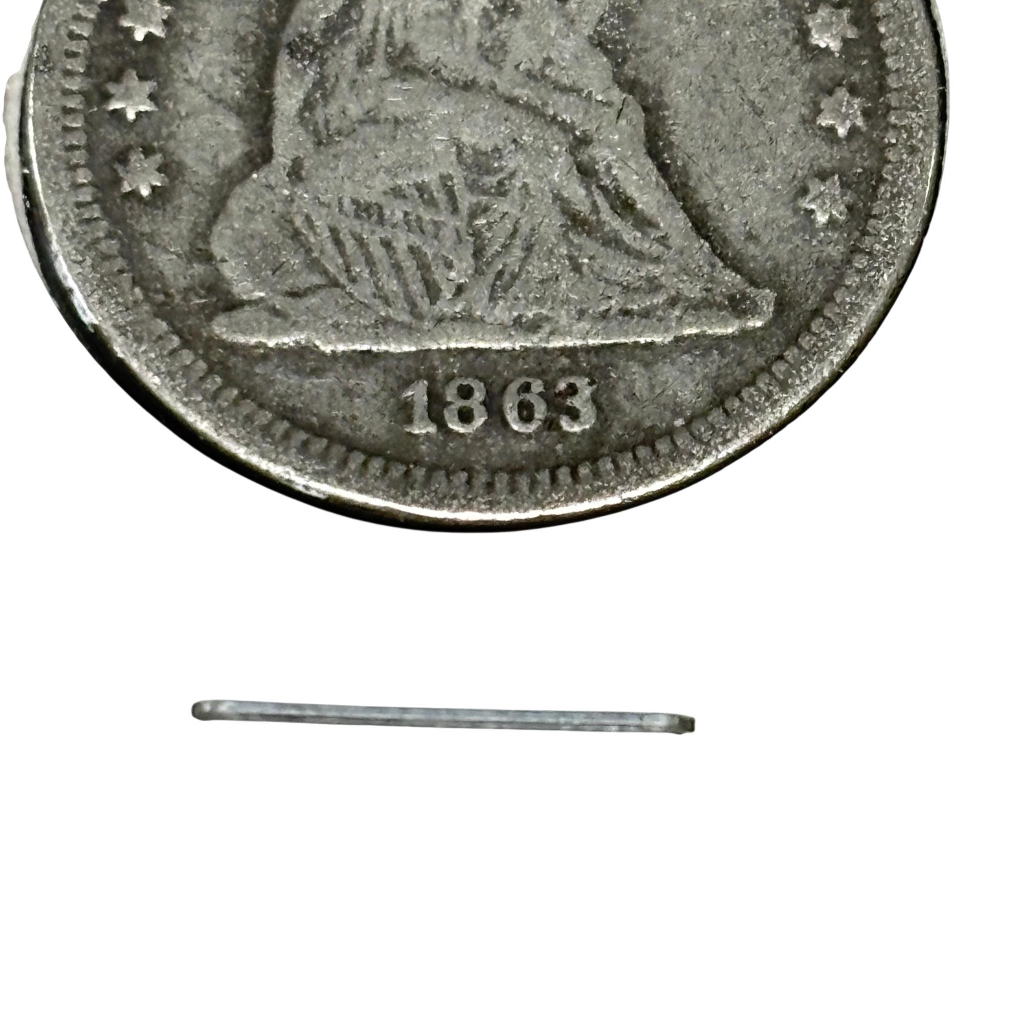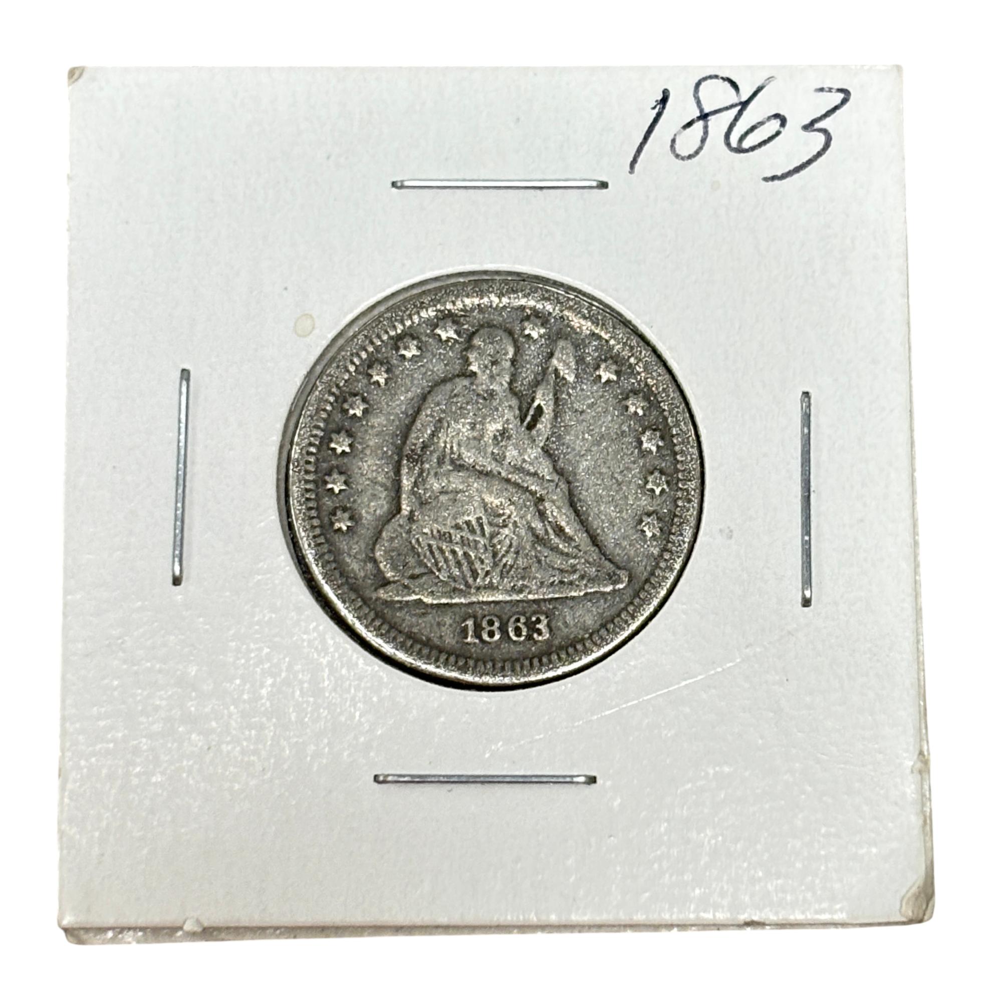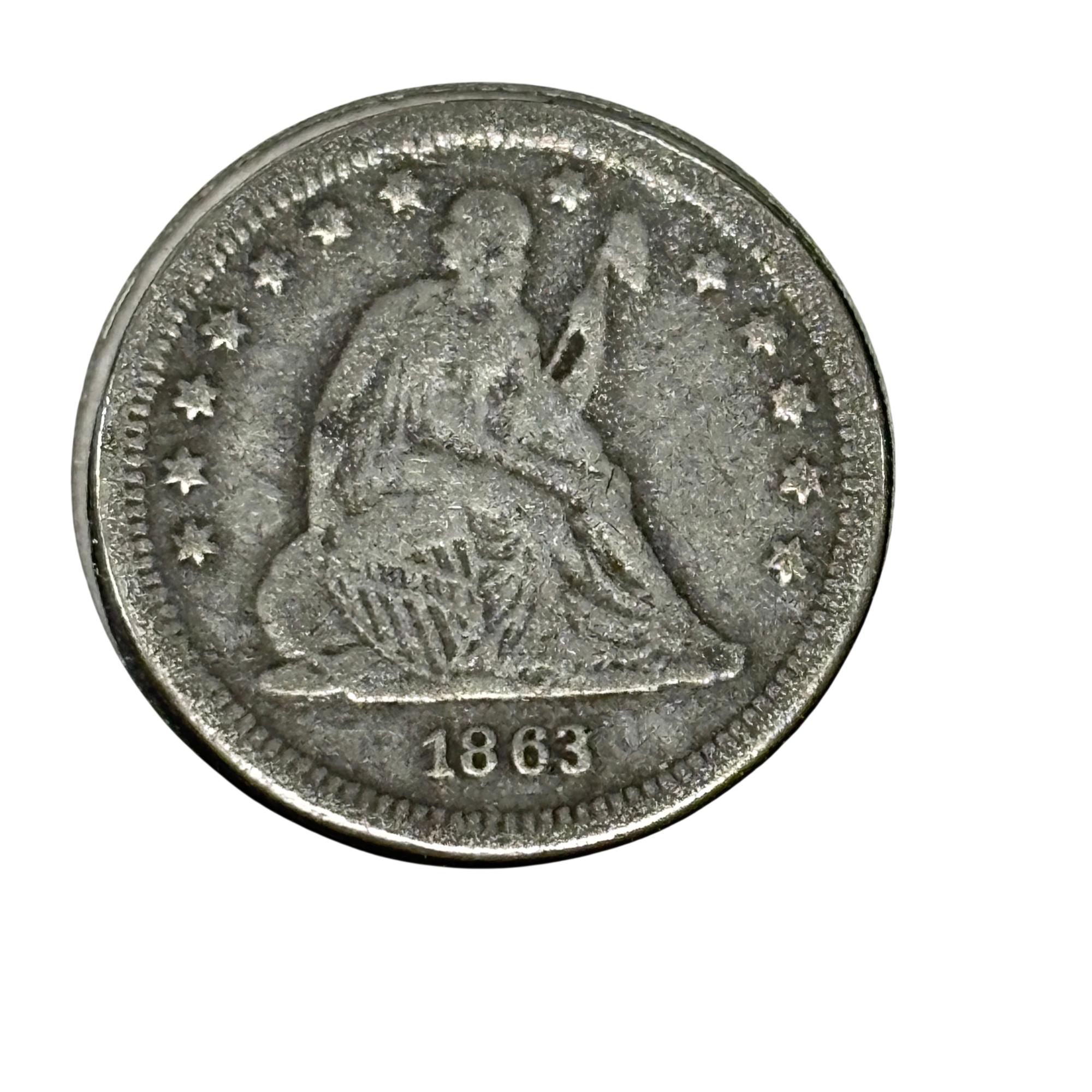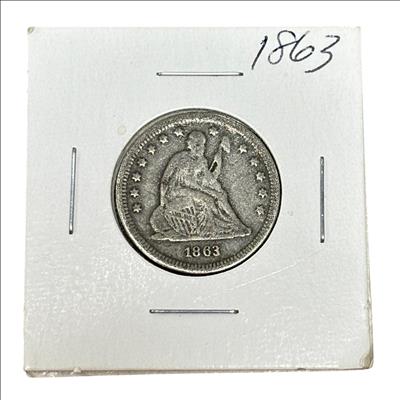 This 1863 Seated Liberty Quarter Dollar Coin (United States Mint) features a detailed seated figure of Liberty on the obverse side, symbolizing freedom and strength. This historic silver coin from the Civil War era displays the date 1863 prominently beneath Liberty, with intricate engraving that highlights the craftsmanship of 19th-century United States coinage. Its round, metallic design makes it a valuable piece for collectors and history enthusiasts alike.
