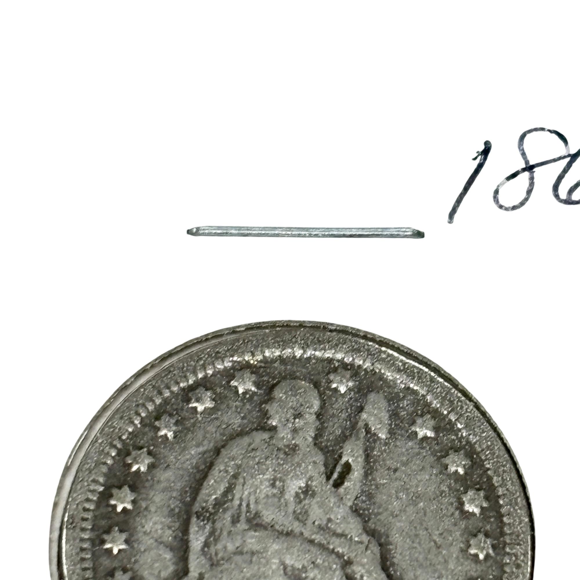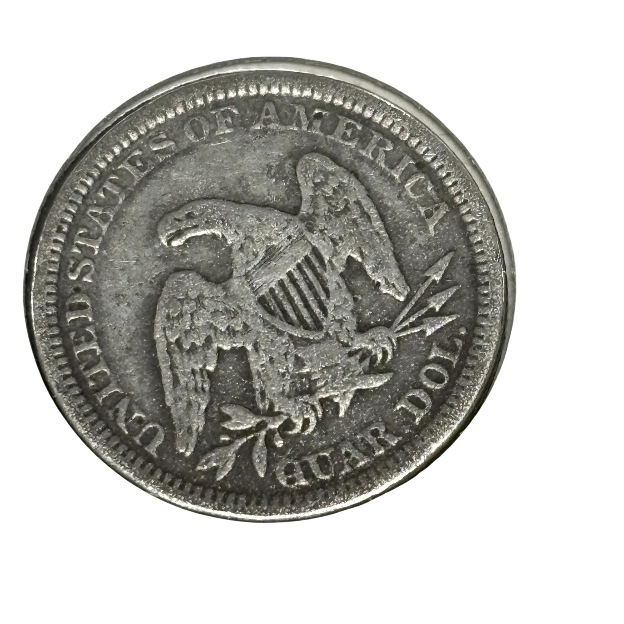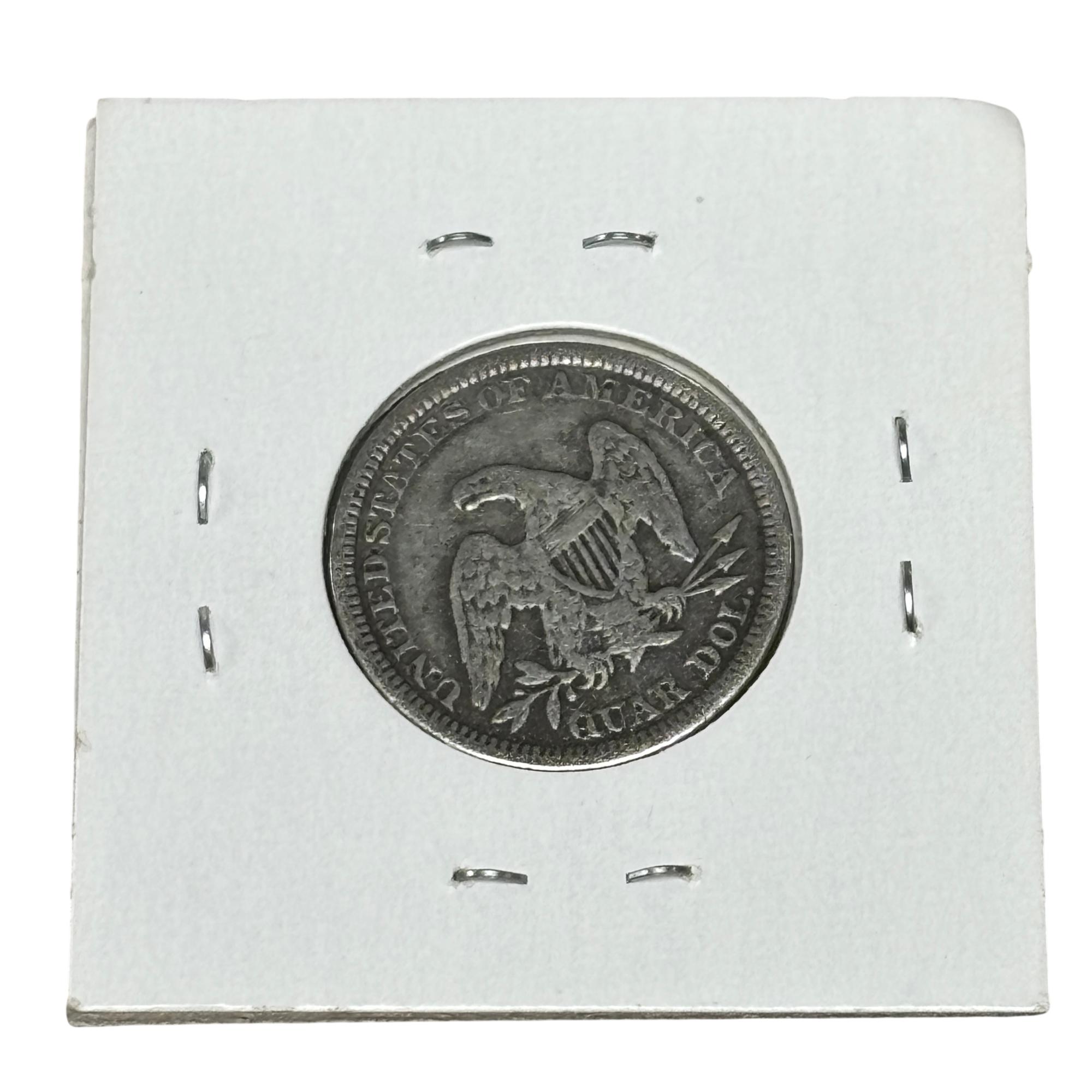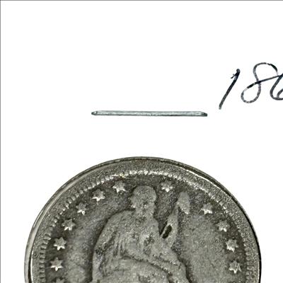 This 1863 Seated Liberty Quarter Dollar Coin (United States Mint) features a detailed seated figure of Liberty on the obverse side, symbolizing freedom and strength. This historic silver coin from the Civil War era displays the date 1863 prominently beneath Liberty, with intricate engraving that highlights the craftsmanship of 19th-century United States coinage. Its round, metallic design makes it a valuable piece for collectors and history enthusiasts alike.