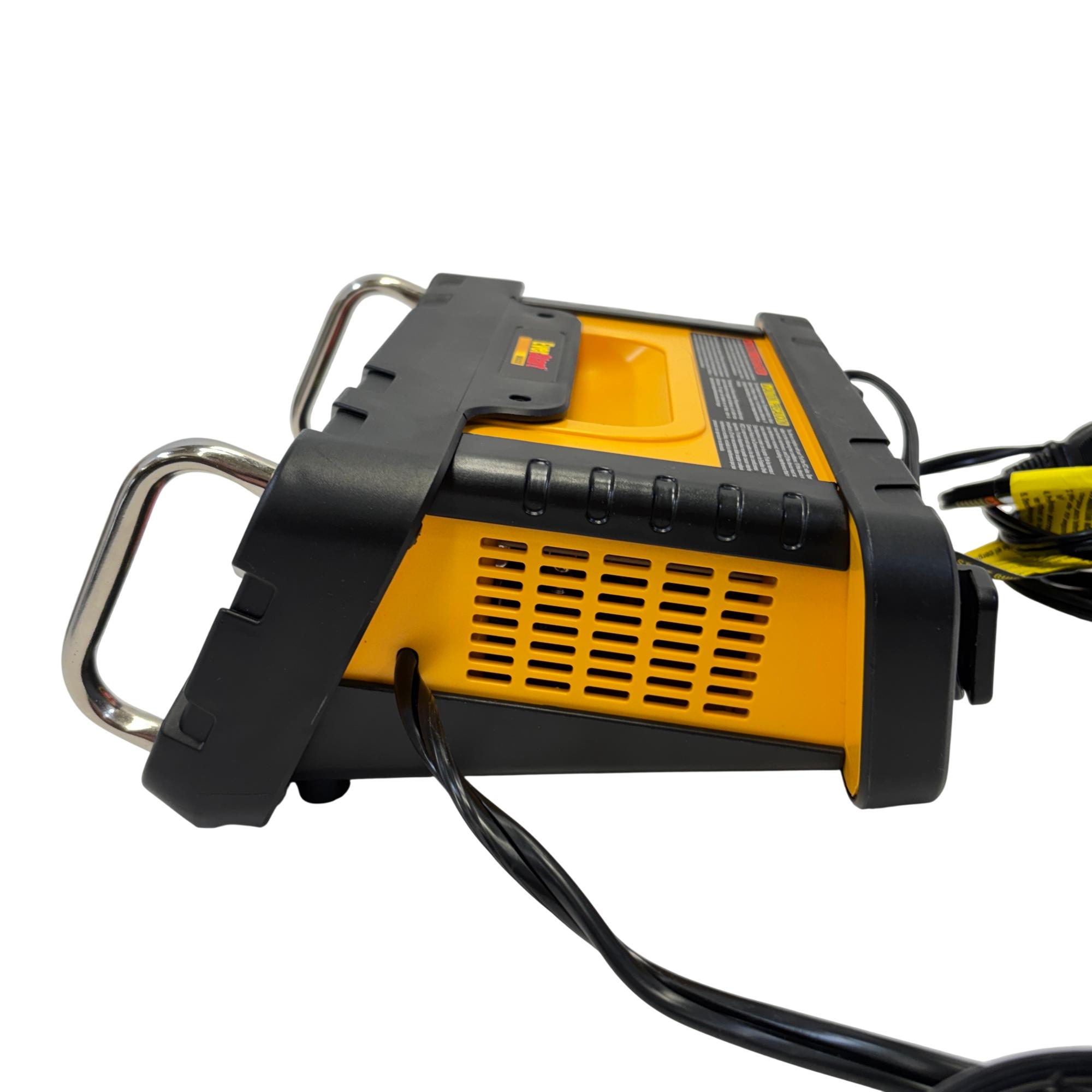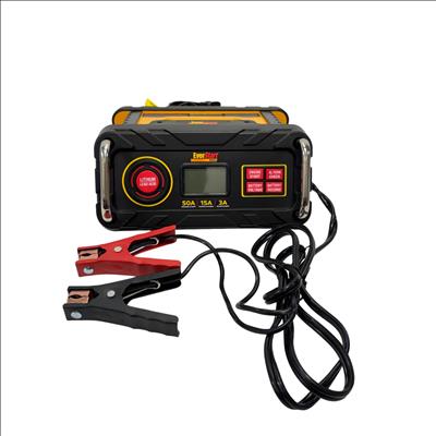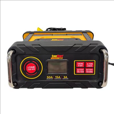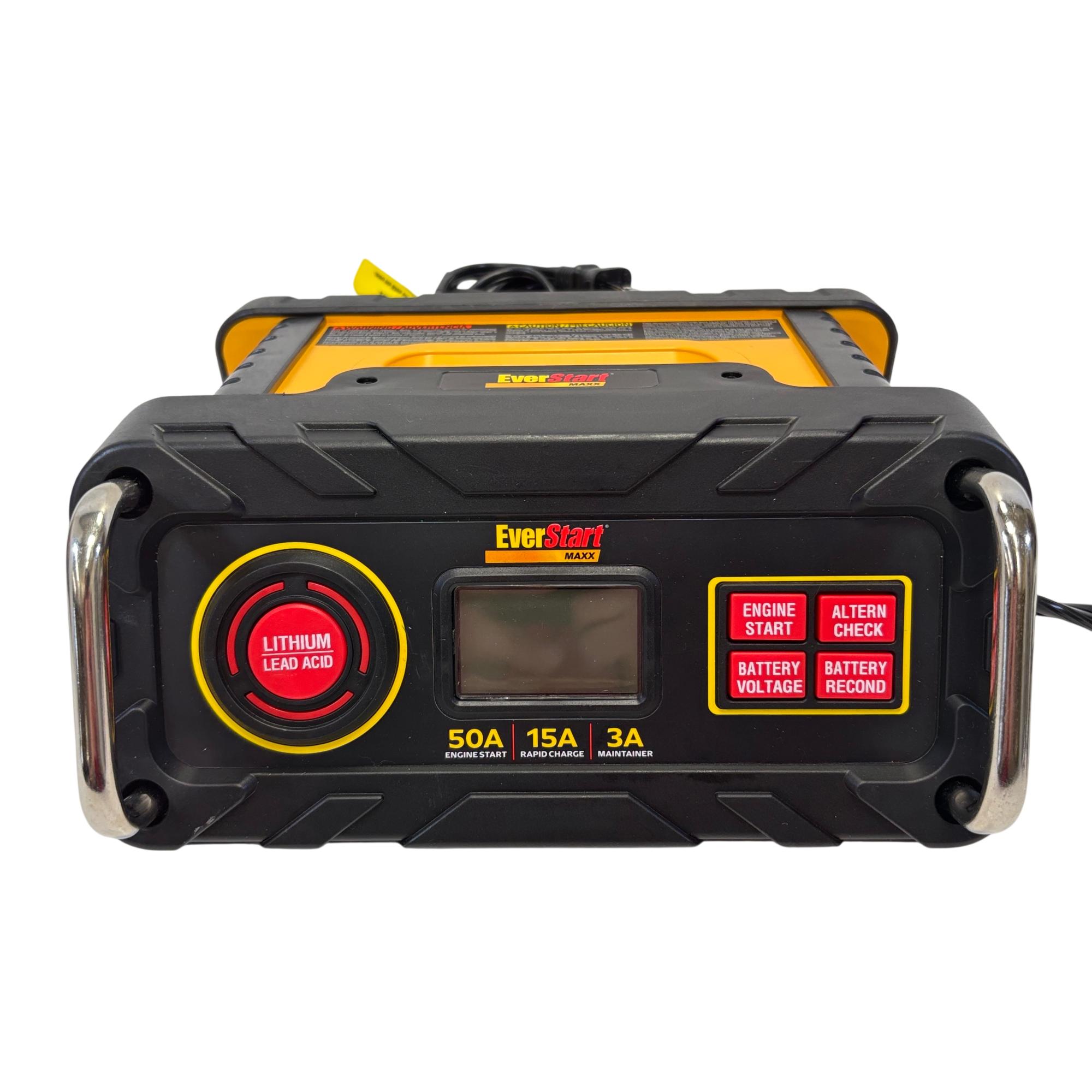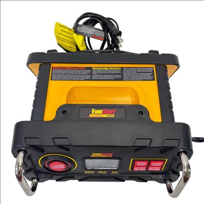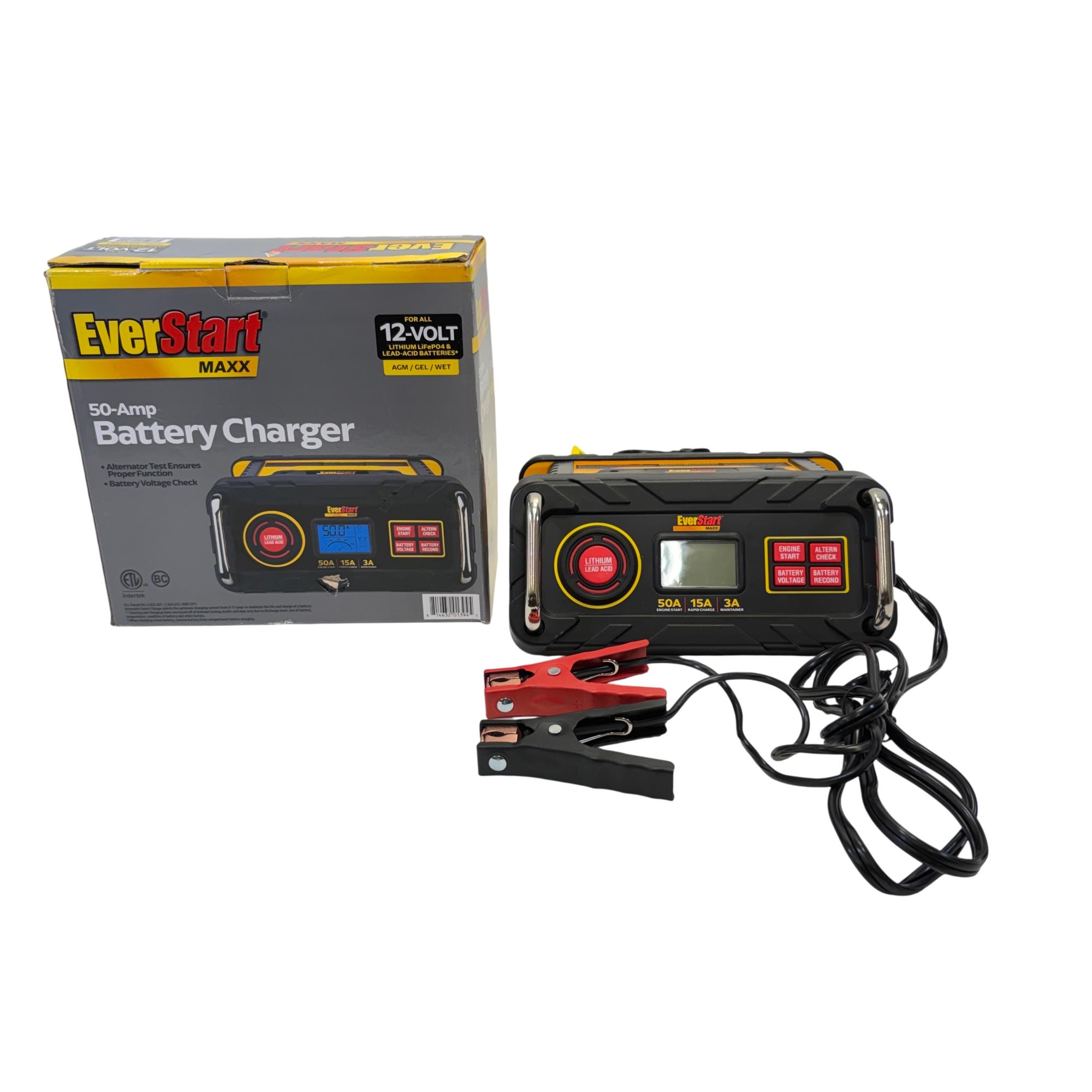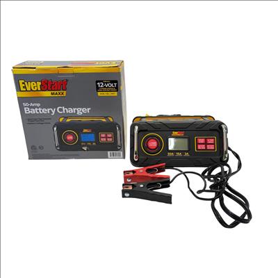 The EverStart Maxx BCS50BE 50-Amp Battery Charger & Maintainer delivers powerful 50-amp charging capability designed for 12-volt lead-acid batteries, including AGM, gel, and wet types. This robust charger features engine start assist, alternator testing, and battery voltage check functions to ensure comprehensive battery maintenance and performance optimization.