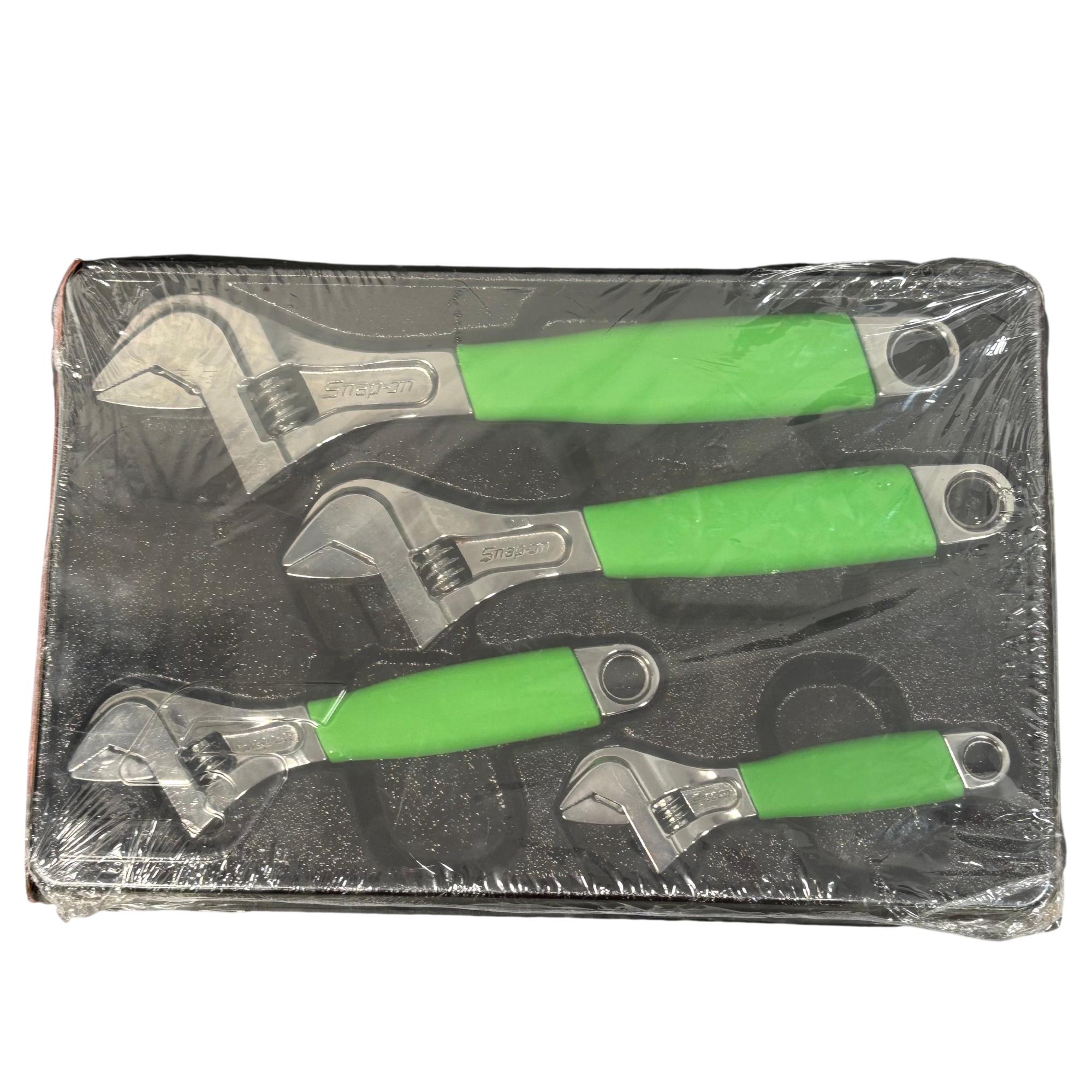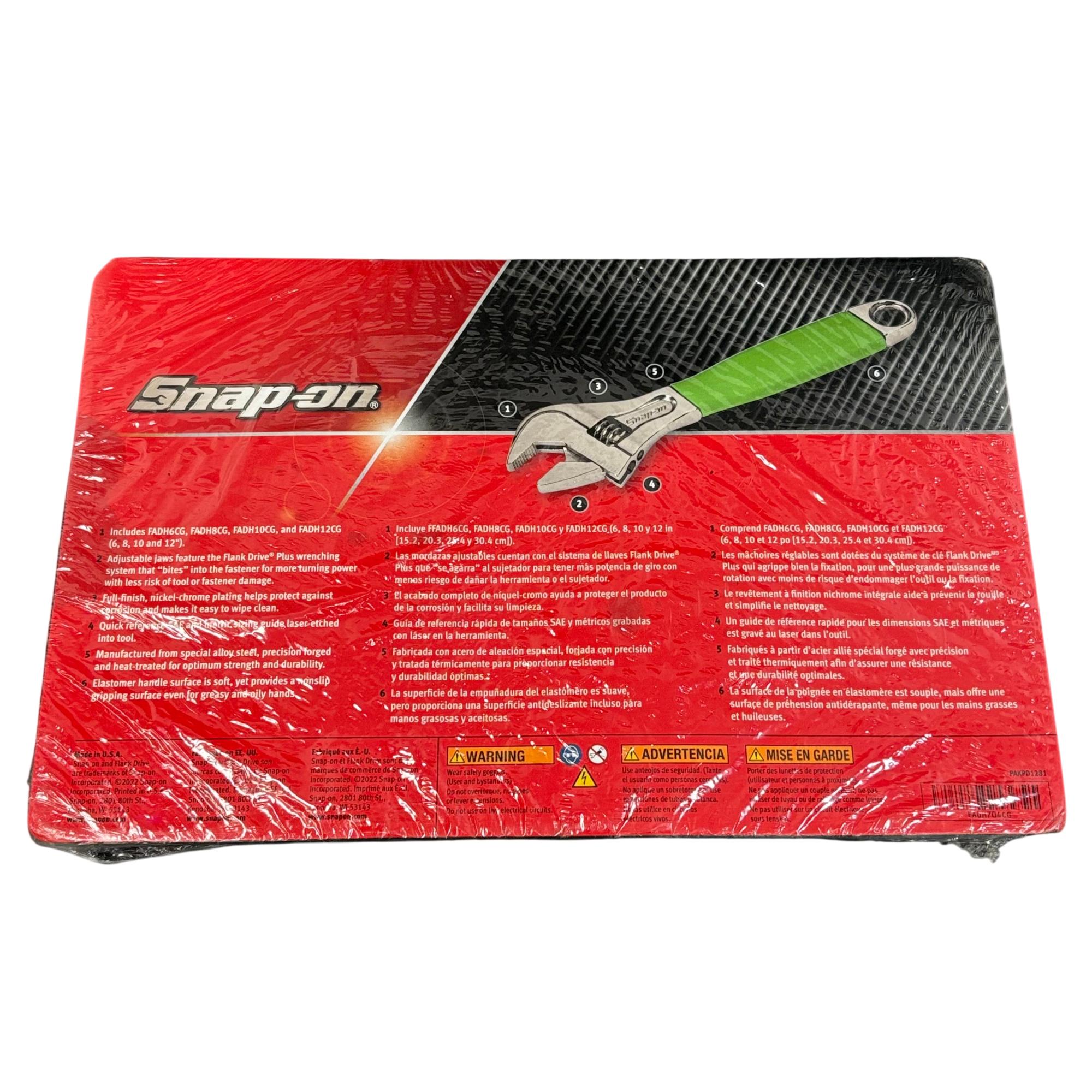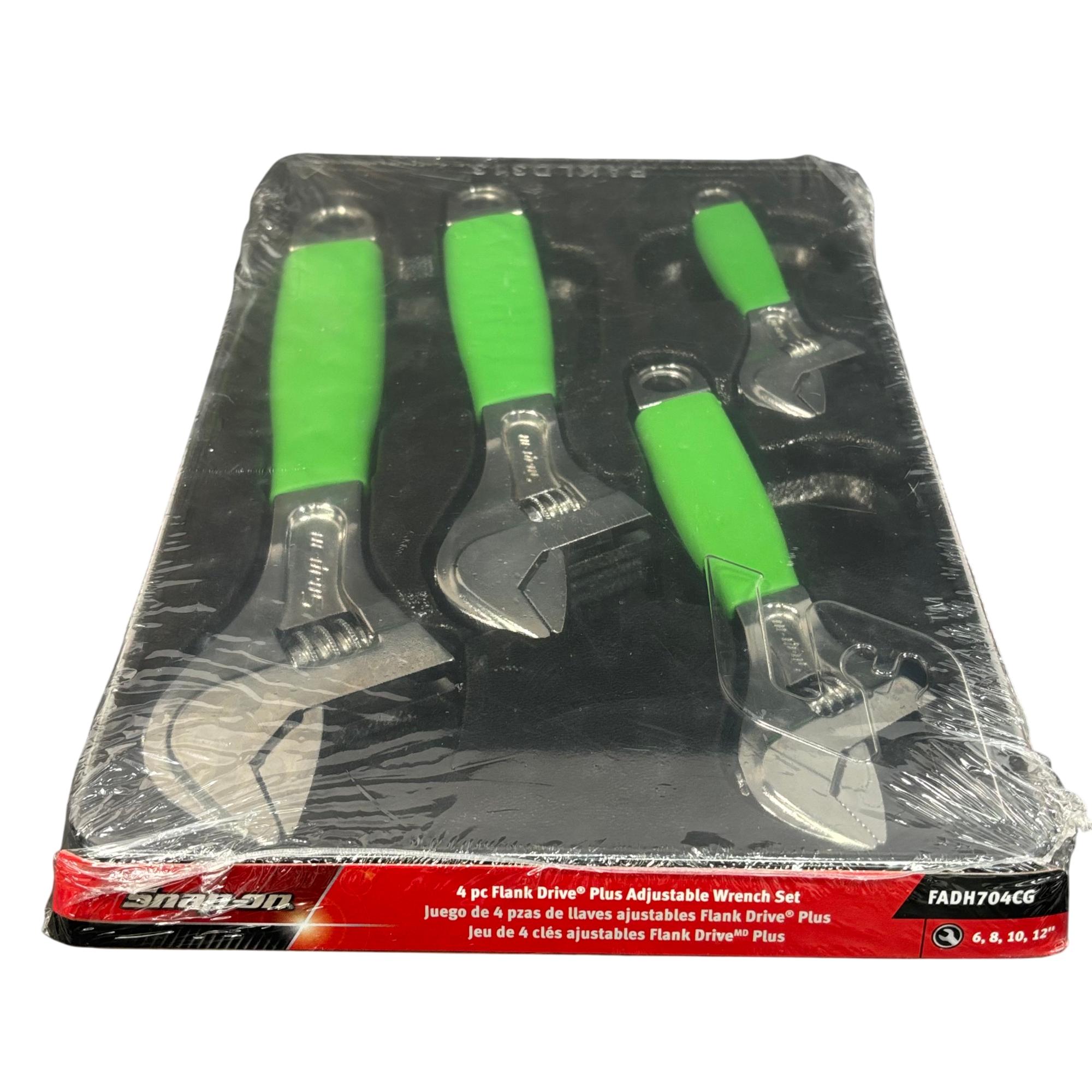 Snap-on FADH704CG 4-Piece Green Flank Drive Plus Adjustable Wrench Set includes 6", 8", 10", and 12" sizes engineered for precision and durability. These adjustable wrenches feature a unique flank drive design that provides superior grip and reduces fastener rounding, making them ideal for professional metalworking and automotive applications. Constructed with high-quality materials, each wrench offers reliable performance and long-lasting strength in a vibrant green finish.