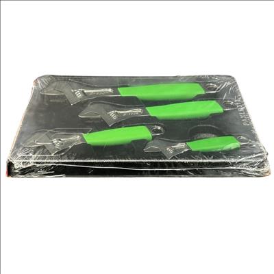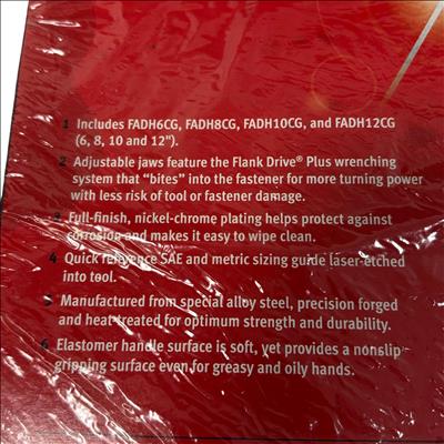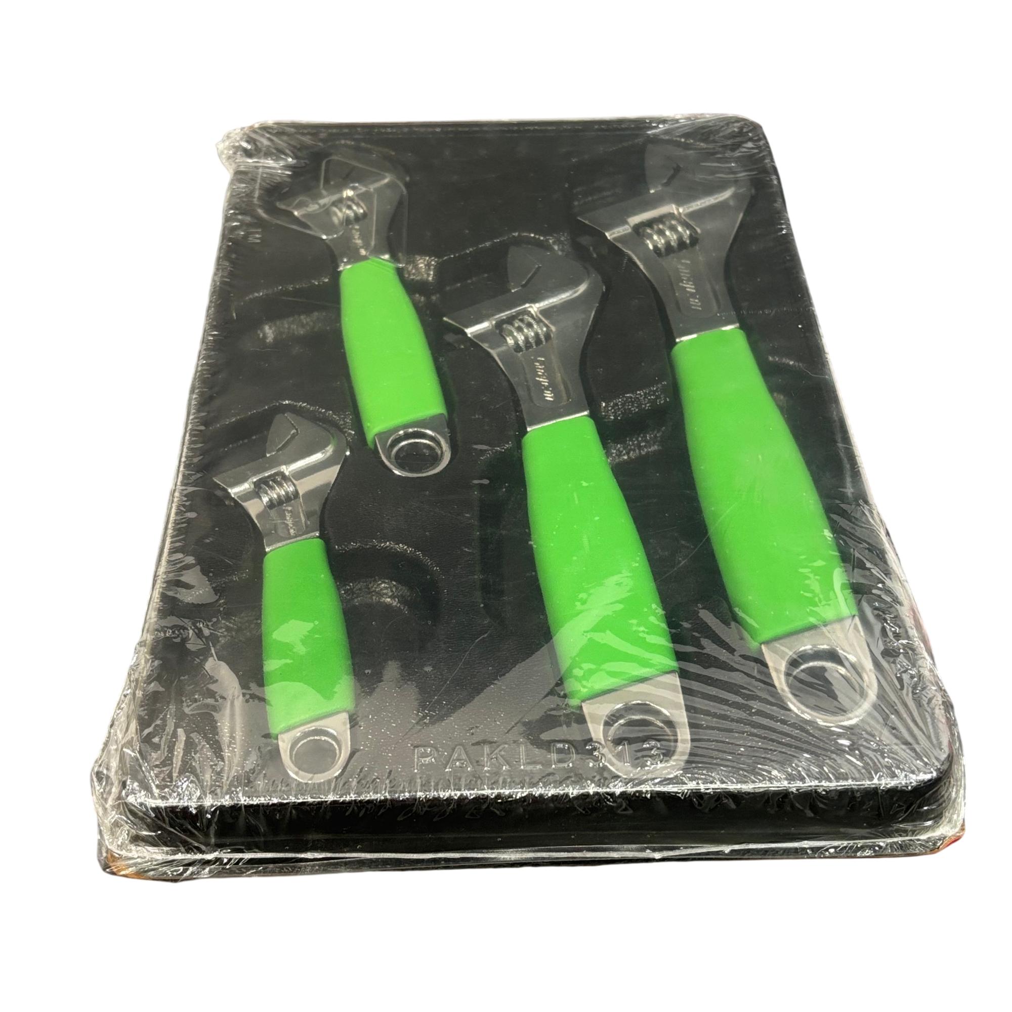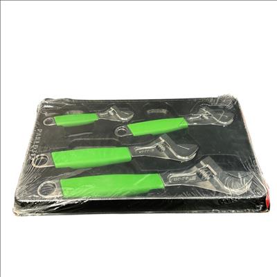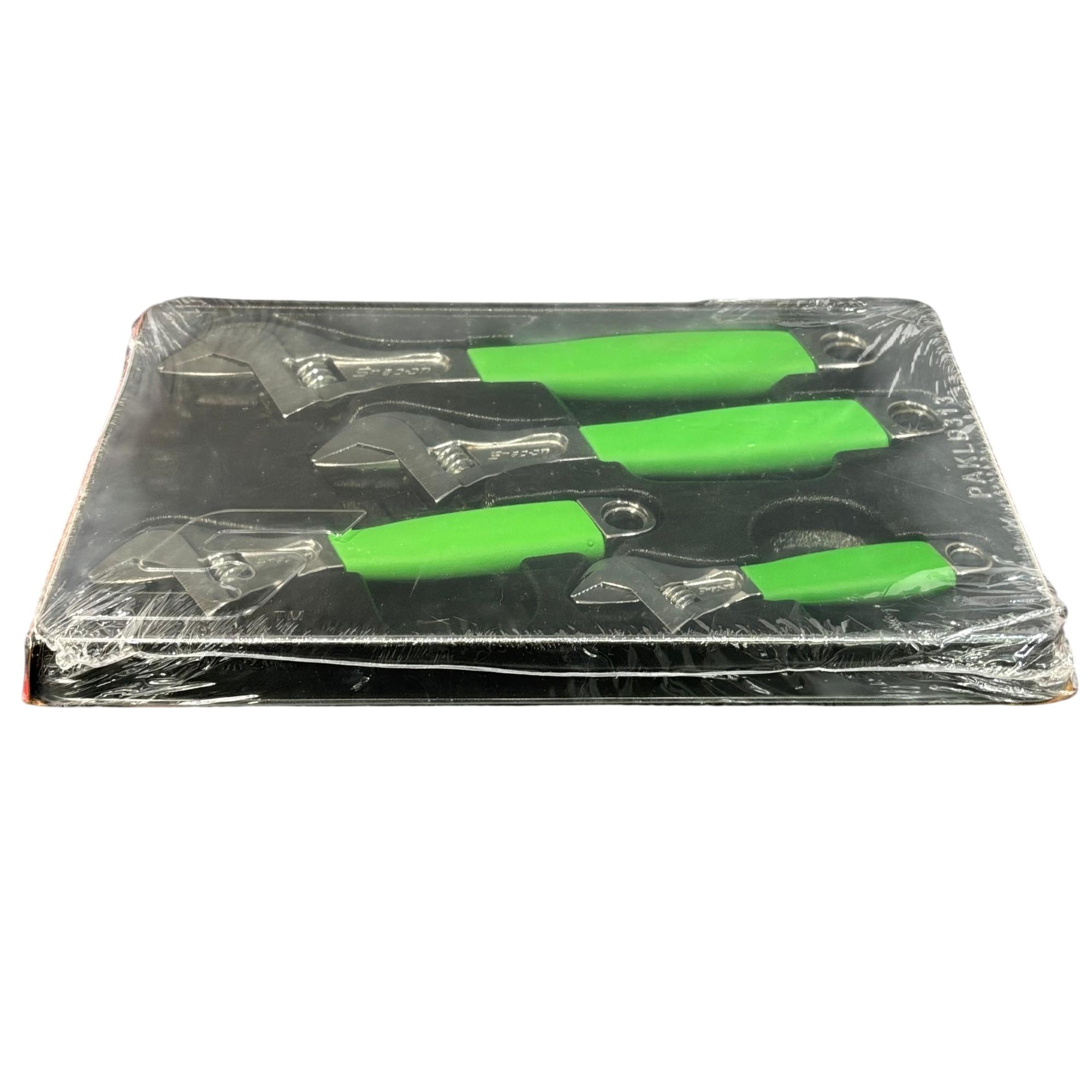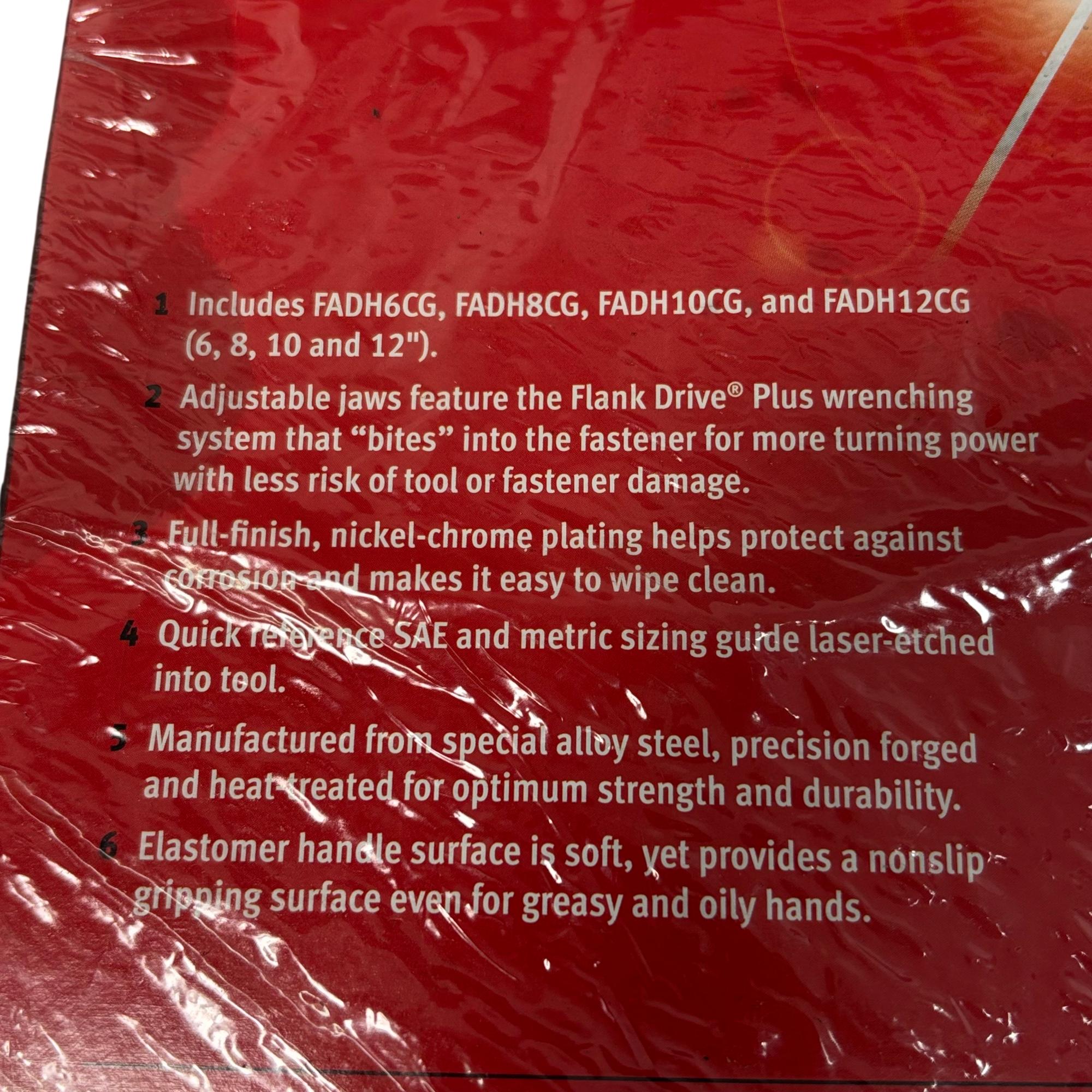 Snap-on FADH704CG 4-Piece Green Flank Drive Plus Adjustable Wrench Set includes 6", 8", 10", and 12" sizes engineered for precision and durability. These adjustable wrenches feature a unique flank drive design that provides superior grip and reduces fastener rounding, making them ideal for professional metalworking and automotive applications. Constructed with high-quality materials, each wrench offers reliable performance and long-lasting strength in a vibrant green finish.