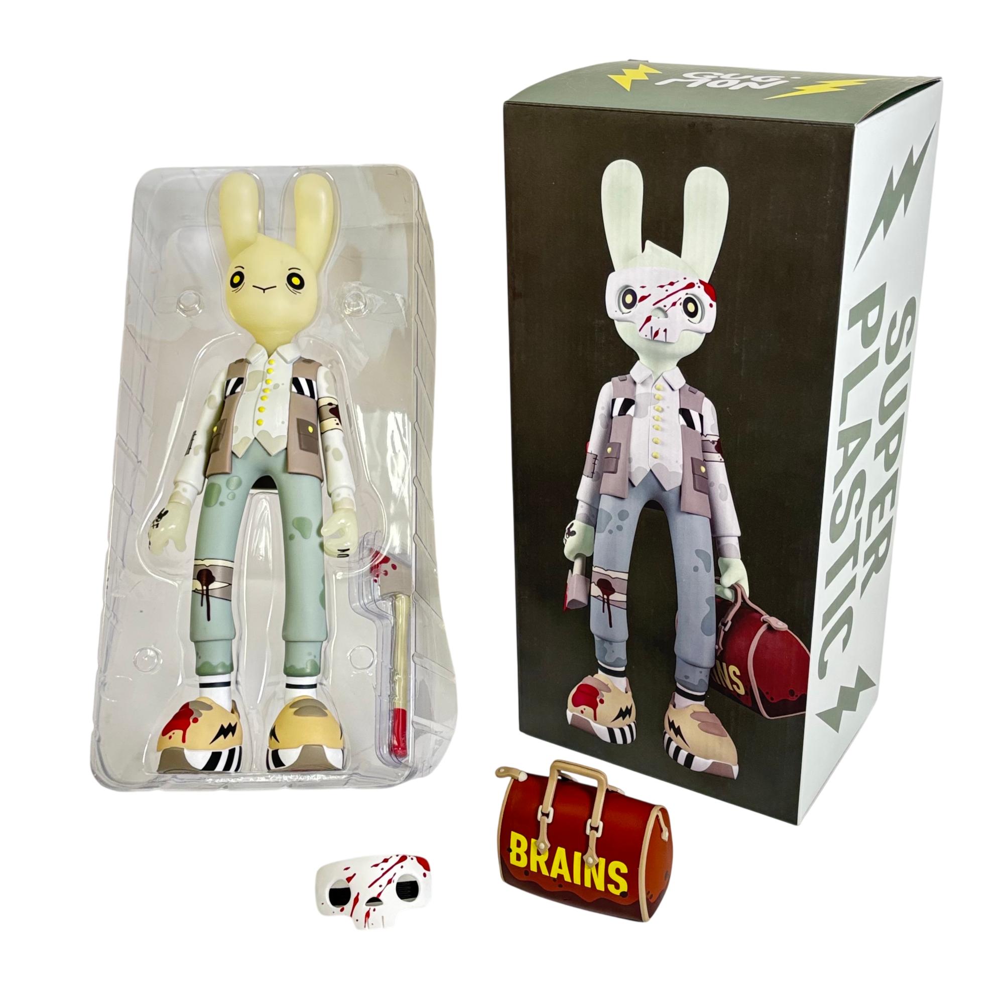 Superplastic x Guggimon Work & Slay Glow Edition Limited Art Toy Figure is a collectible designer figure featuring a striking white rabbit character. This intricately crafted figure blends vibrant street fashion elements with an edgy urban aesthetic, making it a standout piece for art toy collectors and enthusiasts.