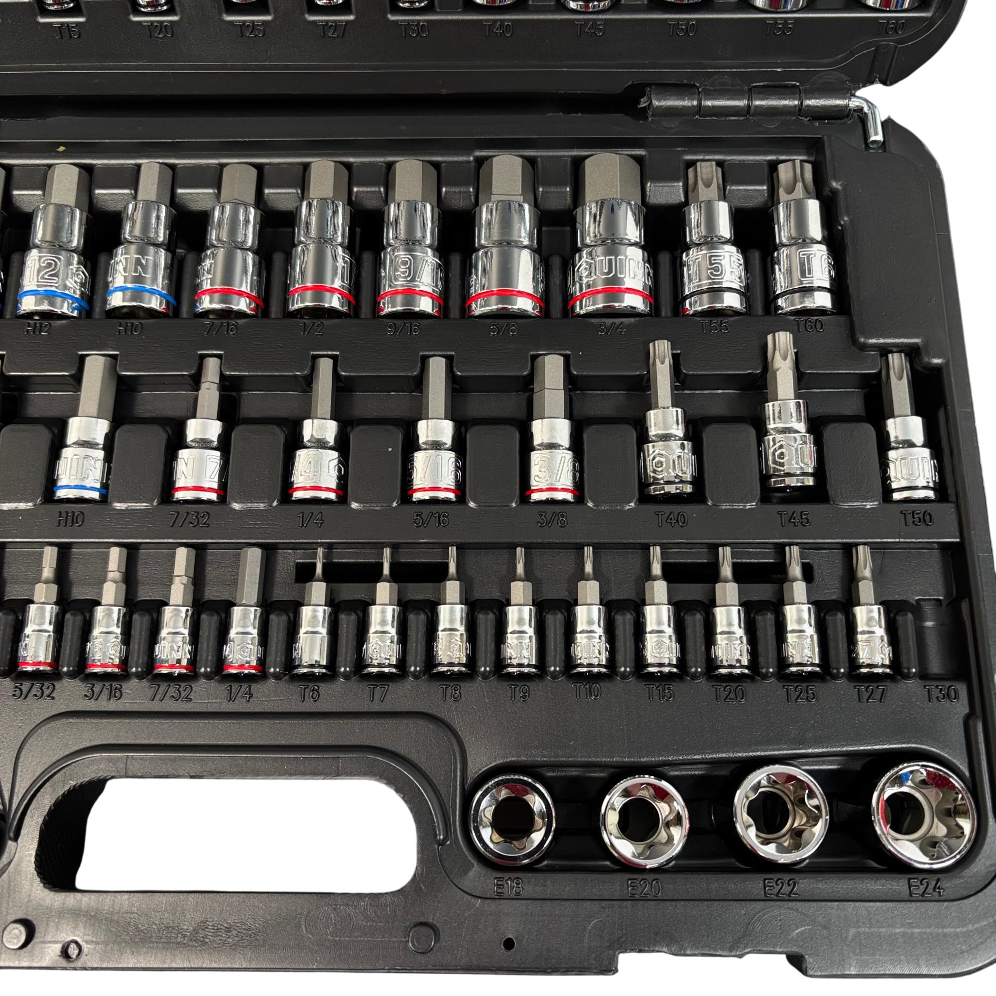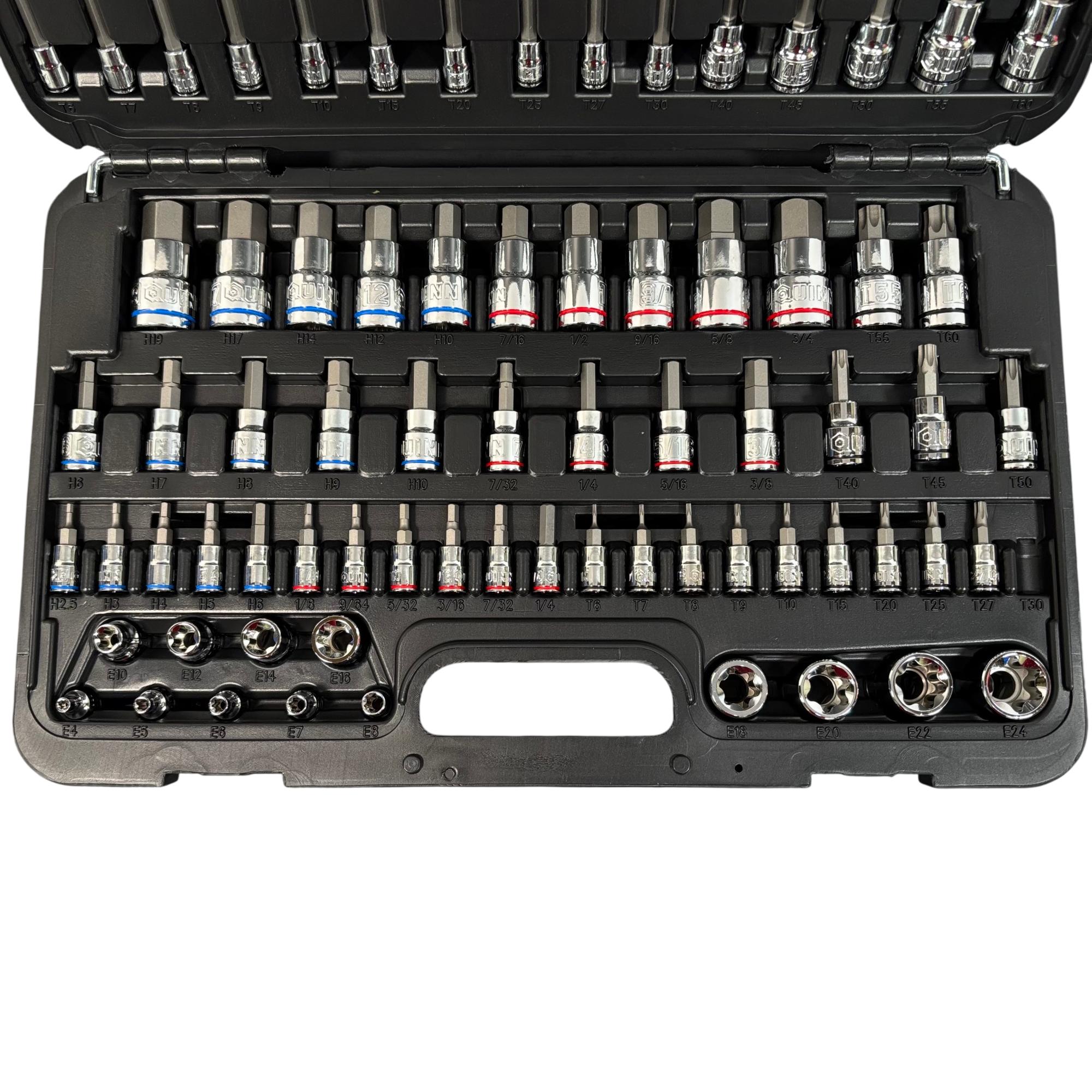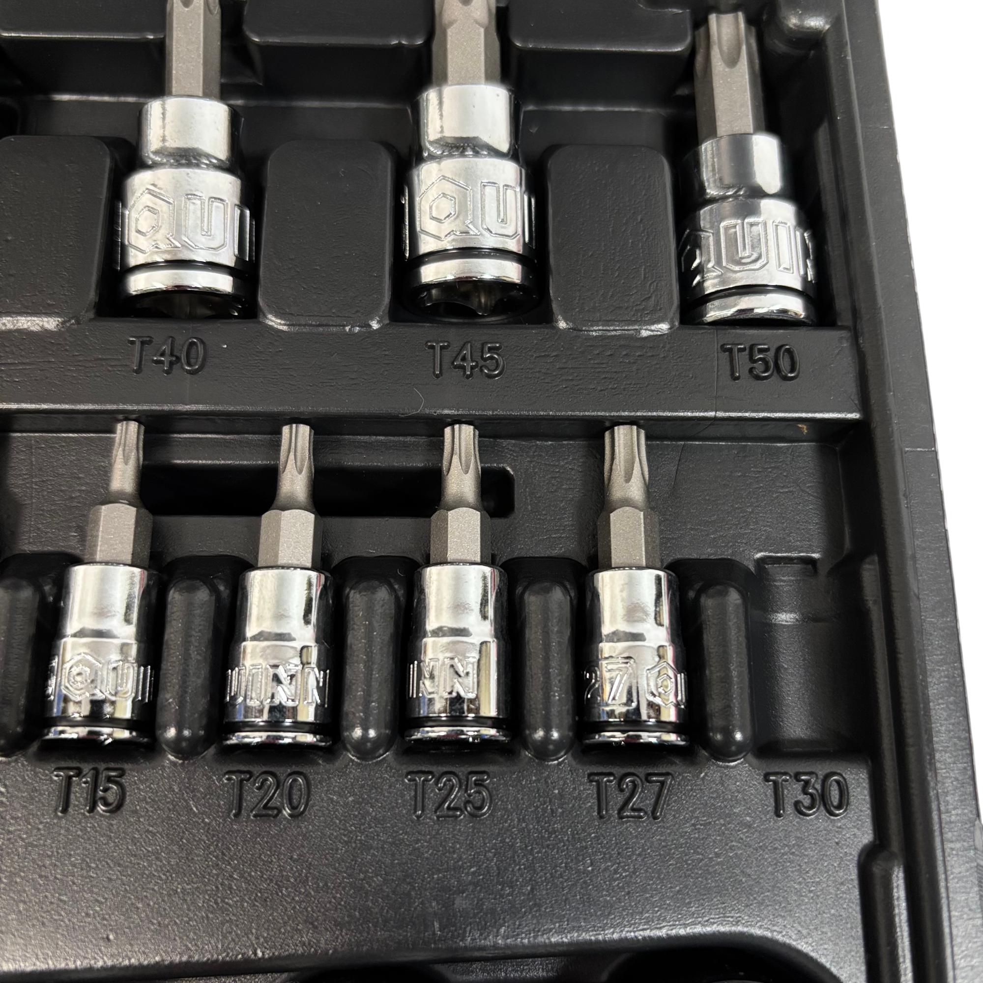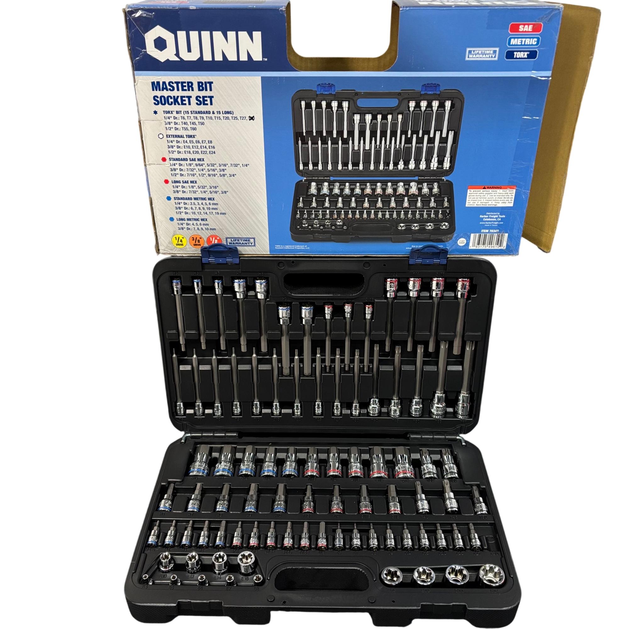 QUINN 87-Piece Master Bit Socket Set (Item 70347) offers a comprehensive collection of SAE and metric bits designed for versatility and durability. This set features a wide range of TORX, hex, and external bit sockets in multiple drive sizes, making it ideal for professional mechanics and DIY enthusiasts seeking precise fitting tools.