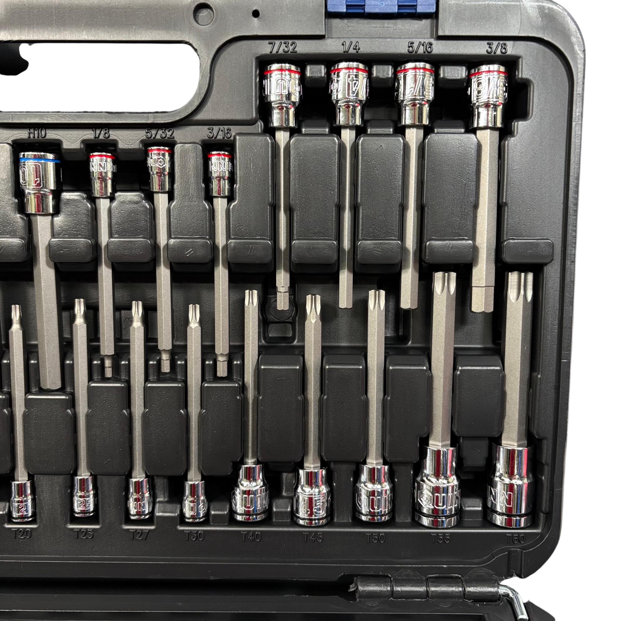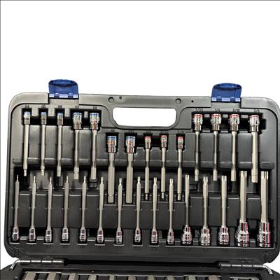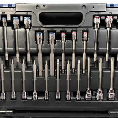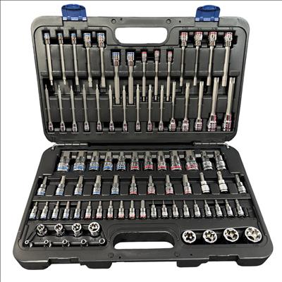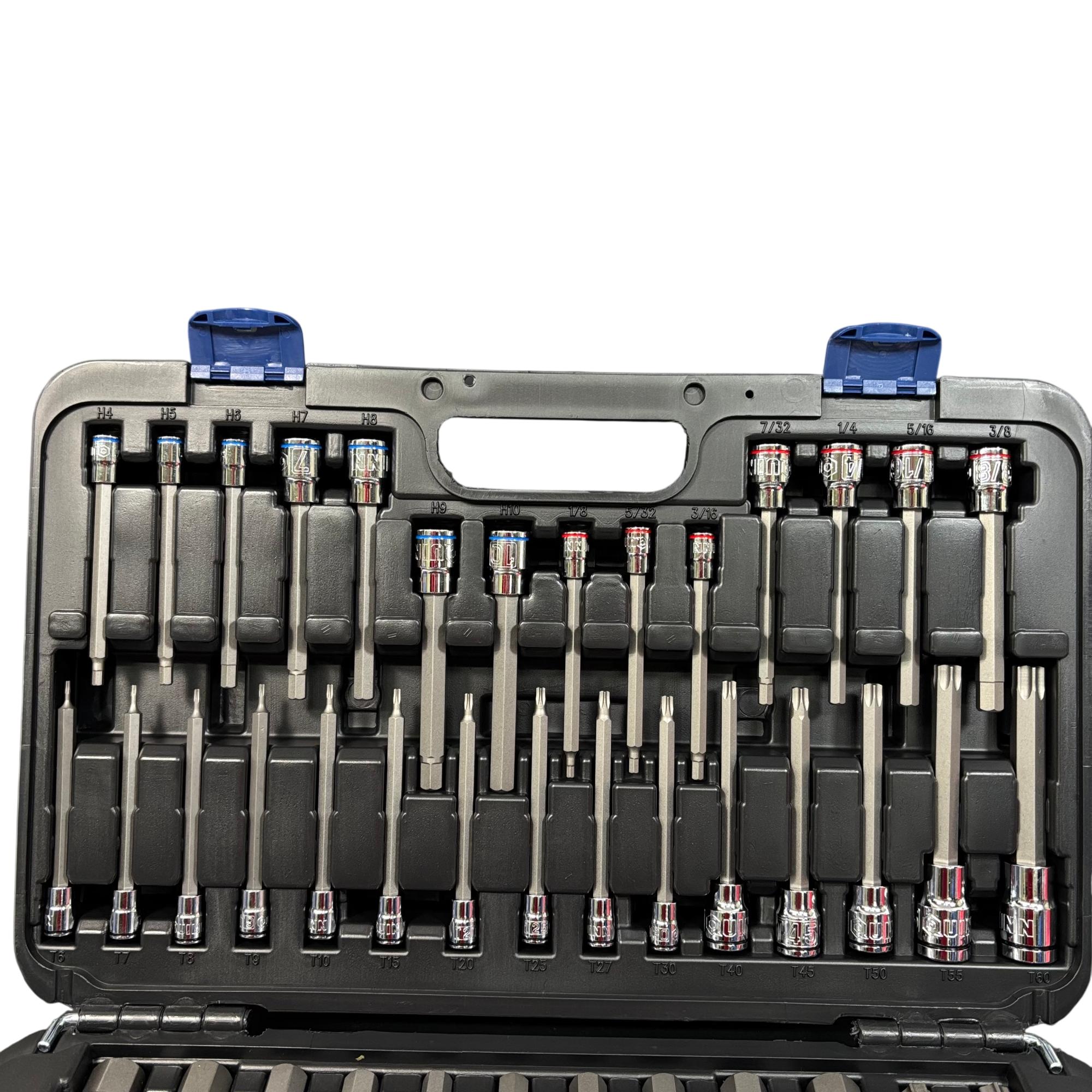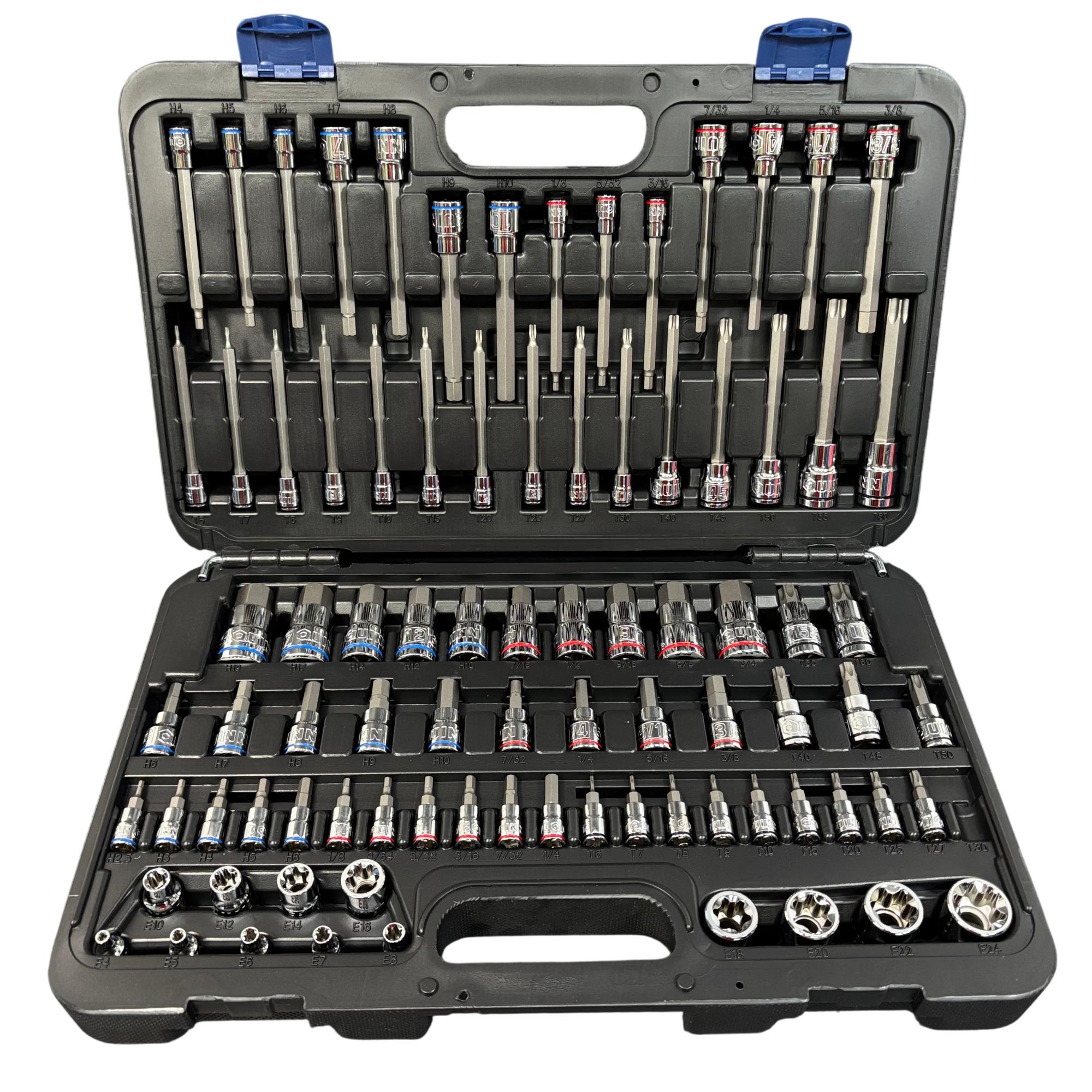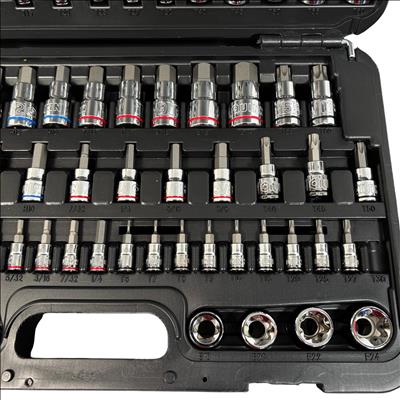 QUINN 87-Piece Master Bit Socket Set (Item 70347) offers a comprehensive collection of SAE and metric bits designed for versatility and durability. This set features a wide range of TORX, hex, and external bit sockets in multiple drive sizes, making it ideal for professional mechanics and DIY enthusiasts seeking precise fitting tools.