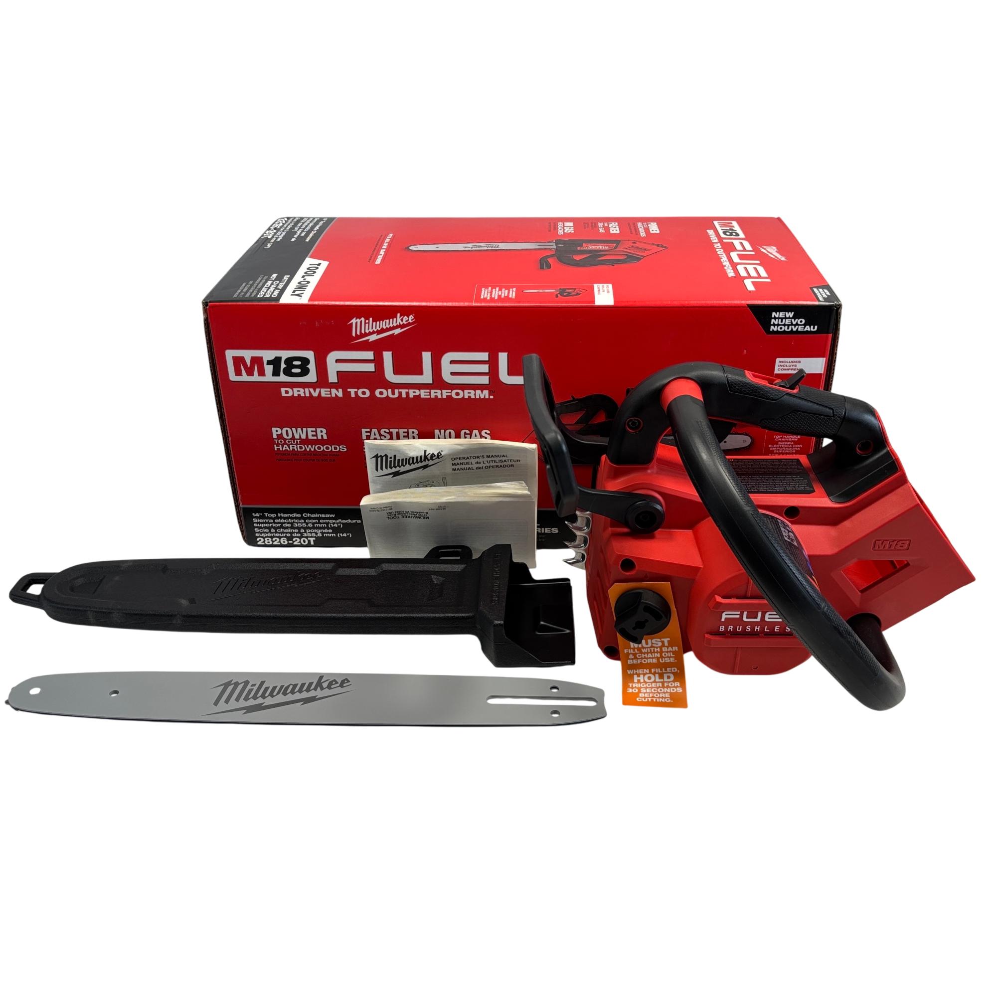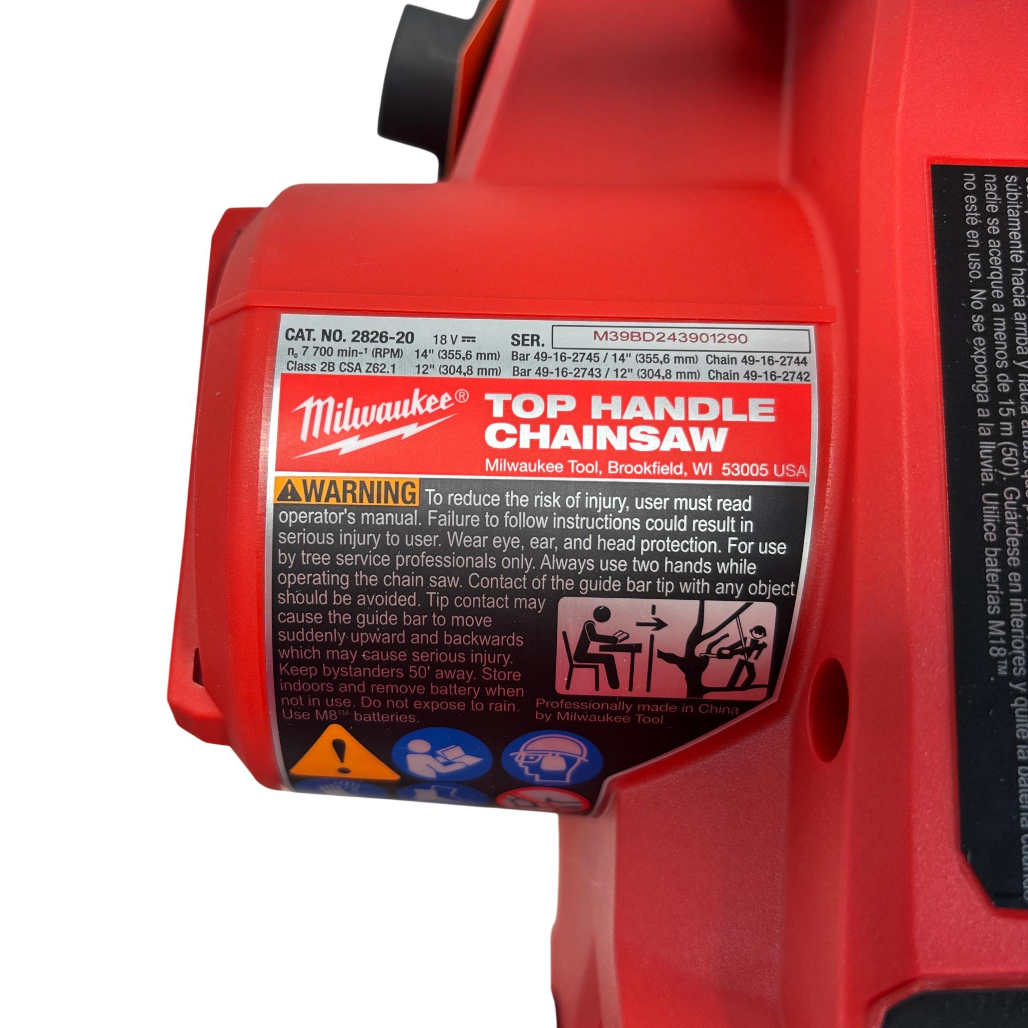 The Milwaukee 2826-20 M18 FUEL Brushless Cordless 14" Top Handle Chainsaw delivers powerful performance with a brushless motor and a 14-inch bar designed for efficient cutting. Its cordless design offers greater maneuverability, making it ideal for professional tree care and pruning tasks. Engineered with advanced technology, this chainsaw provides fast, reliable power without the need for gas or cords.