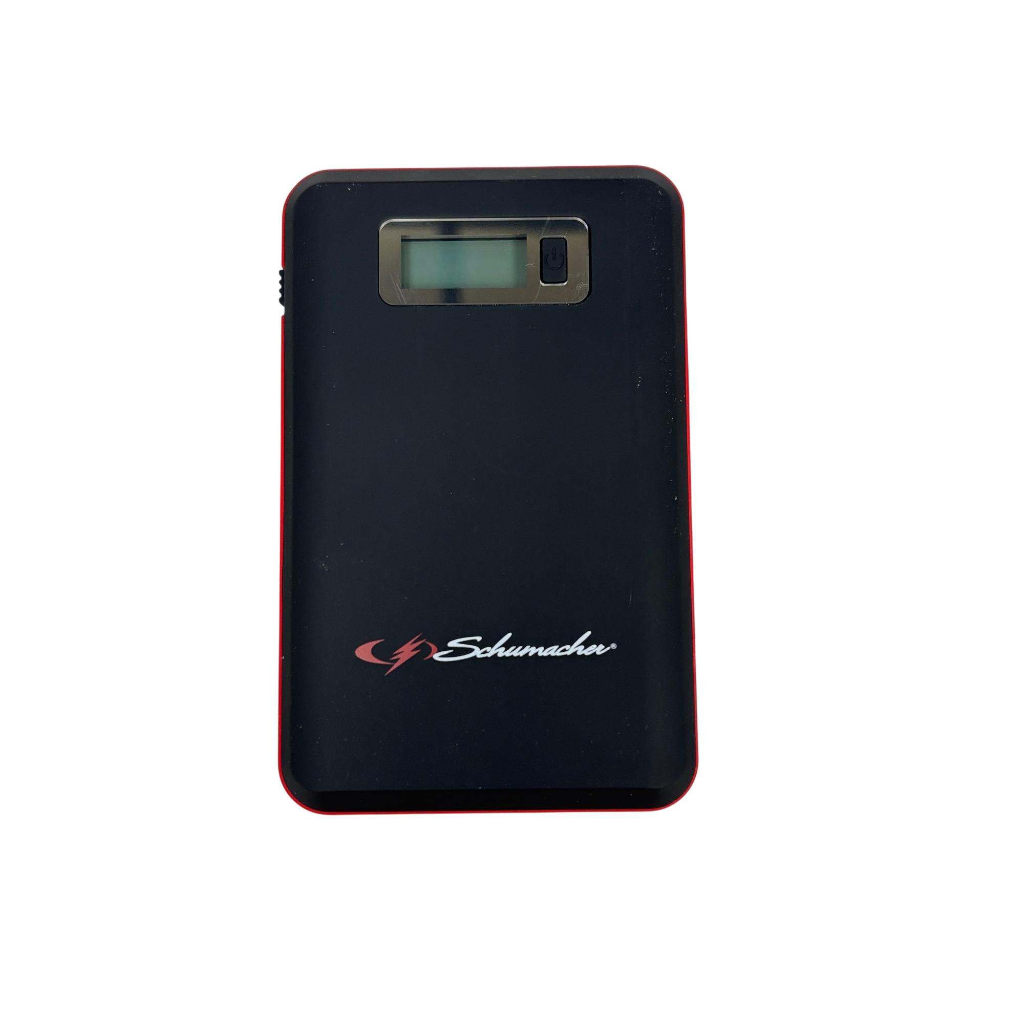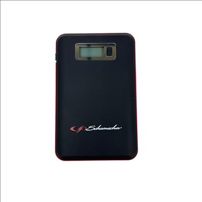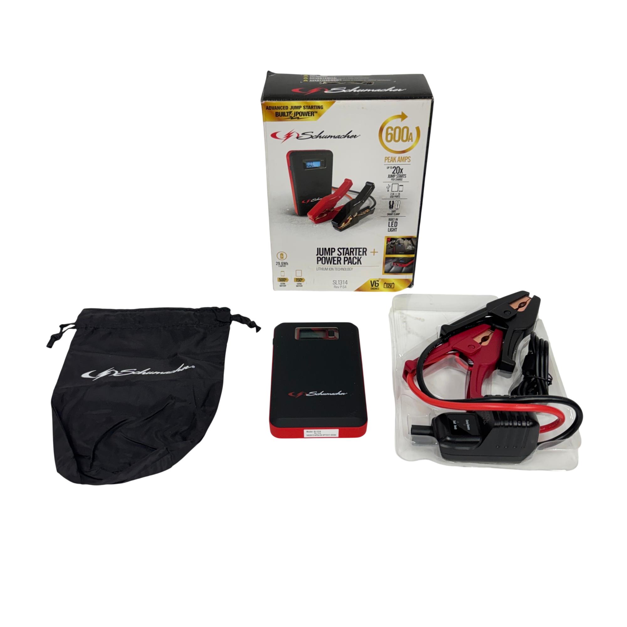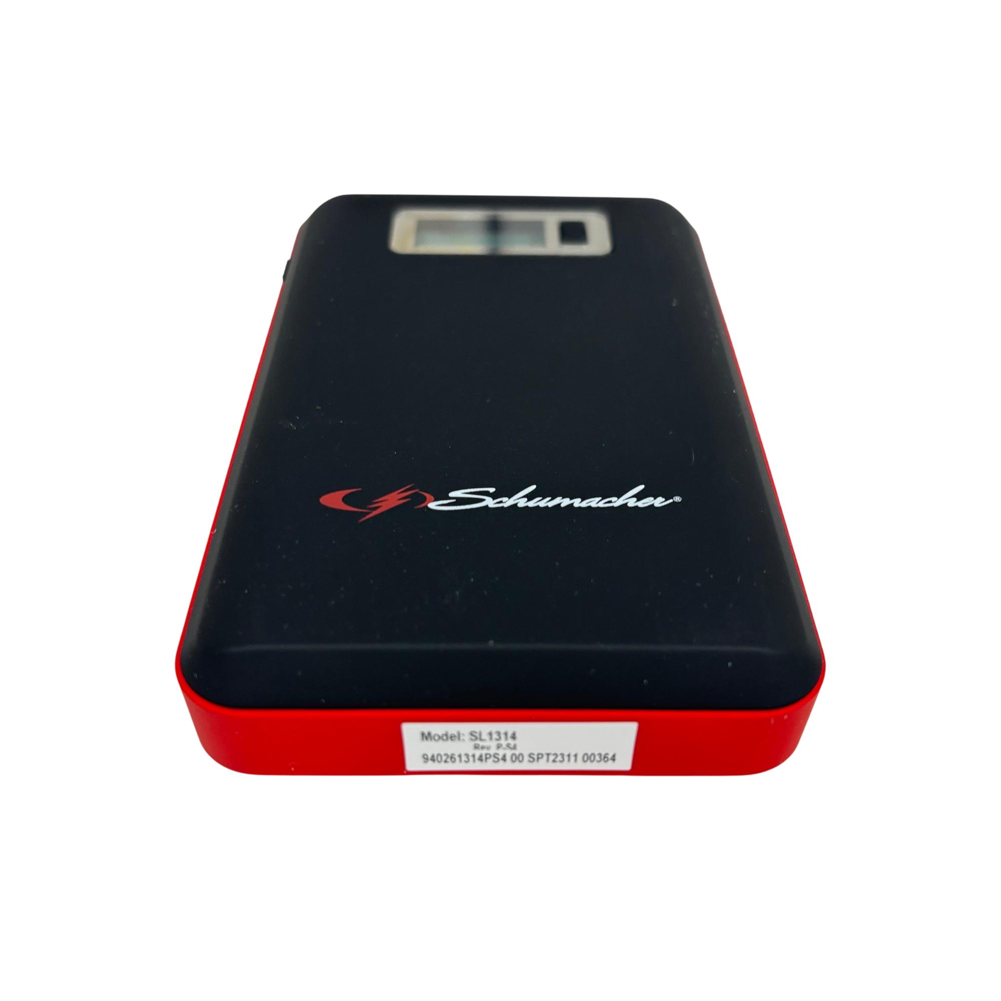The Schumacher SL1314 600A Jump Starter + Power Pack 29.6Wh Lithium Ion is a powerful and portable 12-volt jump starter designed for quick and reliable vehicle battery boosts. Featuring lithium-ion technology, it includes a built-in screen and multiple USB ports for versatile charging options, making it suitable for smartphones, tablets, and other electronic devices. This compact black and red device delivers 600 peak amps, ensuring efficient jump-starting performance in a lightweight form factor optimized for on-the-go use.