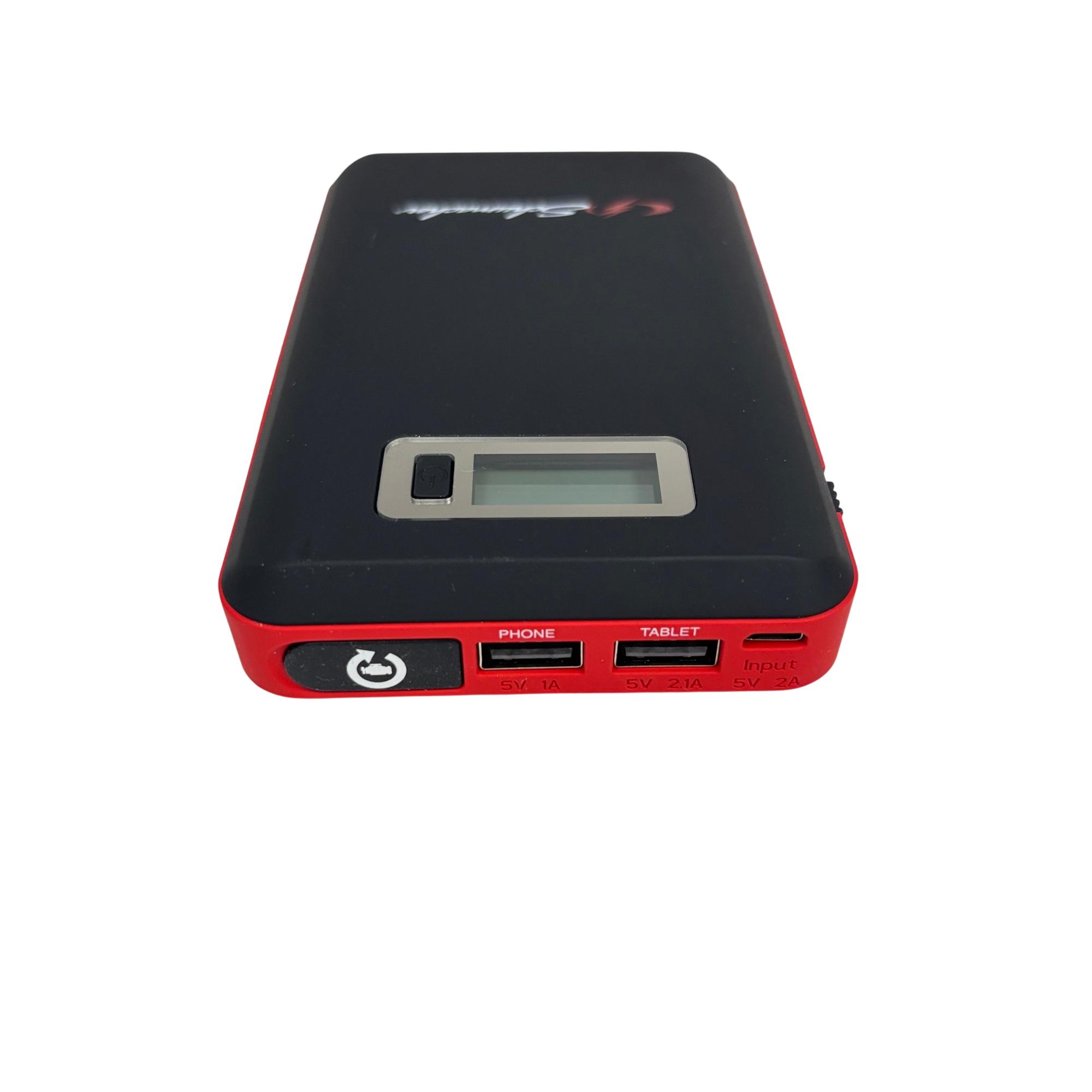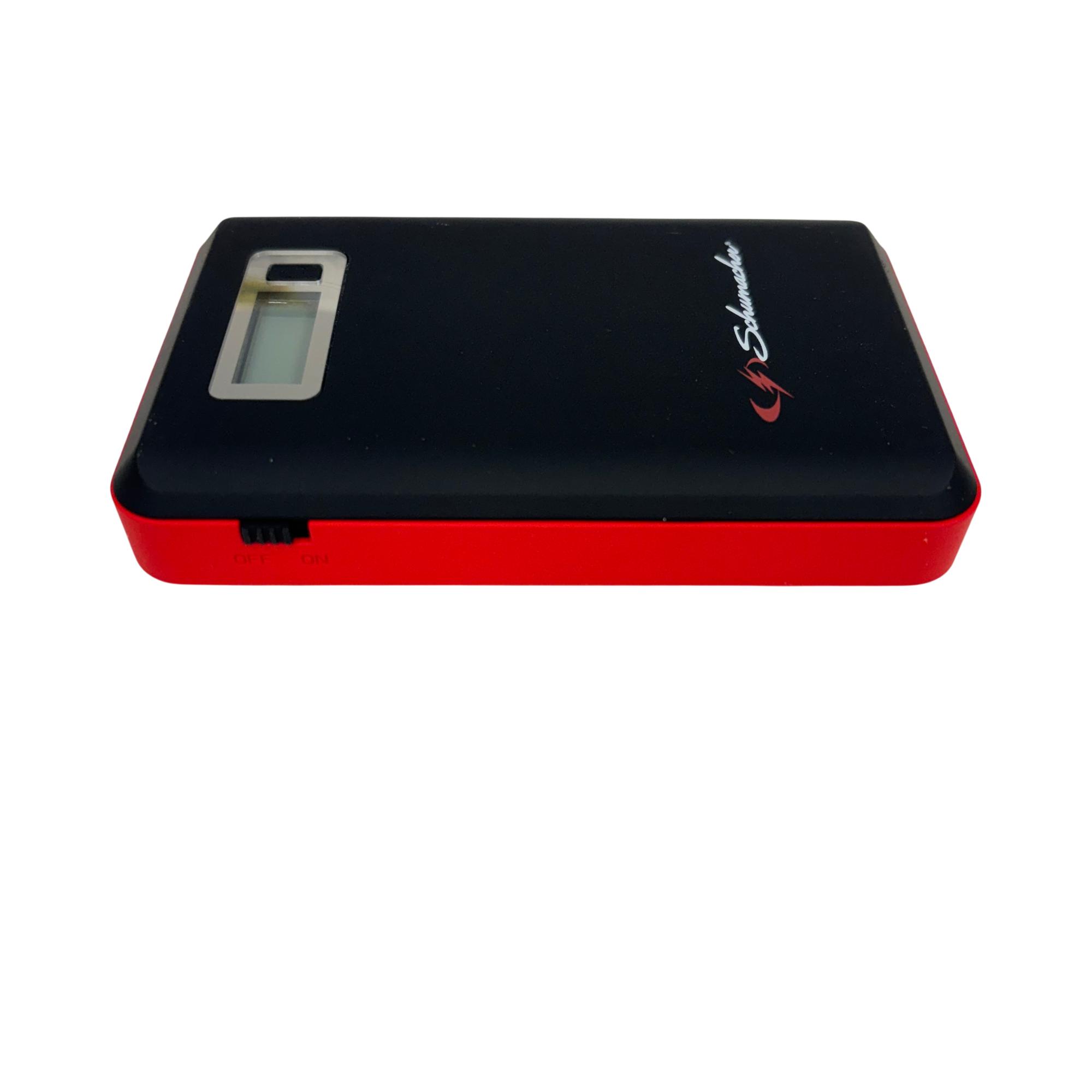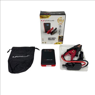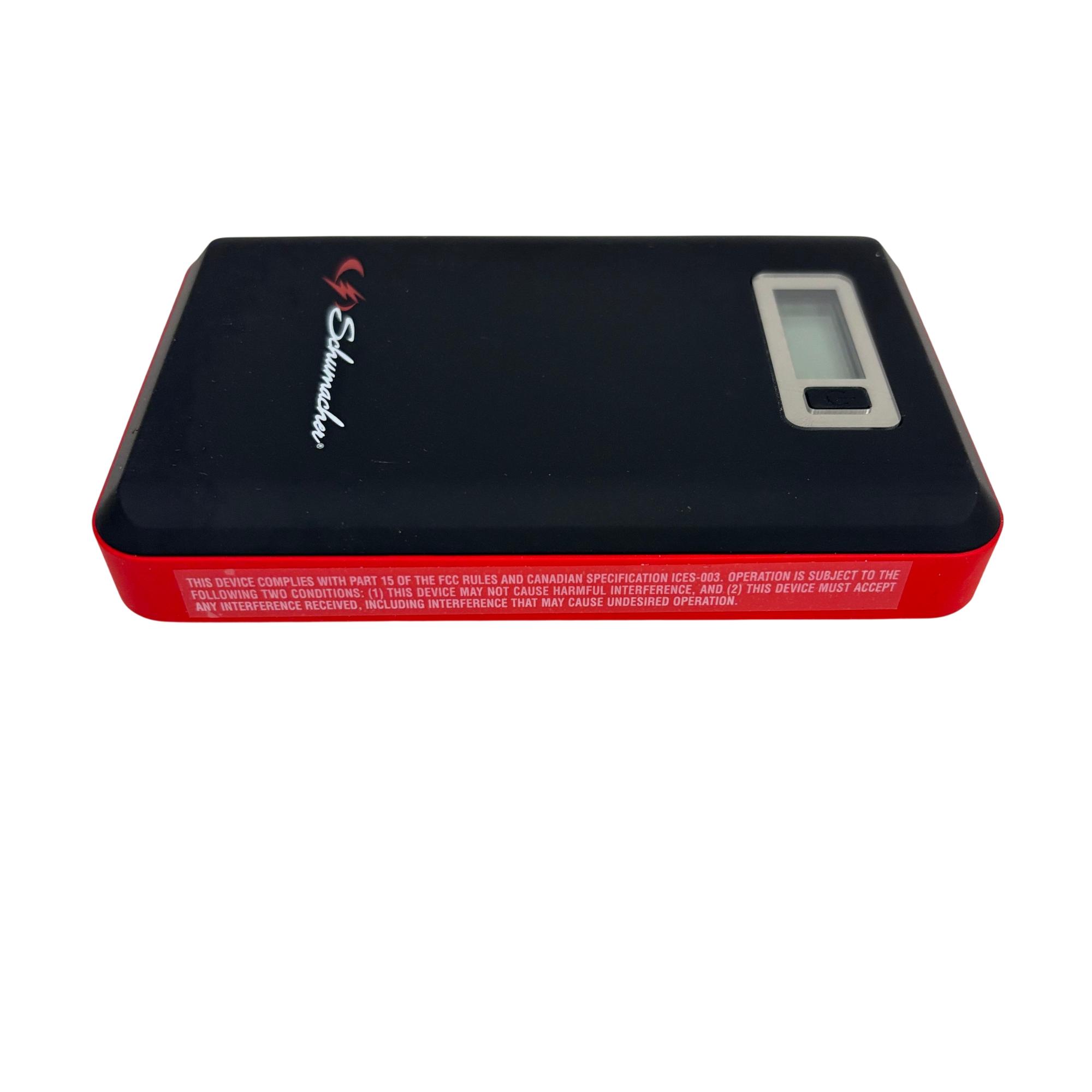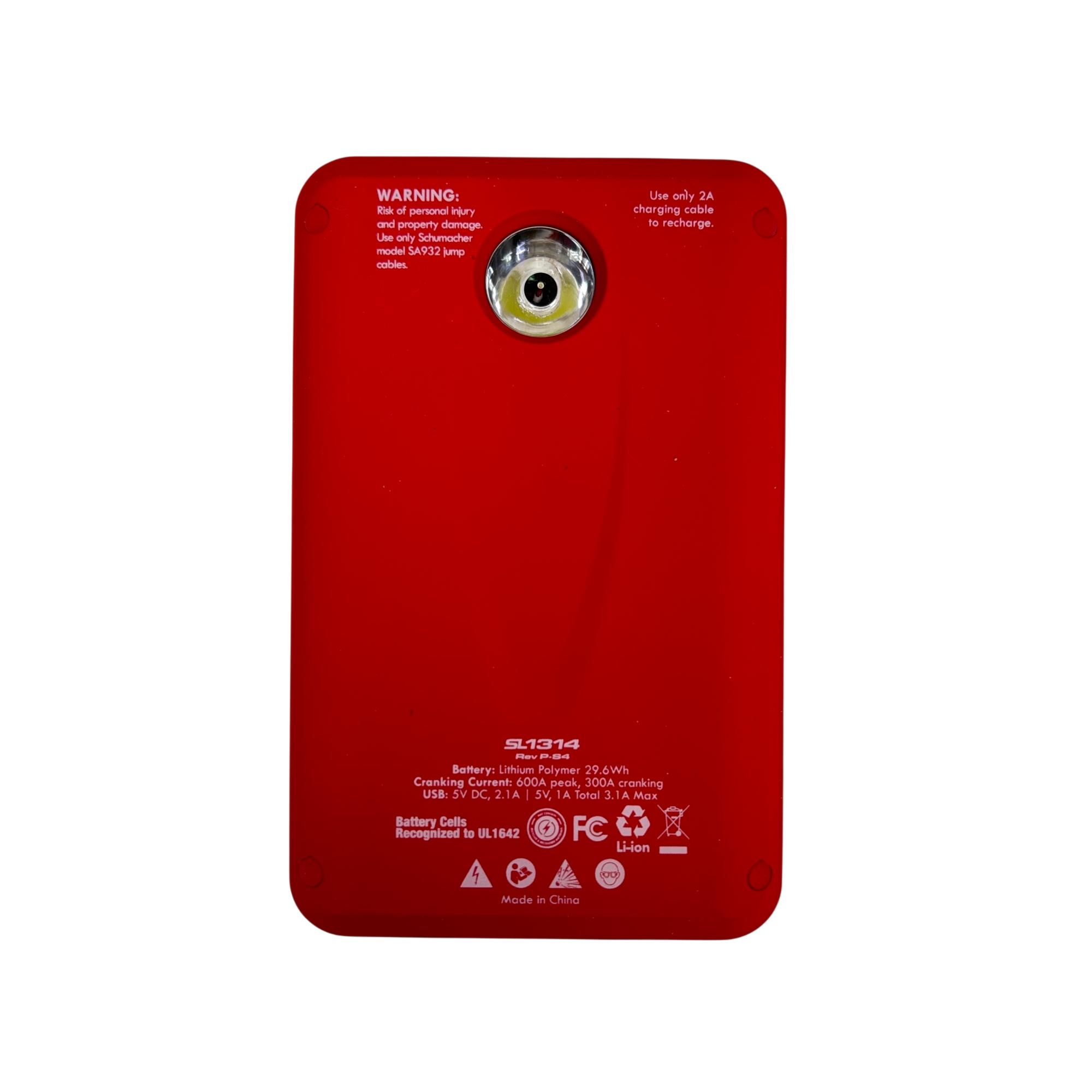 The Schumacher SL1314 600A Jump Starter + Power Pack 29.6Wh Lithium Ion is a powerful and portable 12-volt jump starter designed for quick and reliable vehicle battery boosts. Featuring lithium-ion technology, it includes a built-in screen and multiple USB ports for versatile charging options, making it suitable for smartphones, tablets, and other electronic devices. This compact black and red device delivers 600 peak amps, ensuring efficient jump-starting performance in a lightweight form factor optimized for on-the-go use.