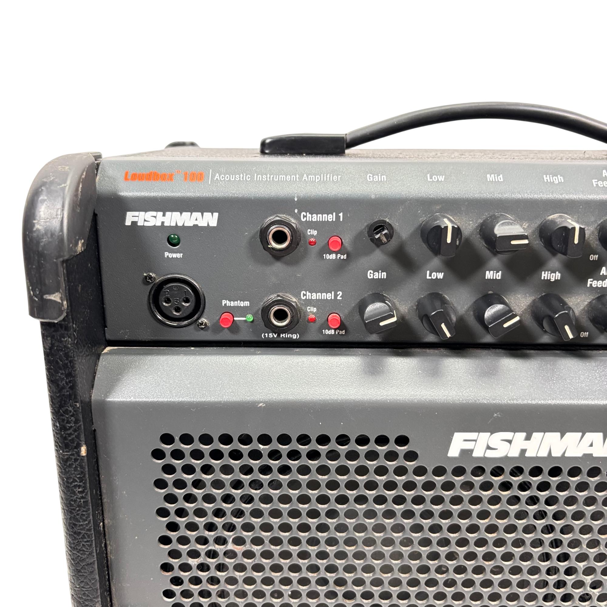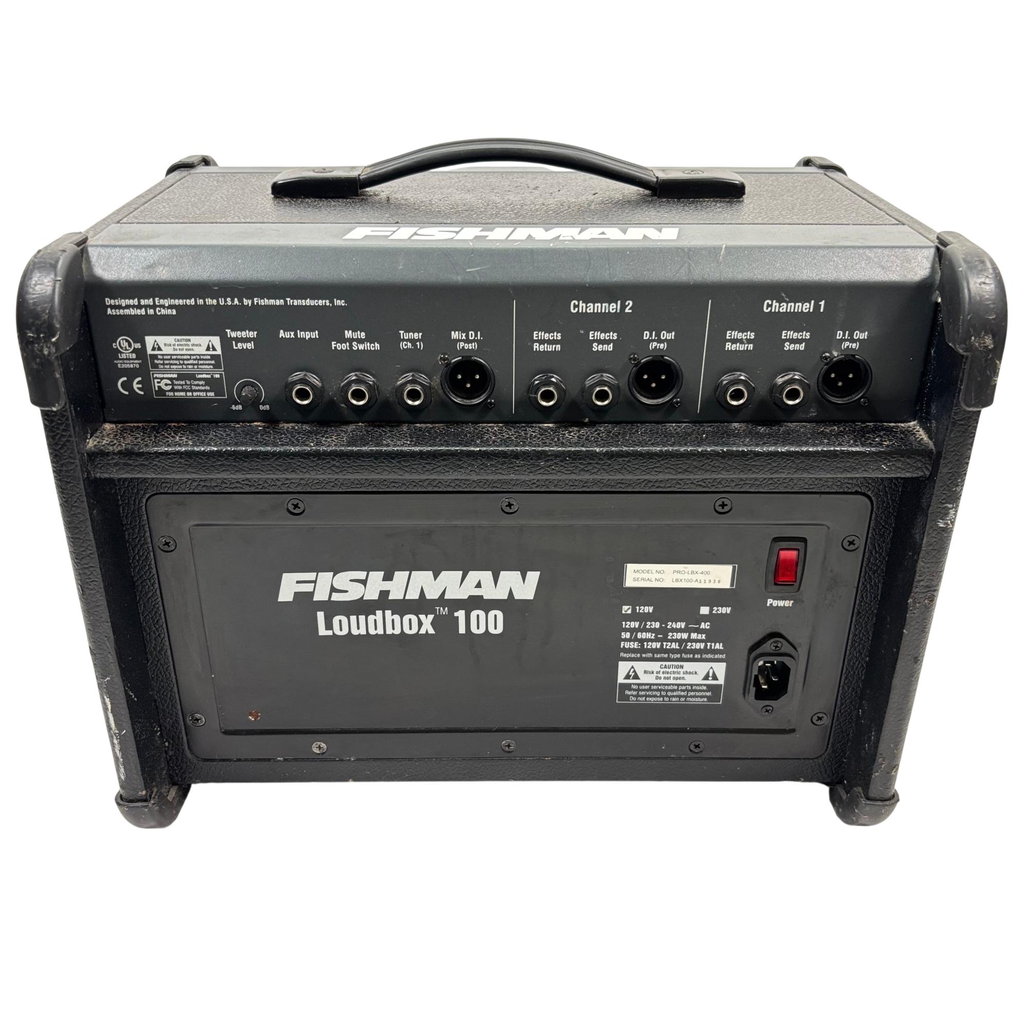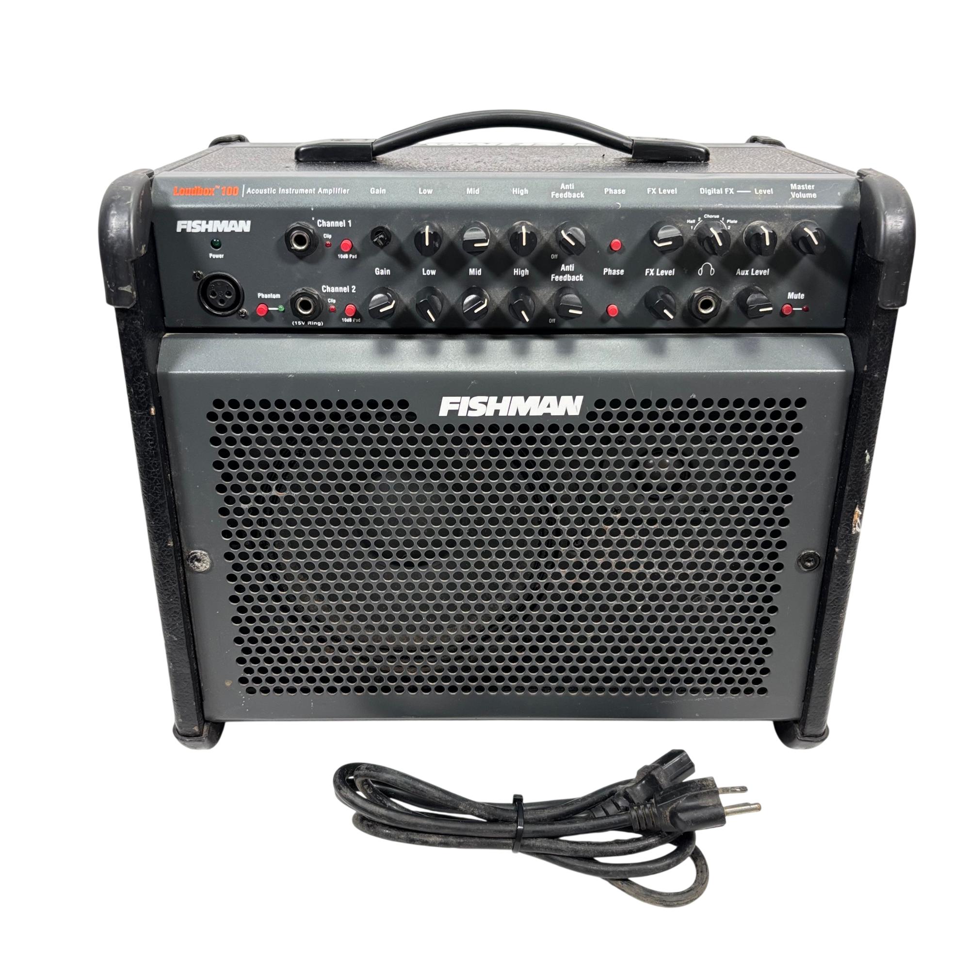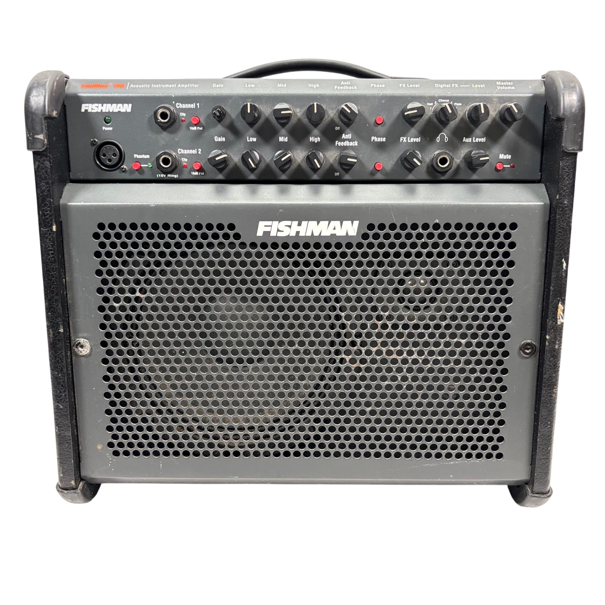 Fishman Loudbox 100 Acoustic Instrument Amplifier, Model PRO-LBX-400 delivers 100 watts of clear, powerful sound tailored for acoustic instruments and vocals. It features a detailed control panel with gain, EQ, feedback suppression, and digital effects, providing versatile tone-shaping in a compact, rugged design ideal for live performances and studio use.