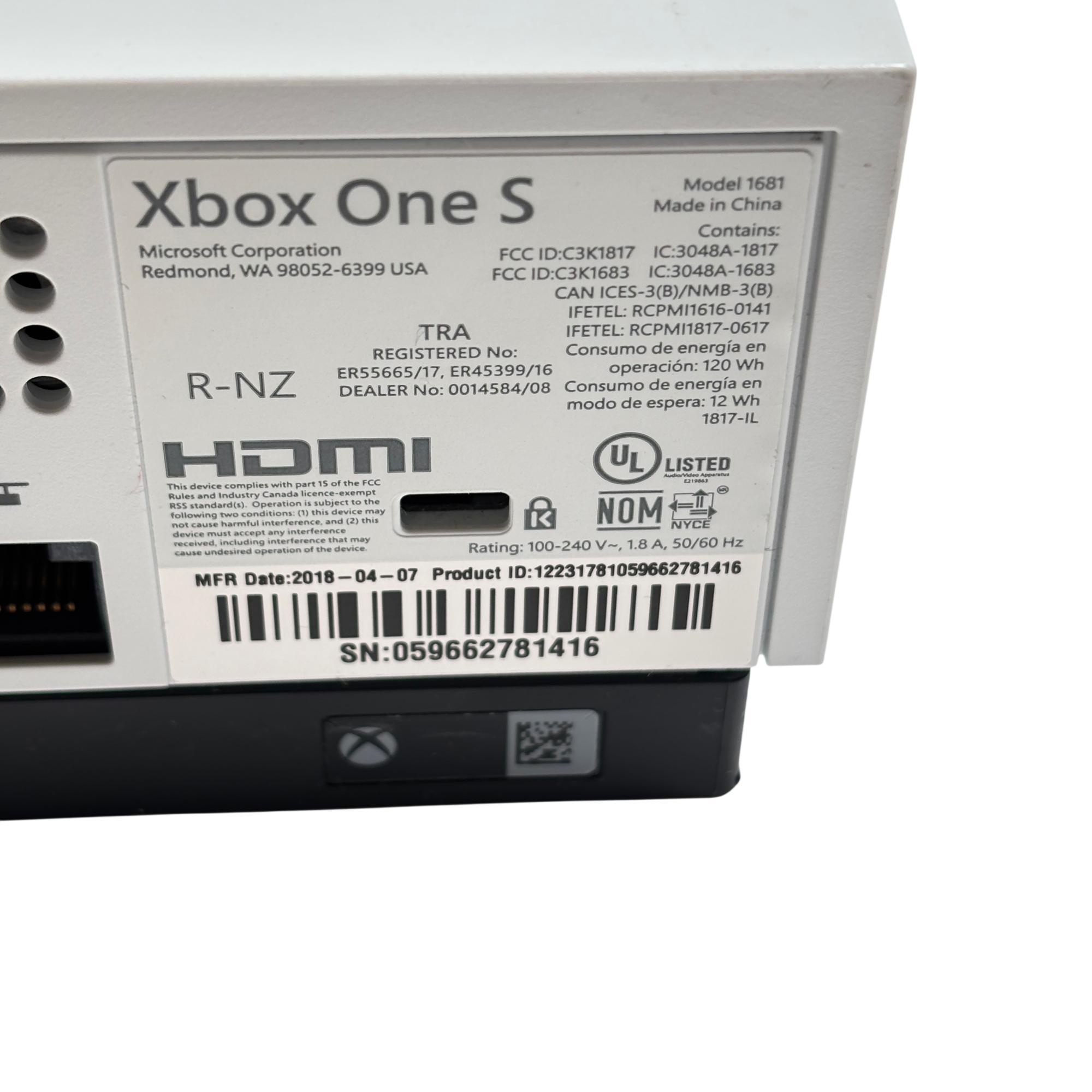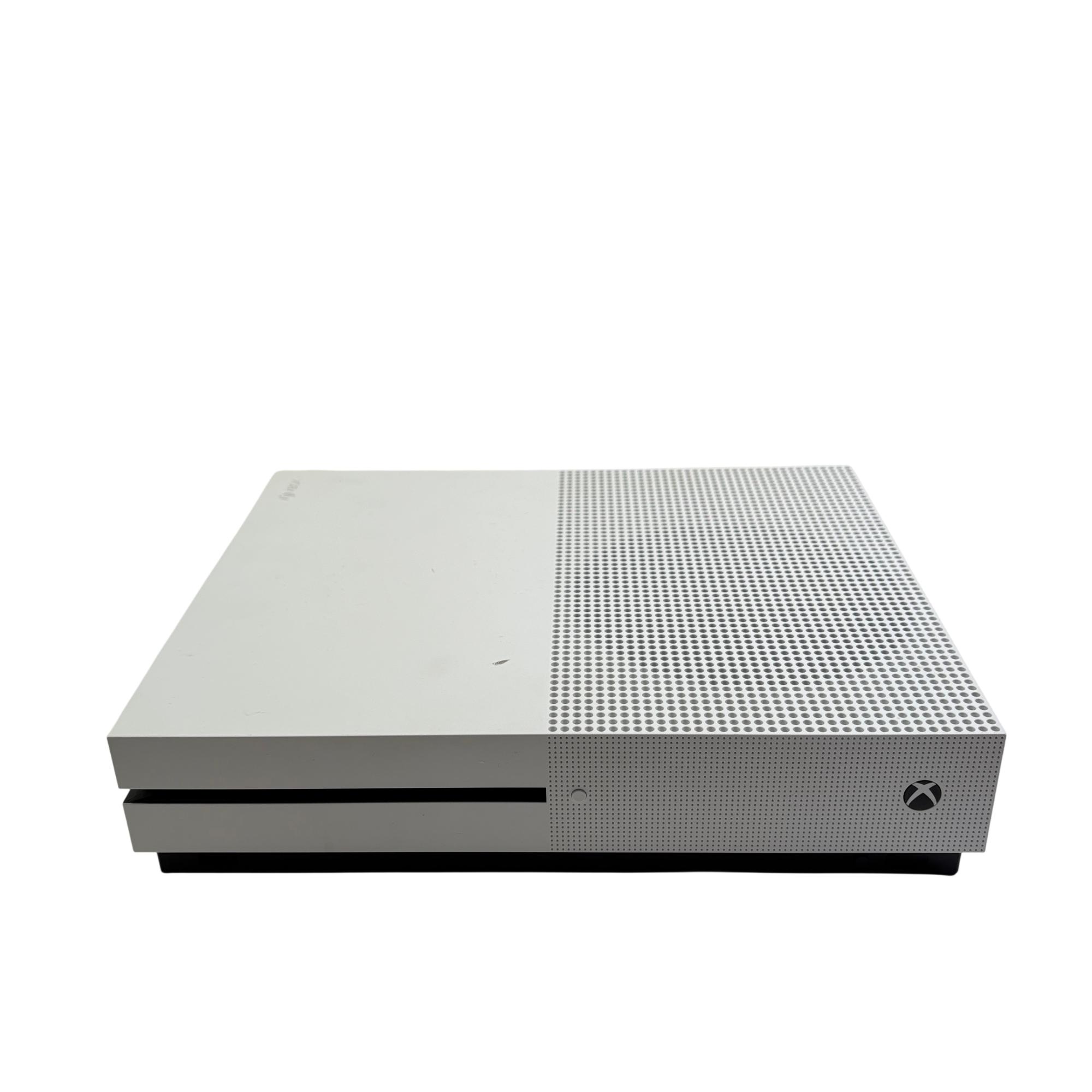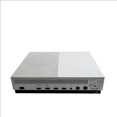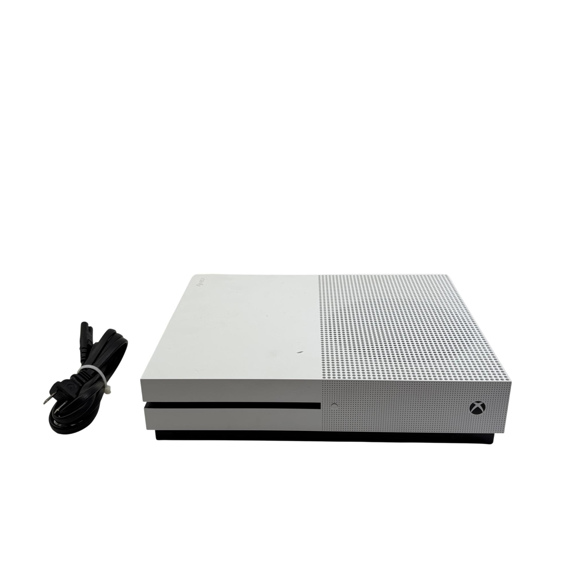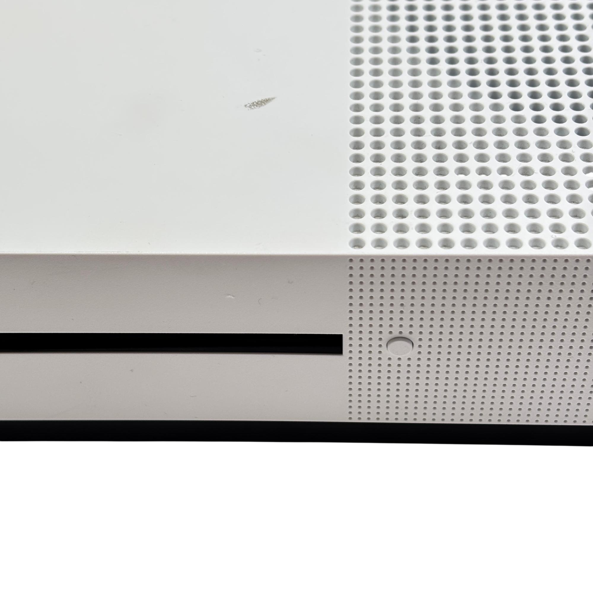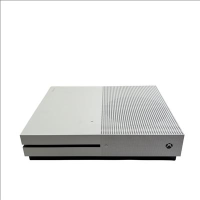Microsoft Xbox One S 1TB Model 1681 White Gaming Console offers a sleek, compact design with a distinctive white exterior featuring ventilation holes for optimal cooling. This console supports a large storage capacity of 1TB, providing ample space for games and media. Its streamlined design includes a black power cord, making it an efficient and stylish choice for gaming enthusiasts.