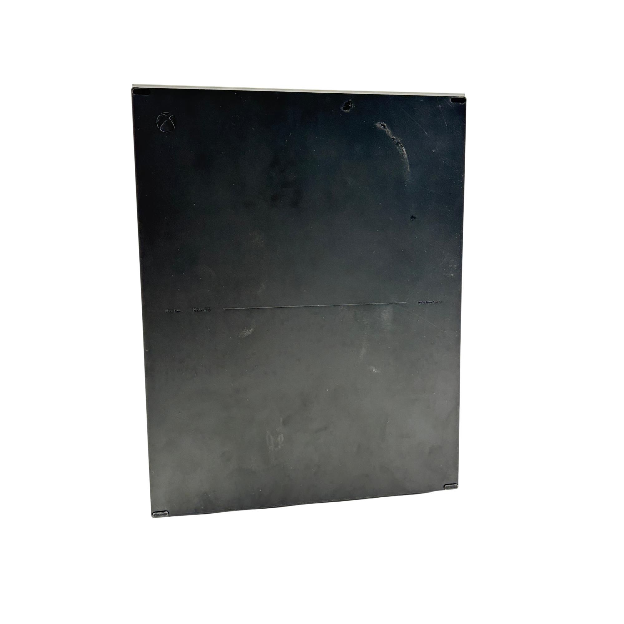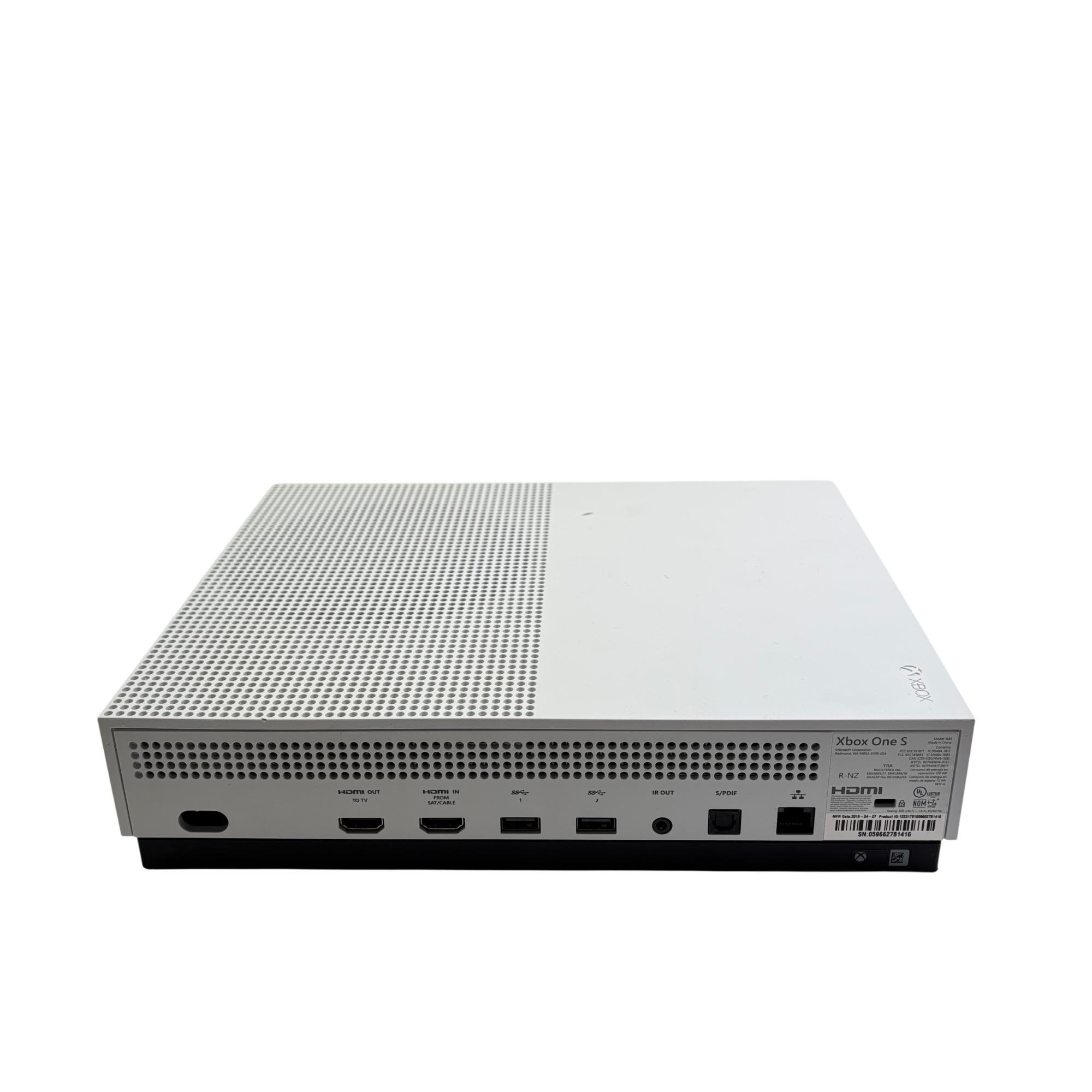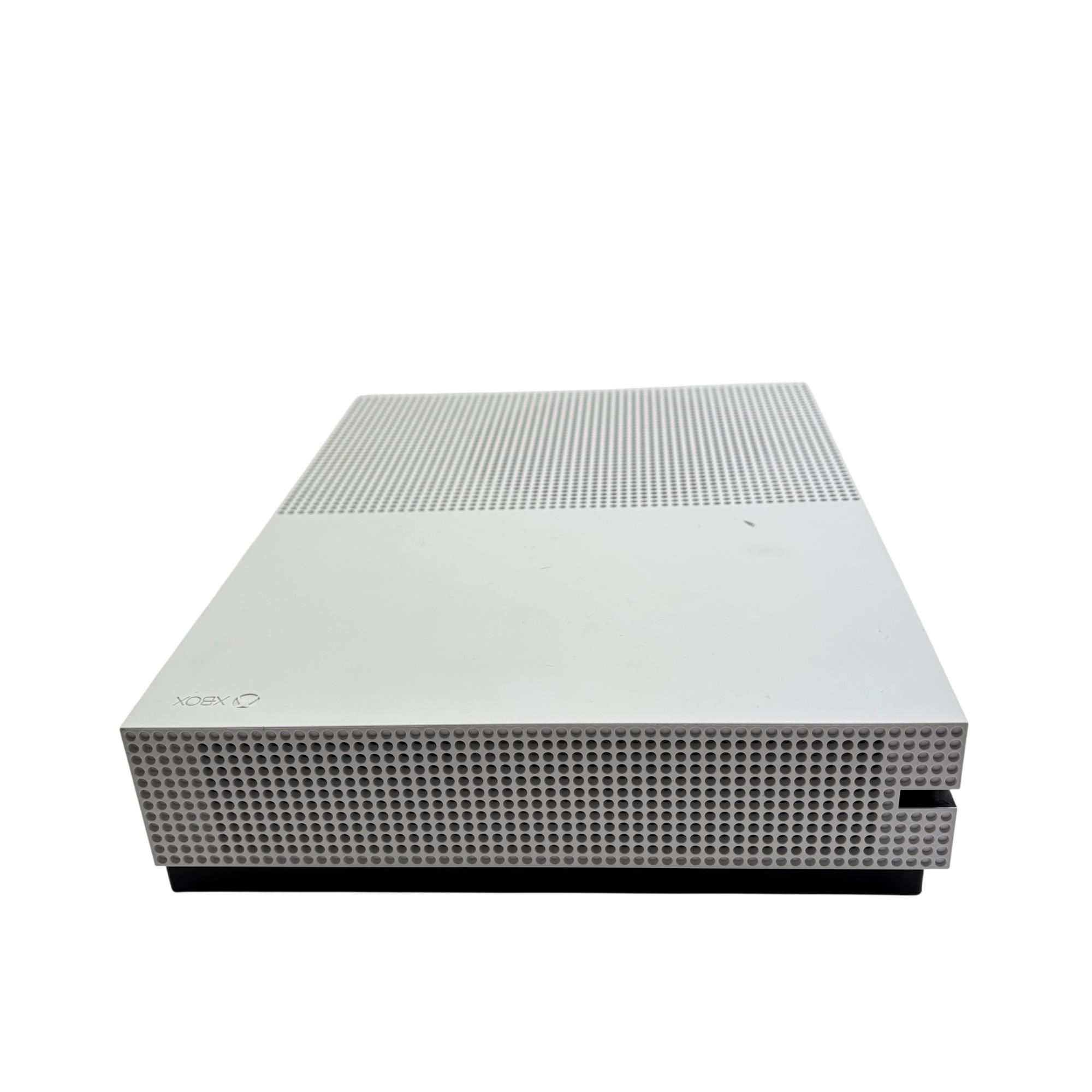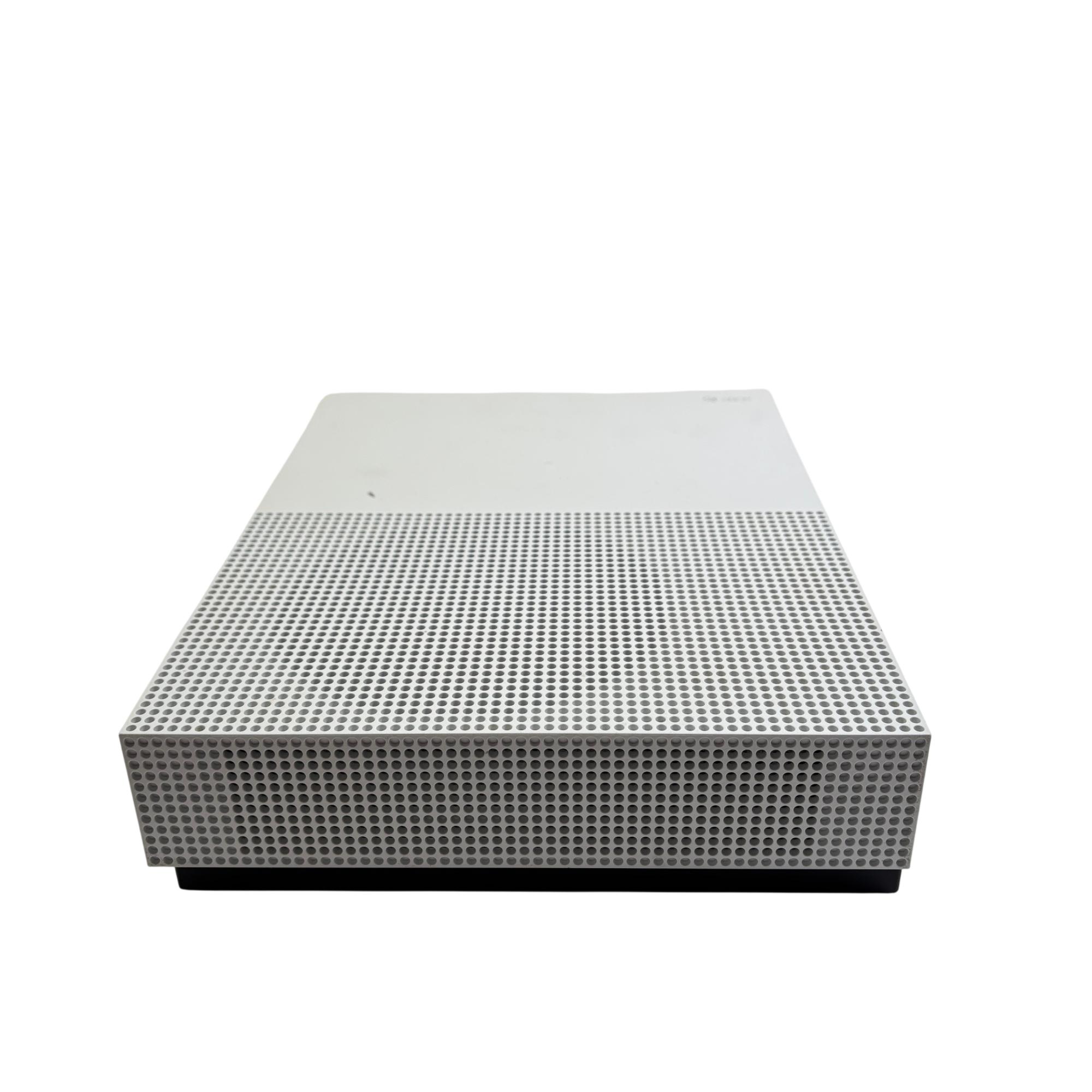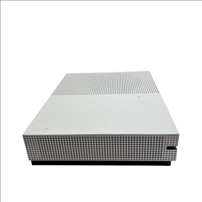 Microsoft Xbox One S 1TB Model 1681 White Gaming Console offers a sleek, compact design with a distinctive white exterior featuring ventilation holes for optimal cooling. This console supports a large storage capacity of 1TB, providing ample space for games and media. Its streamlined design includes a black power cord, making it an efficient and stylish choice for gaming enthusiasts.