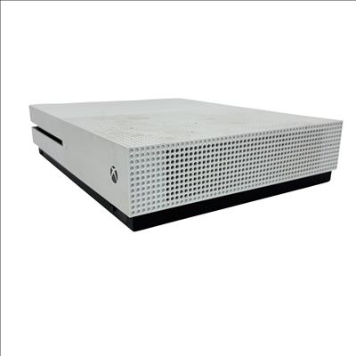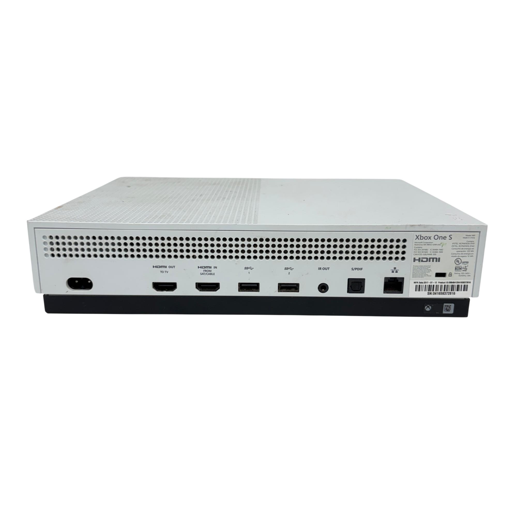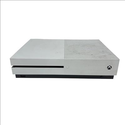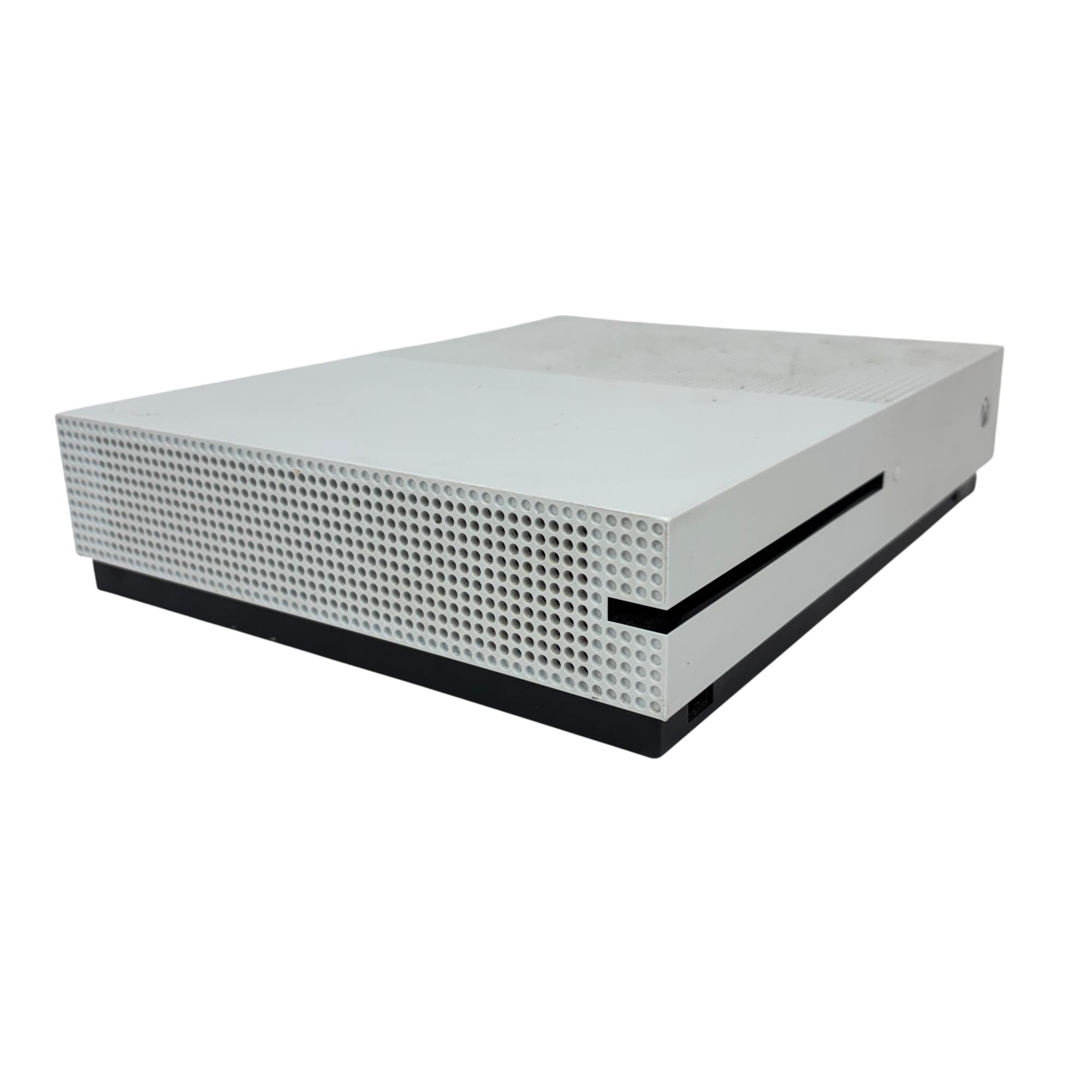 The Microsoft Xbox One S Gaming Console offers a sleek and compact design with a matte white finish and a black logo accent. This console features a 500GB hard drive, providing ample storage for games and media, and supports a wide range of video game titles and entertainment apps. Its ventilation system and textured surface are designed for optimal cooling during extended gaming sessions.