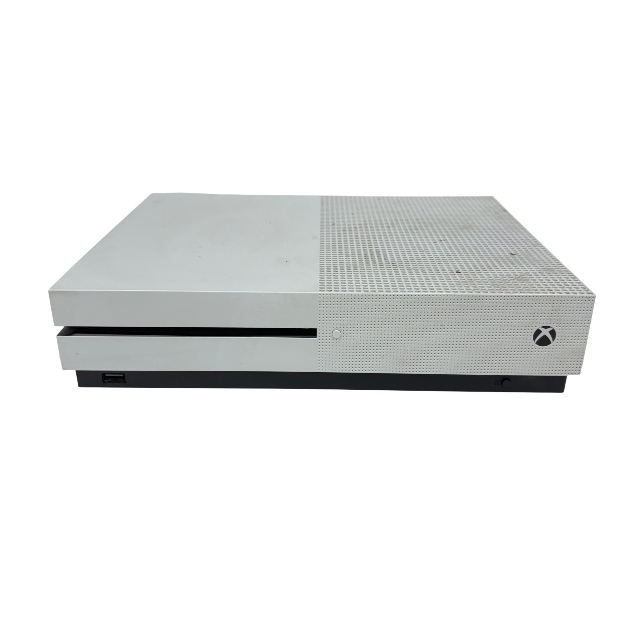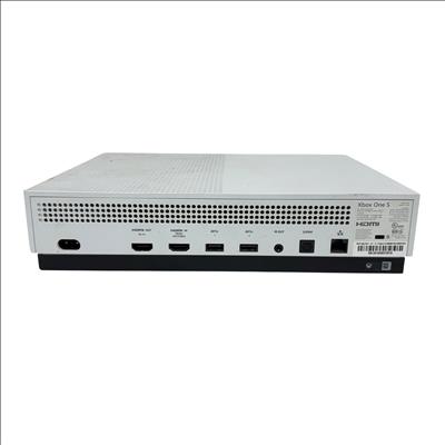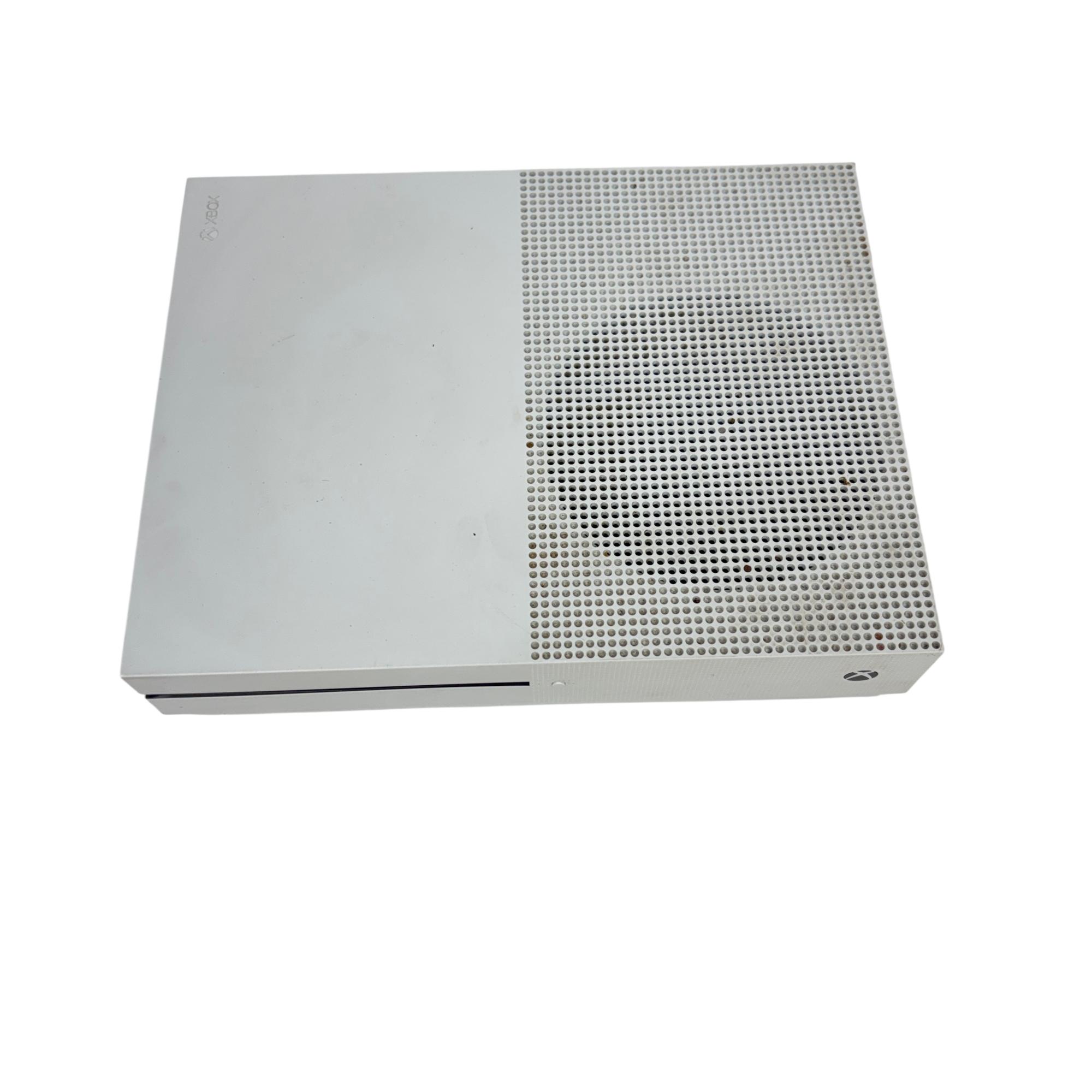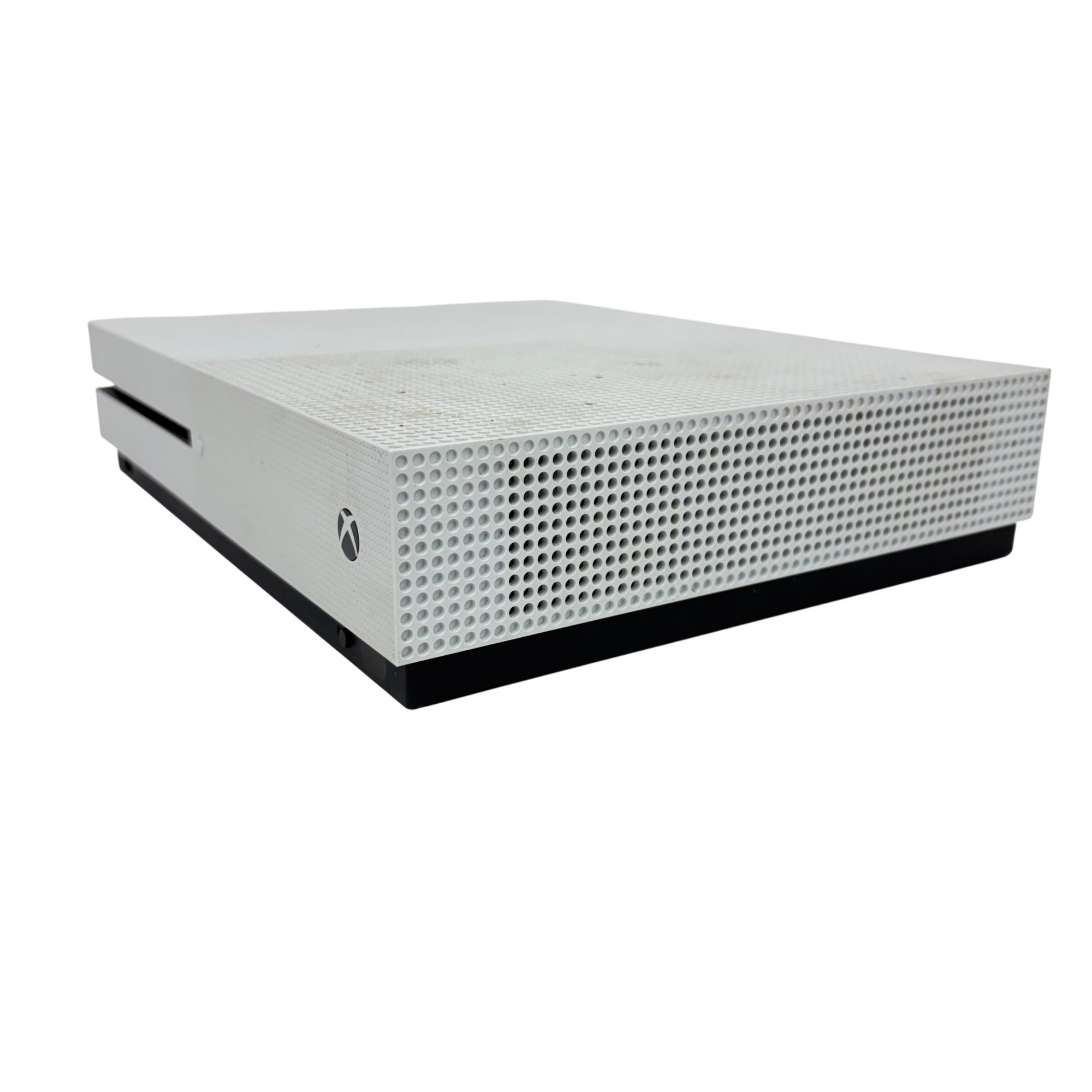 The Microsoft Xbox One S Gaming Console offers a sleek and compact design with a matte white finish and a black logo accent. This console features a 500GB hard drive, providing ample storage for games and media, and supports a wide range of video game titles and entertainment apps. Its ventilation system and textured surface are designed for optimal cooling during extended gaming sessions.