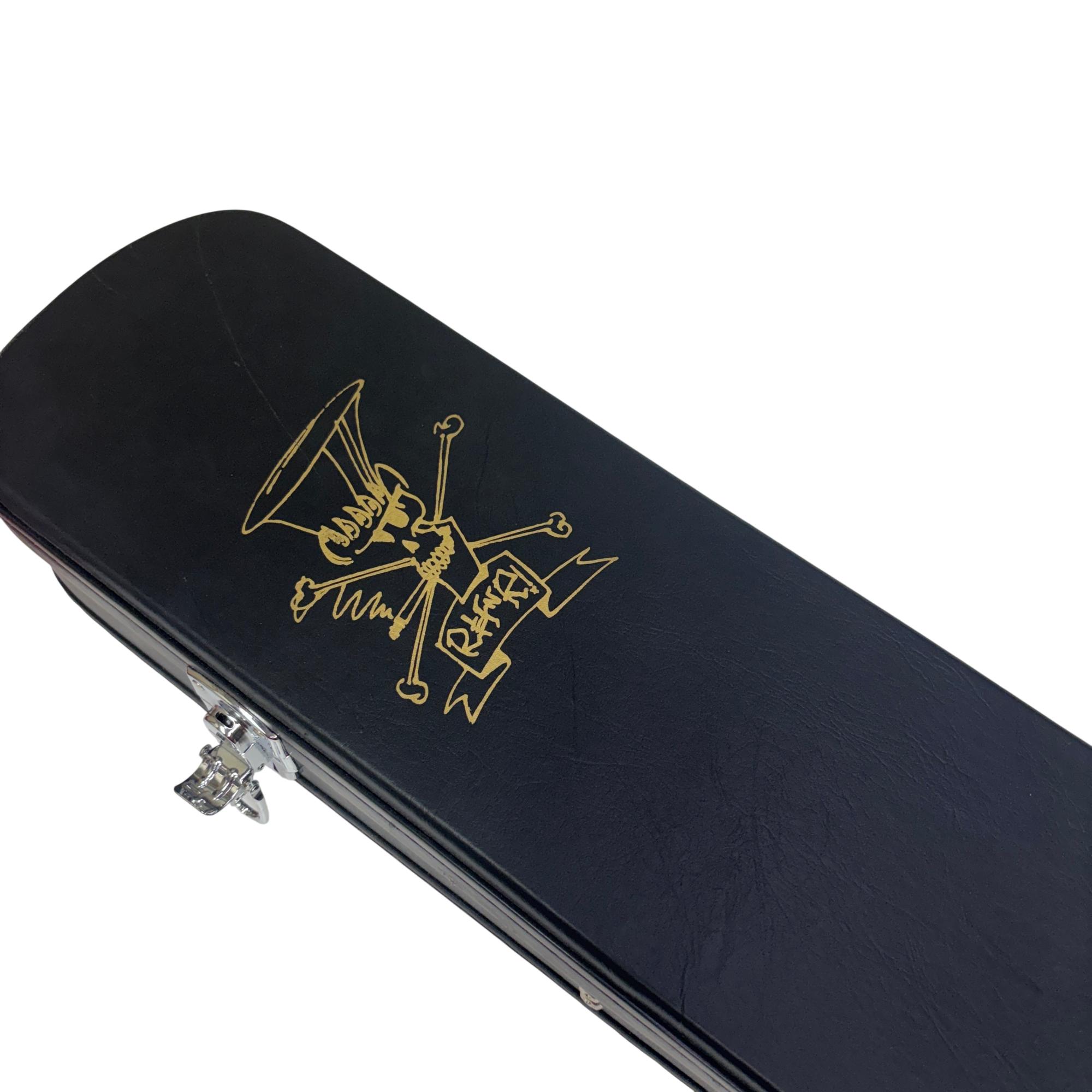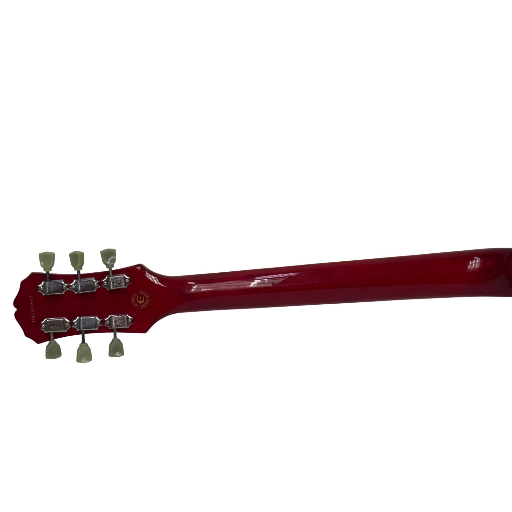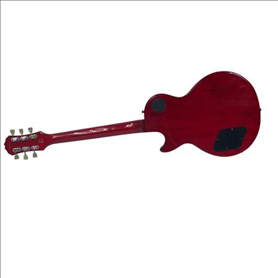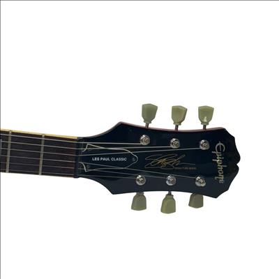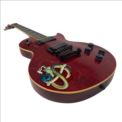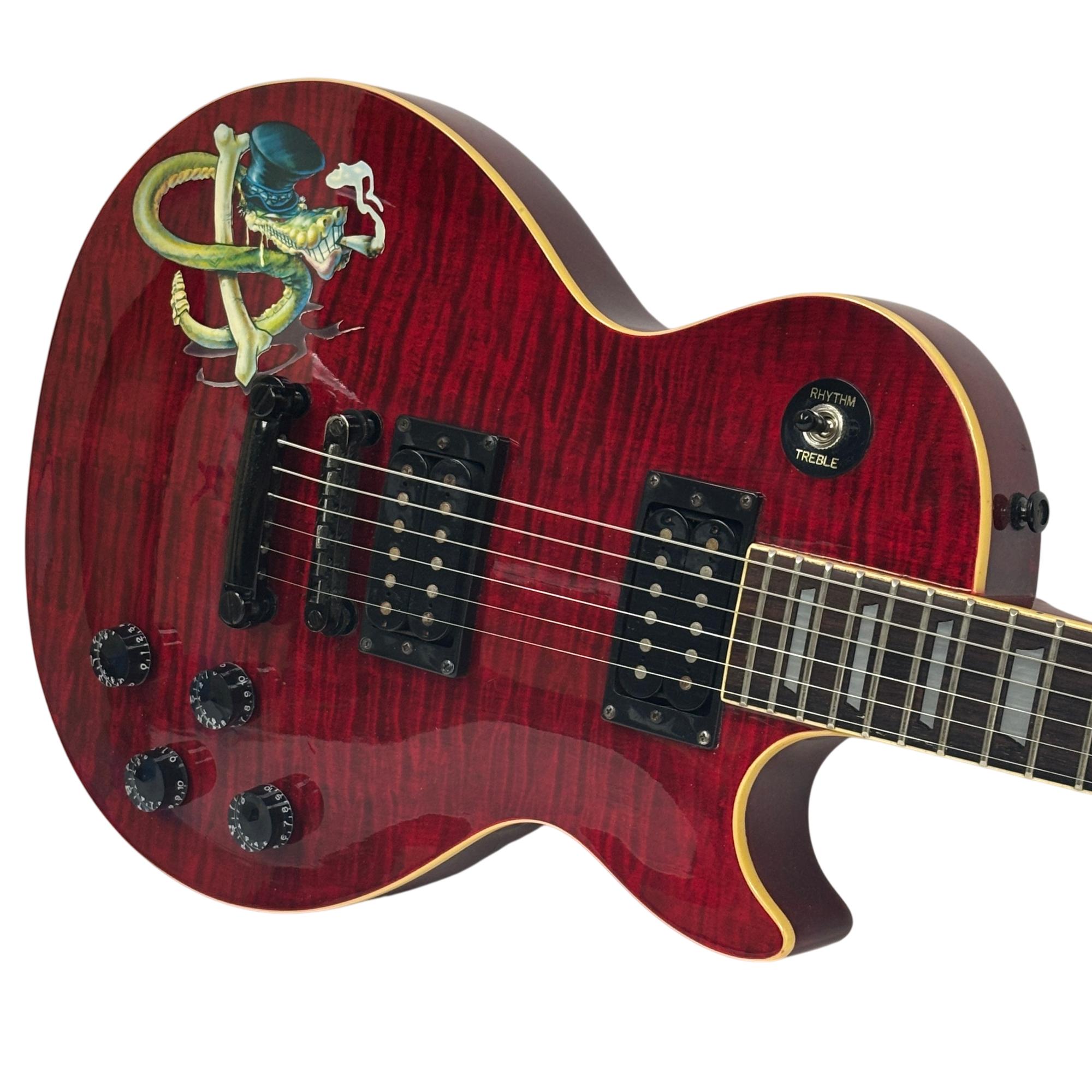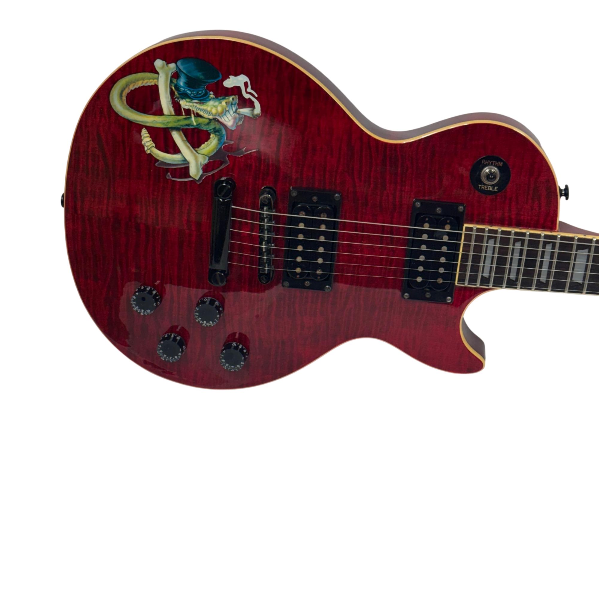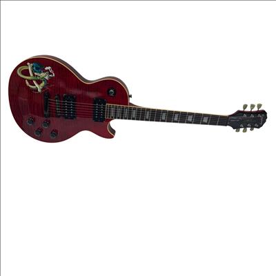 The Epiphone Les Paul Classic Slash Signature Snakepit Limited Edition (1997) is a striking electric guitar featuring a red finish with black strings and detailed gold hardware. This model showcases a classic Les Paul body design with distinctive "Snakepit" aesthetics and is known for its rich tonal versatility suitable for various music styles.
