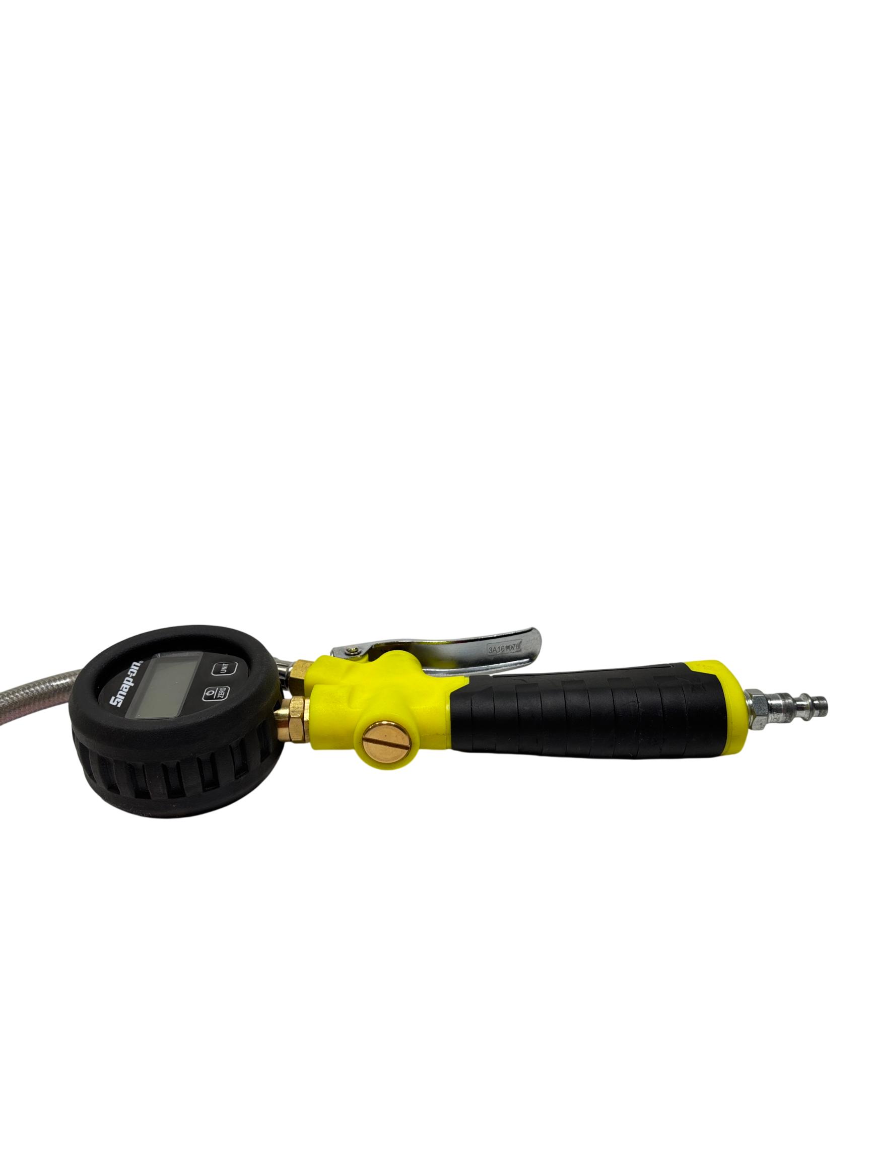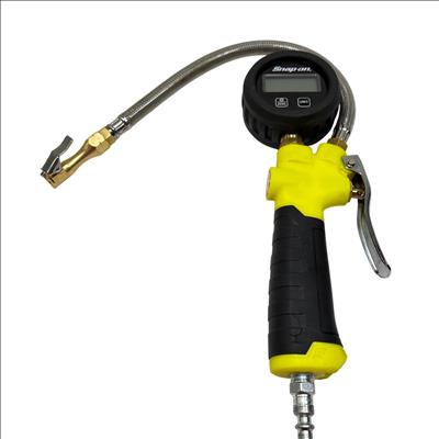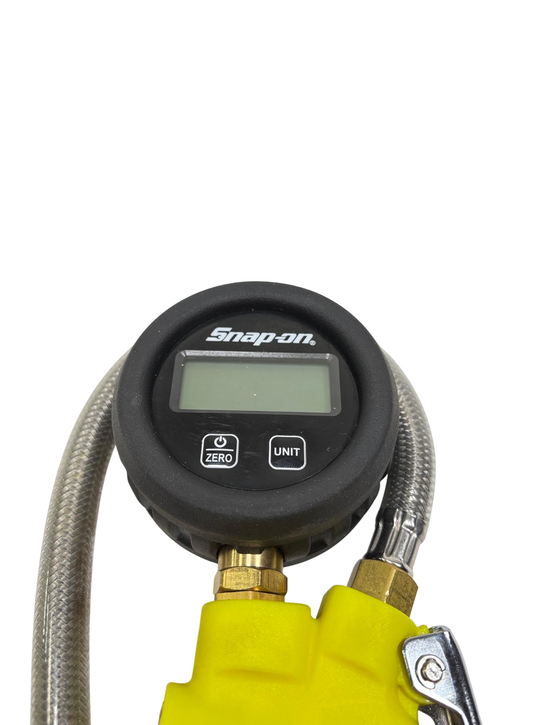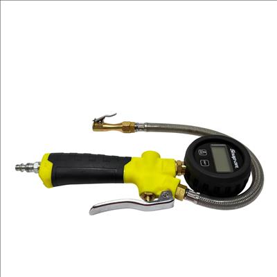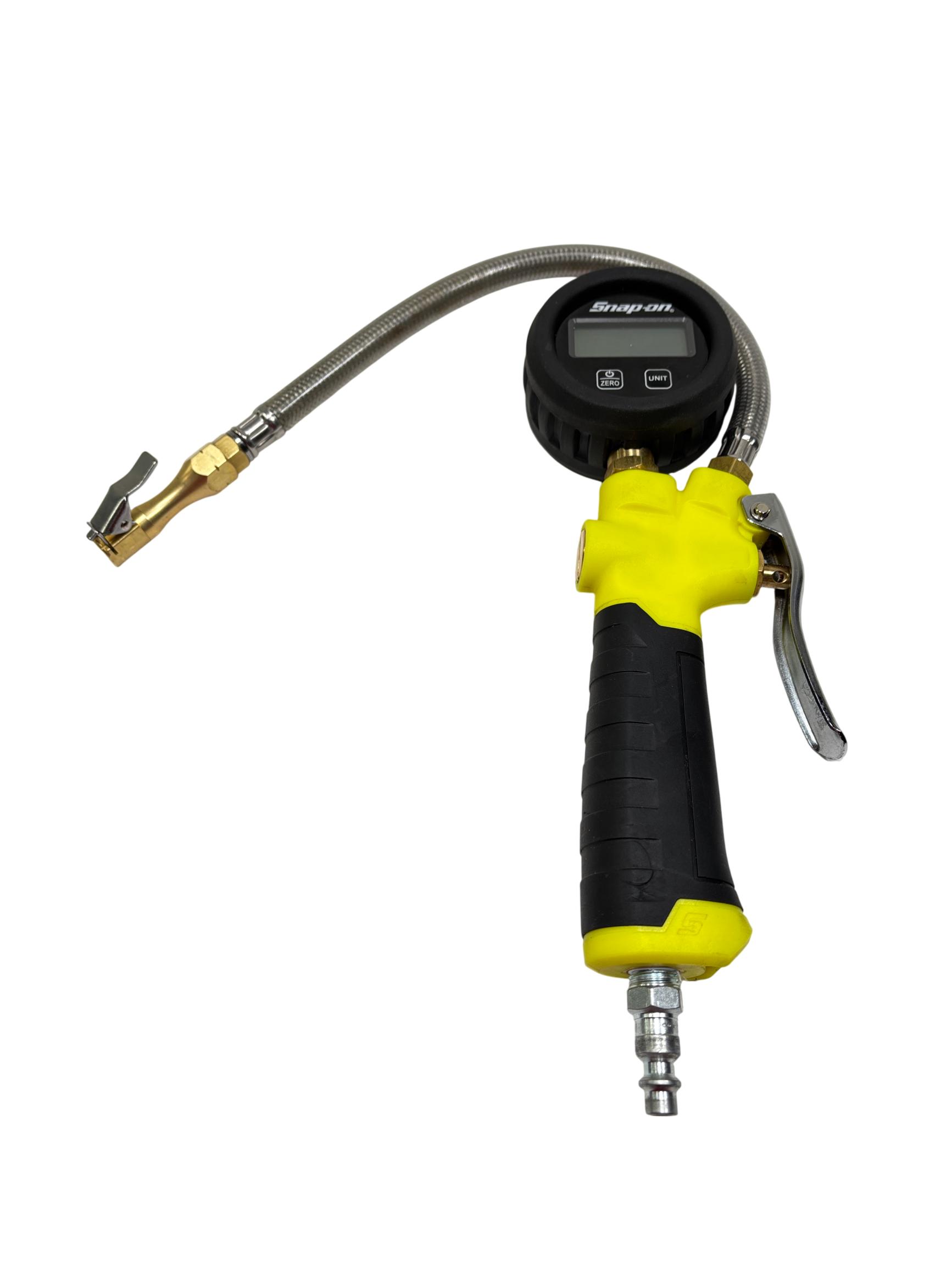 Snap-on TPGDL2000HV Heavy Duty Digital Tire Inflator with Gauge delivers precise tire pressure measurements with its integrated digital gauge, capable of handling pressures up to 200 PSI. This tool features a durable design combining yellow and black elements for easy visibility and ergonomic handling, making it ideal for professional and home use in tire maintenance and inflation tasks.