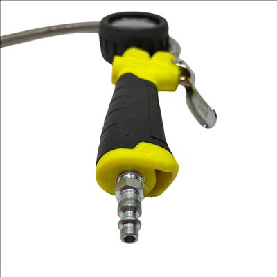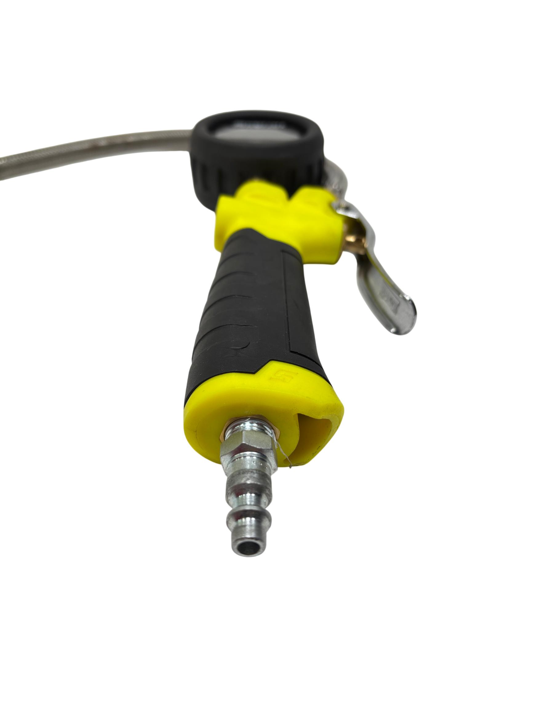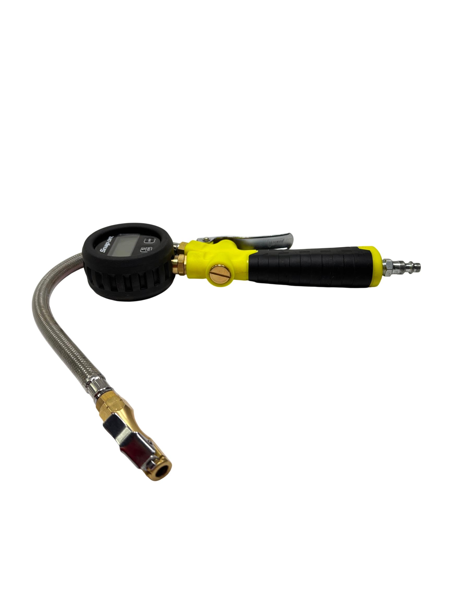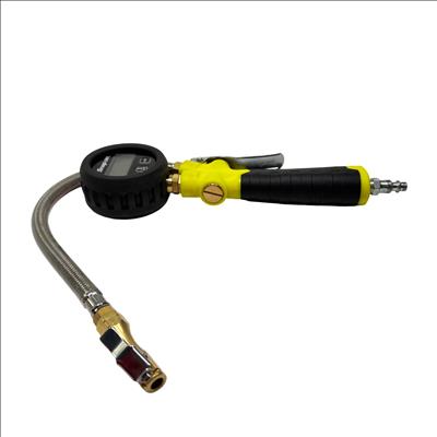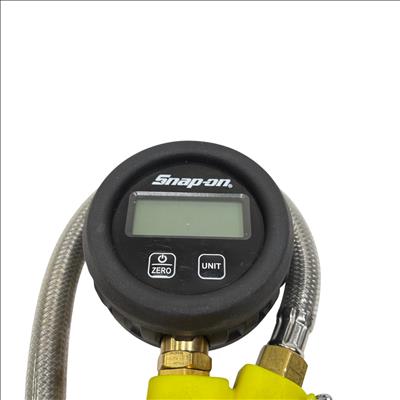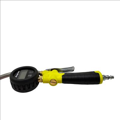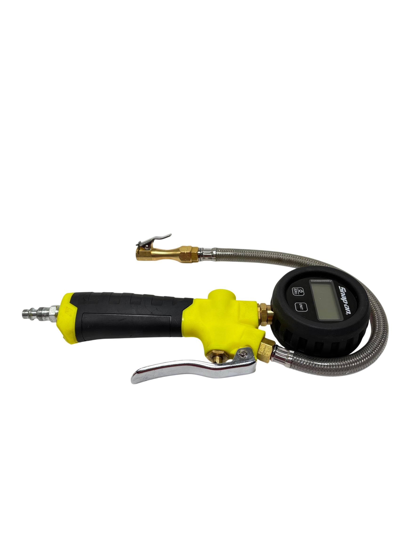 Snap-on TPGDL2000HV Heavy Duty Digital Tire Inflator with Gauge delivers precise tire pressure measurements with its integrated digital gauge, capable of handling pressures up to 200 PSI. This tool features a durable design combining yellow and black elements for easy visibility and ergonomic handling, making it ideal for professional and home use in tire maintenance and inflation tasks.