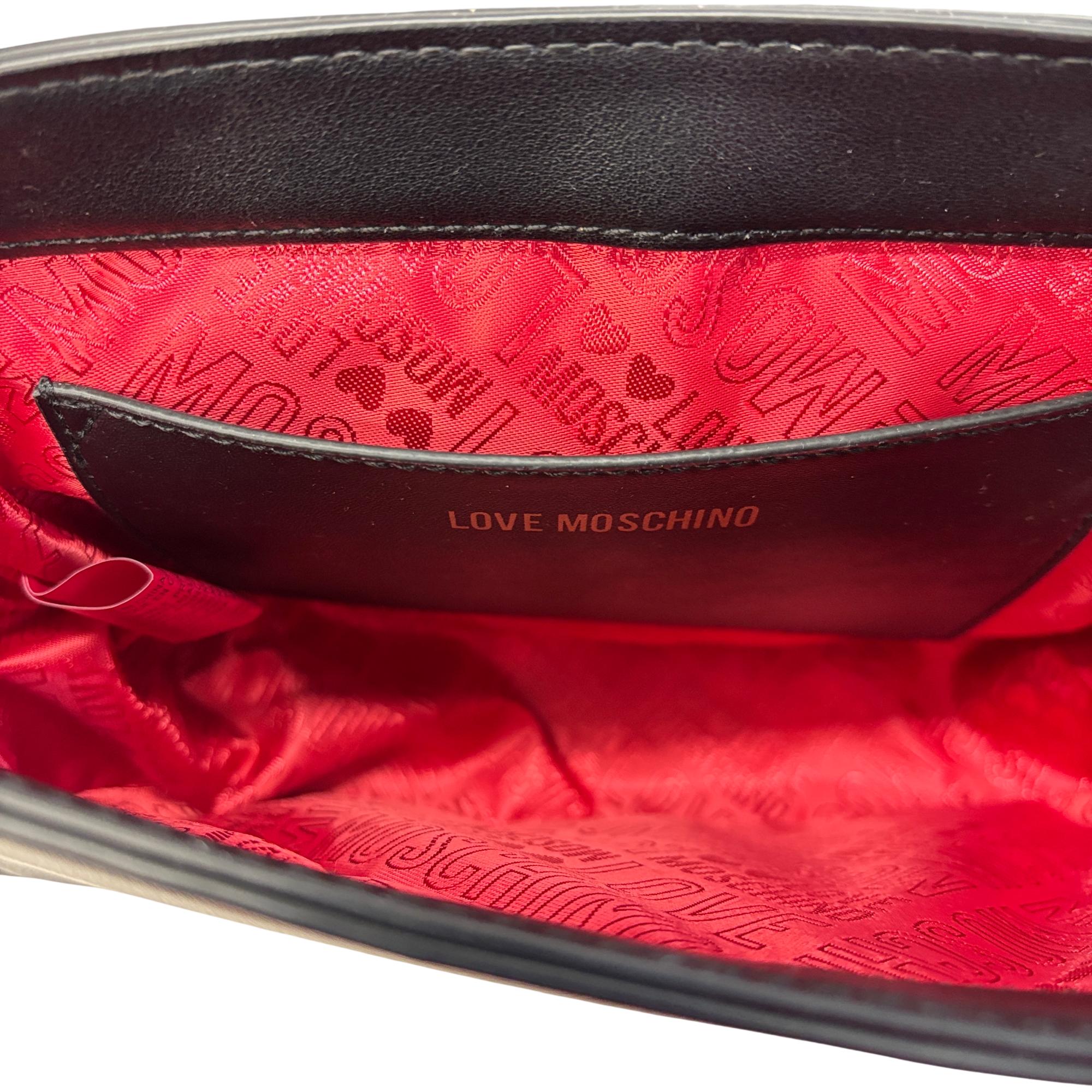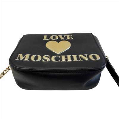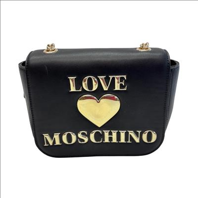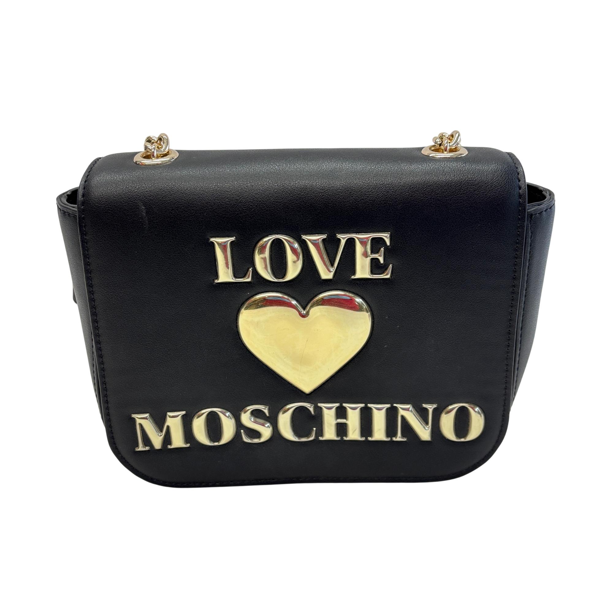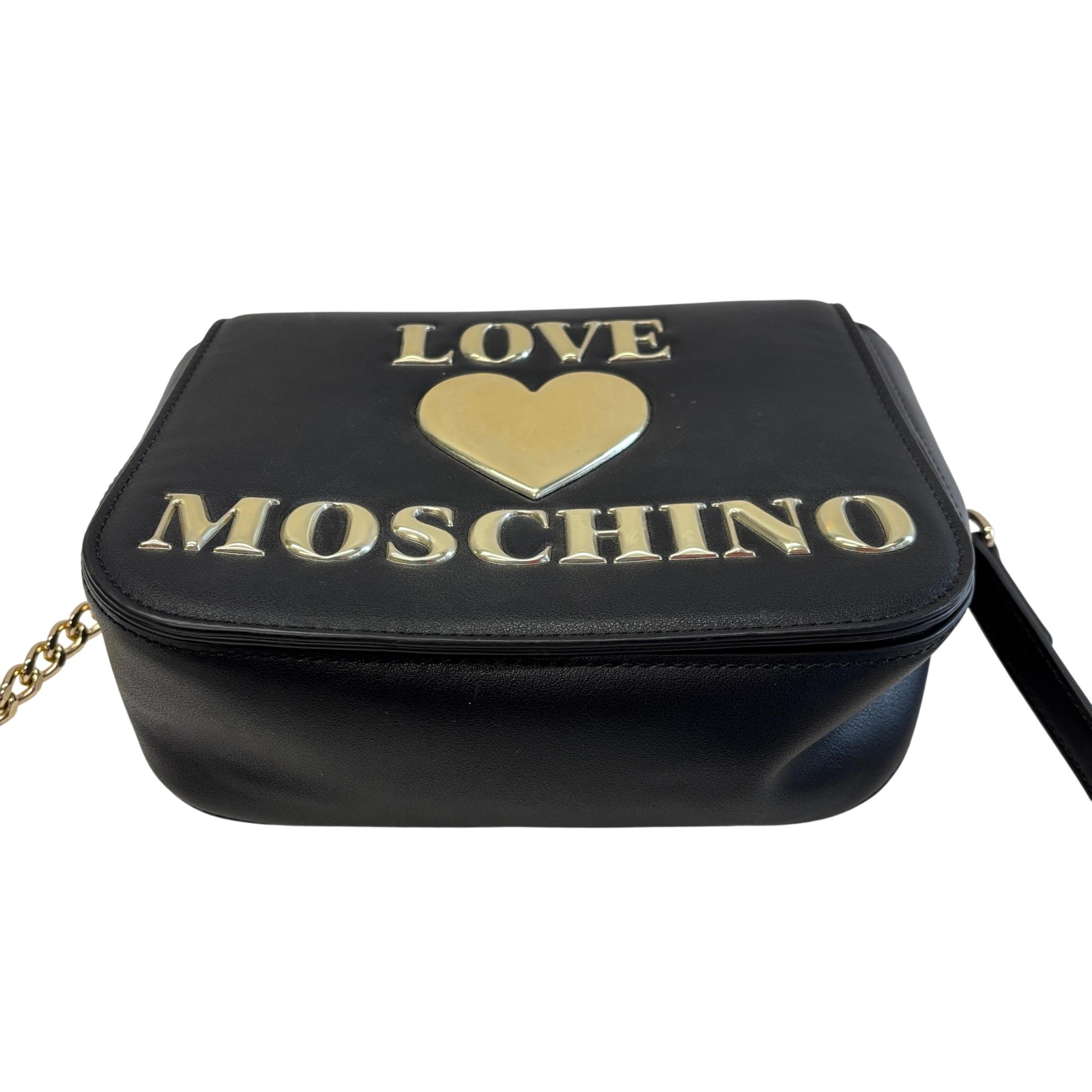 Love Moschino Heart Love Crossbody Bag, Black with Gold Chain features a sleek black leather design accented by a distinctive gold chain and bold gold lettering. This stylish fashion accessory combines modern elegance with practical crossbody convenience, making it perfect for both casual and upscale occasions.