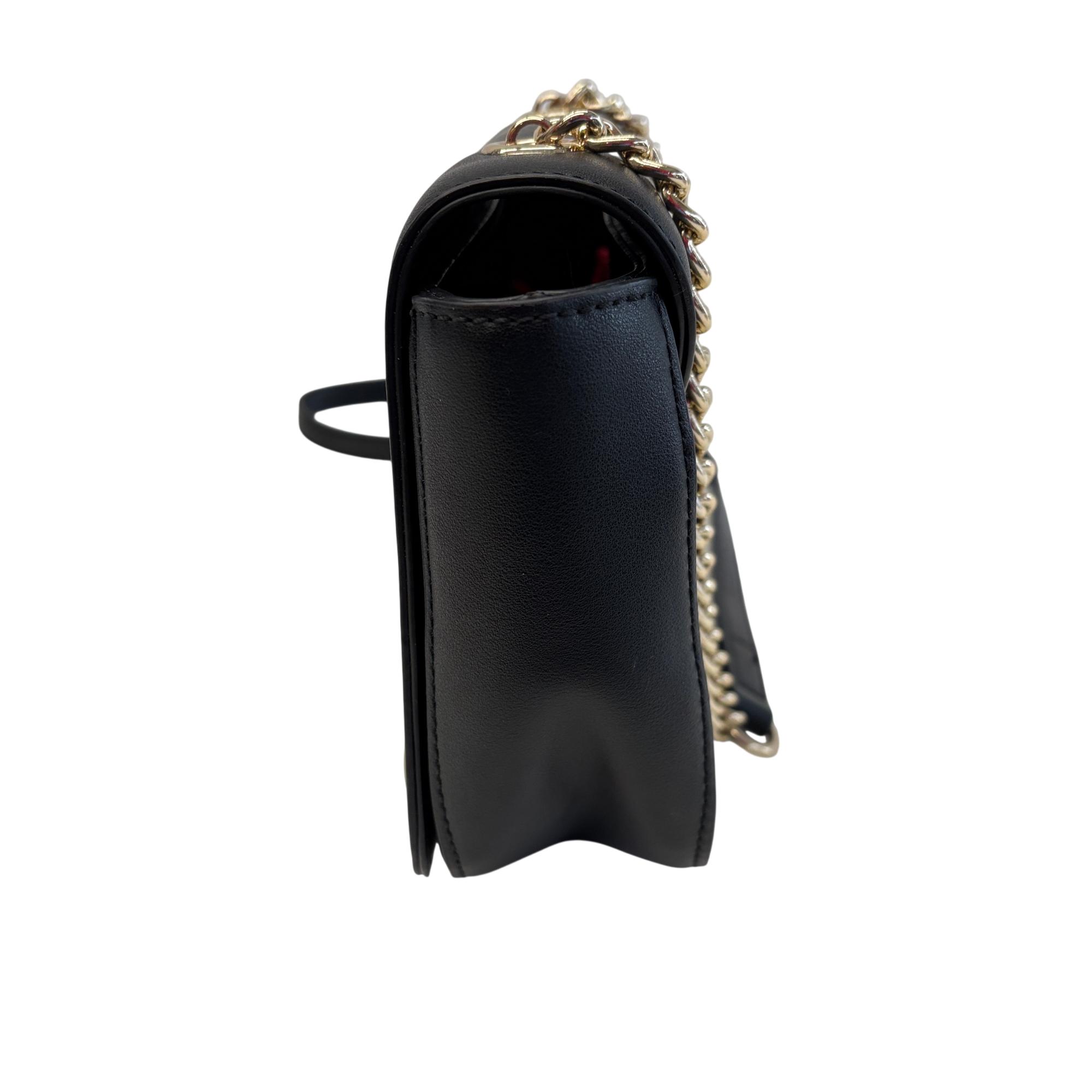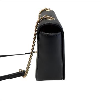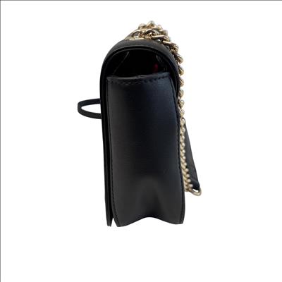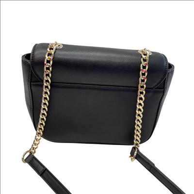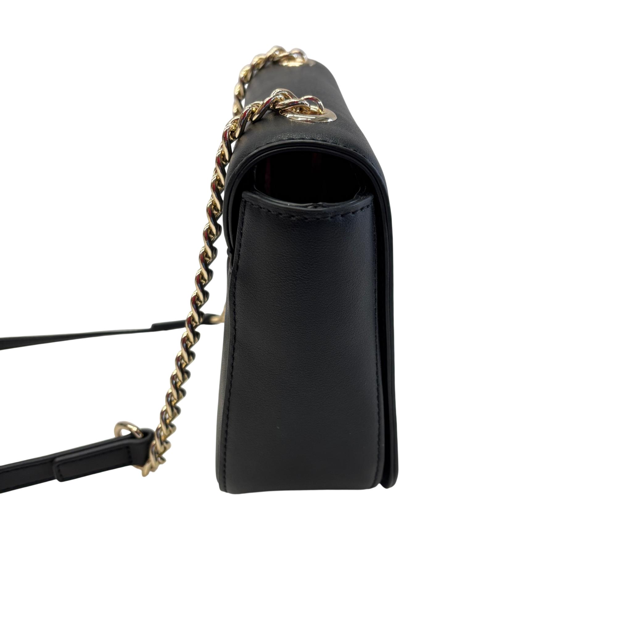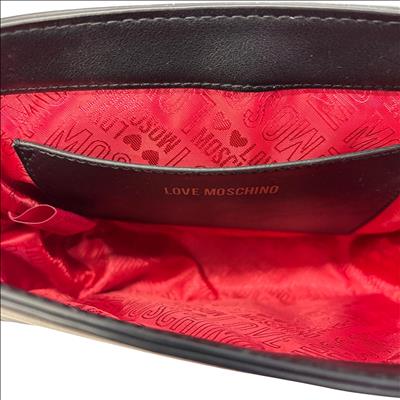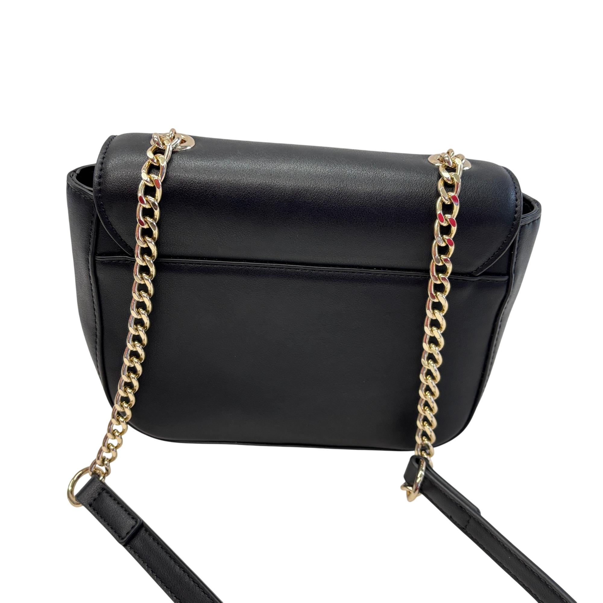 Love Moschino Heart Love Crossbody Bag, Black with Gold Chain features a sleek black leather design accented by a distinctive gold chain and bold gold lettering. This stylish fashion accessory combines modern elegance with practical crossbody convenience, making it perfect for both casual and upscale occasions.
