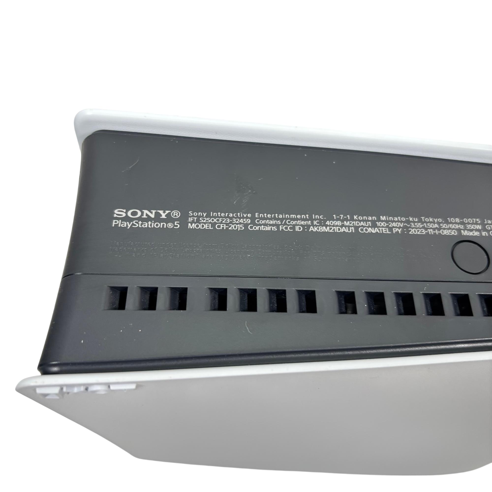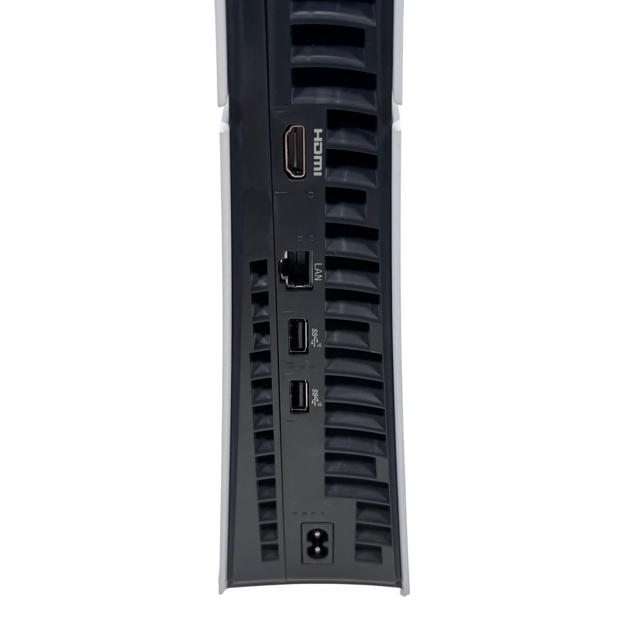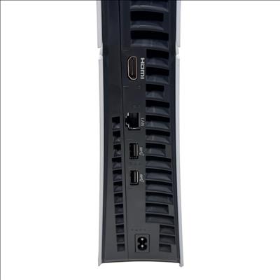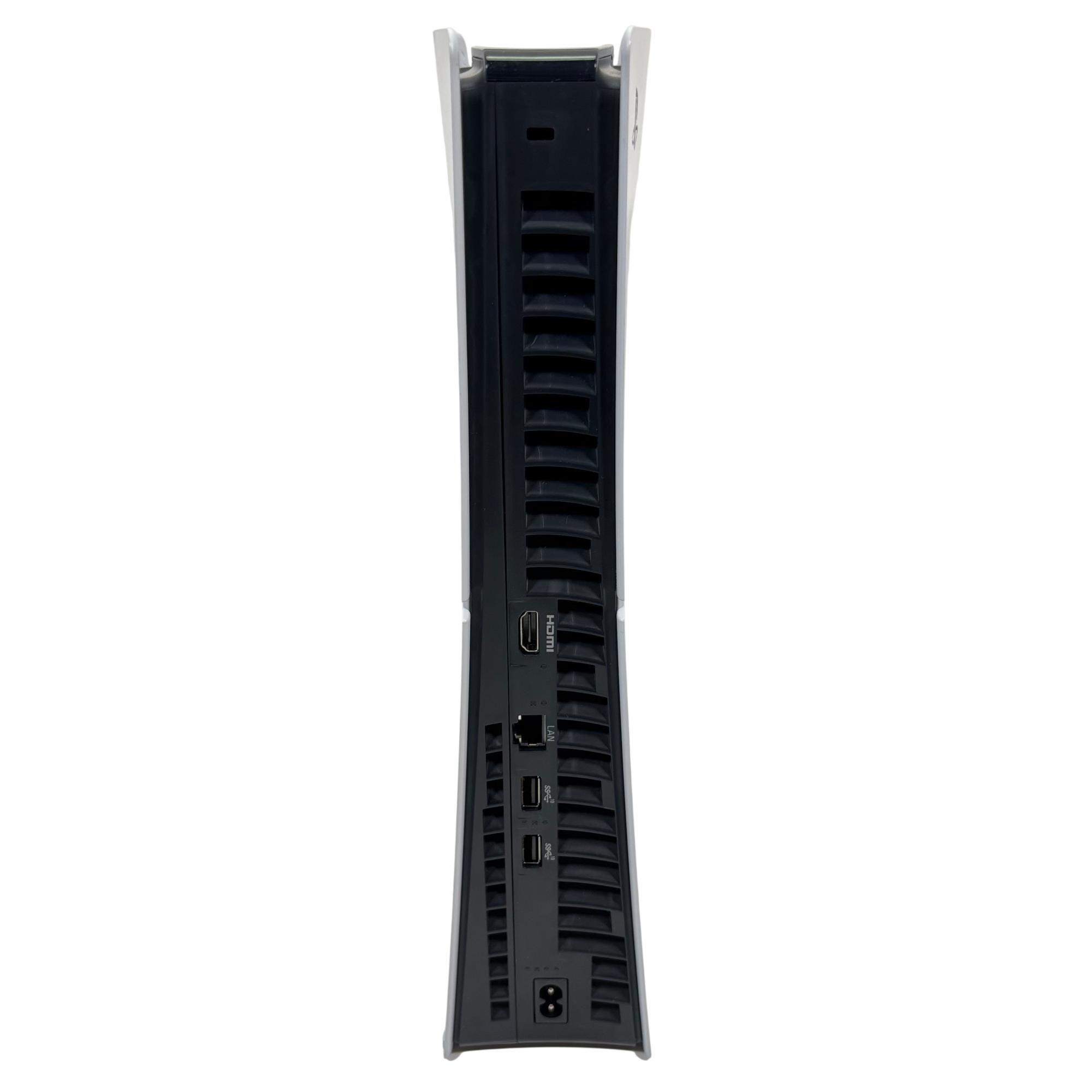 Sony PlayStation 5 Slim Digital Edition Console features a sleek black and white design with a compact slim profile optimized for vertical orientation. It offers multiple rear ports including HDMI, LAN, and USB connectors, ensuring seamless connectivity for high-definition gaming and online multiplayer experiences. This console delivers advanced performance tailored for immersive next-generation gaming with enhanced graphics and fast load times.