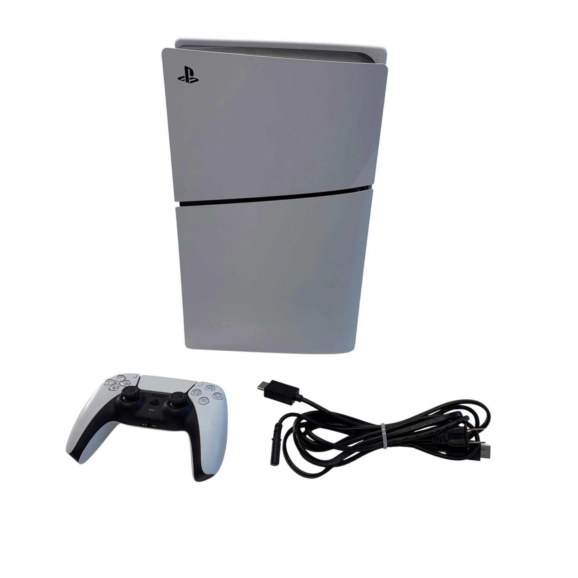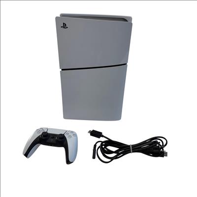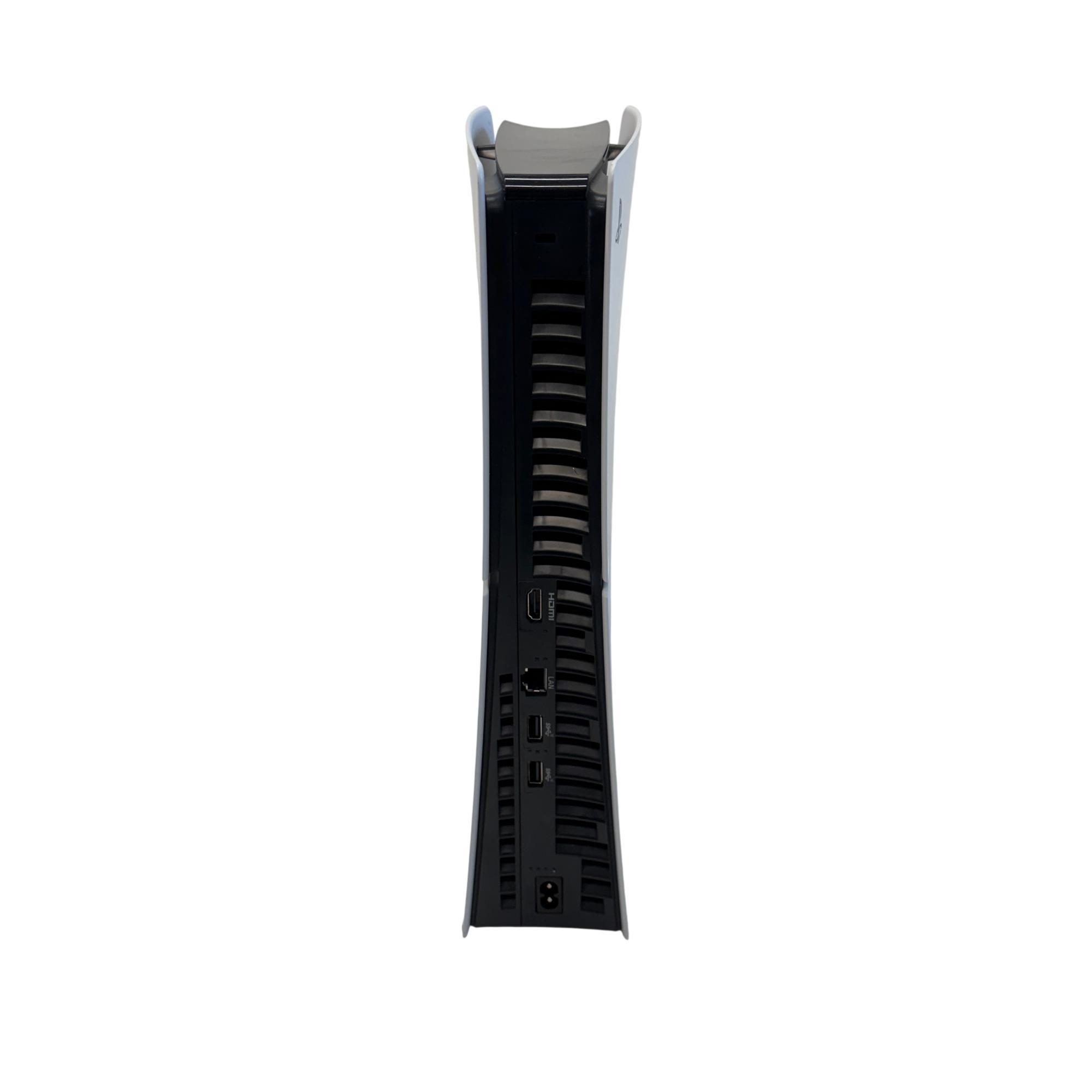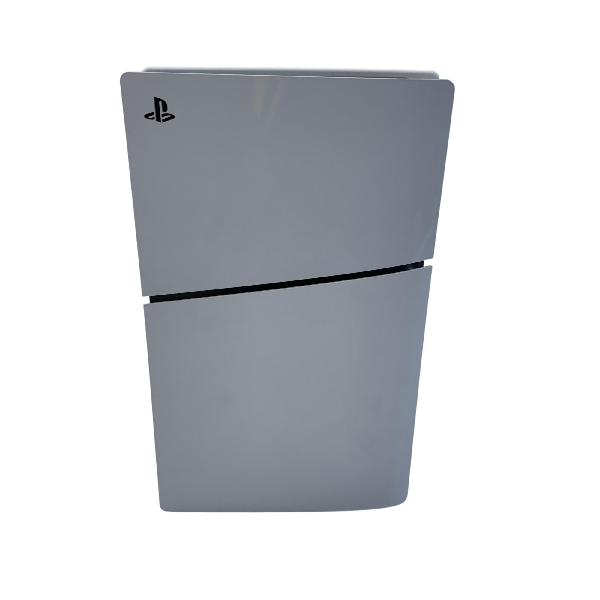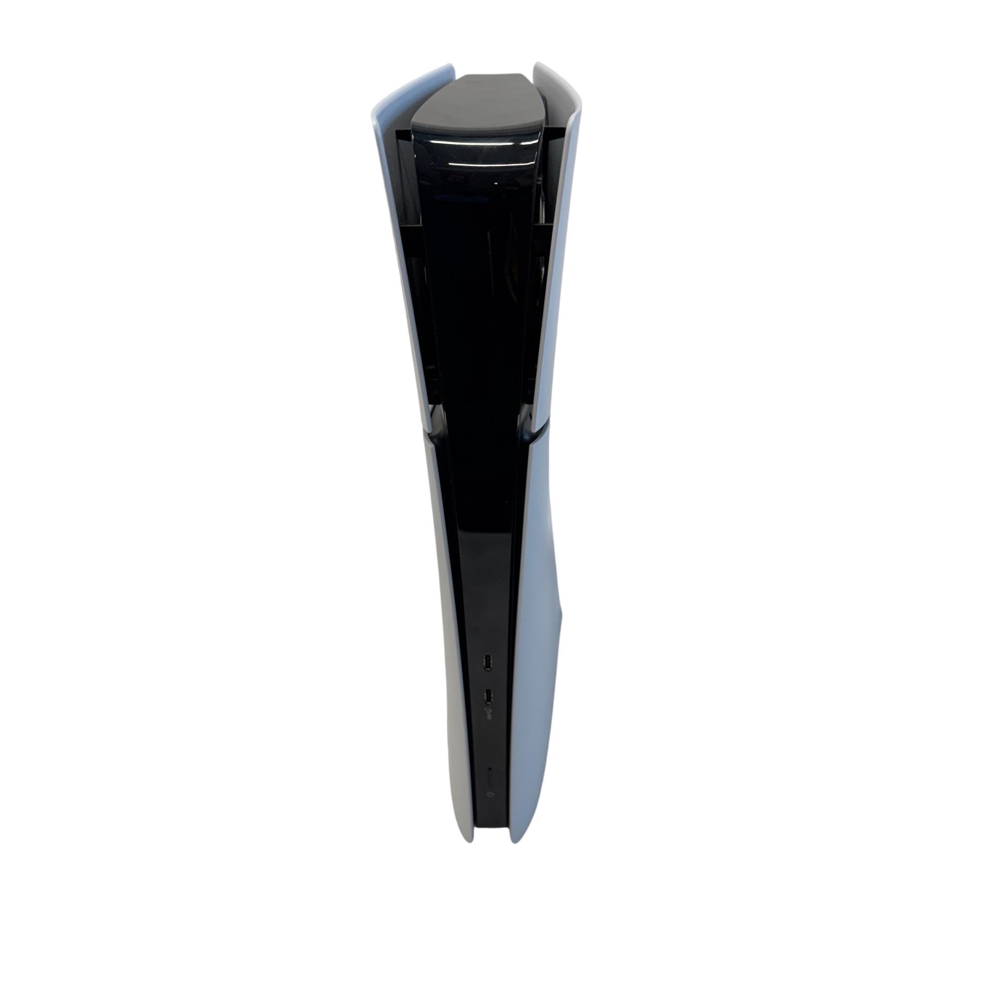 Sony PlayStation 5 Slim Digital Edition 1TB (CFI-2015) features a sleek and modern design with a vertical orientation and a distinctive white exterior accented by black details. This gaming console supports 4K resolution, delivering immersive and high-quality gameplay experiences ideal for entertainment and technology enthusiasts. The compact form factor makes it a stylish addition to any gaming setup while offering ample storage capacity for a wide range of games.