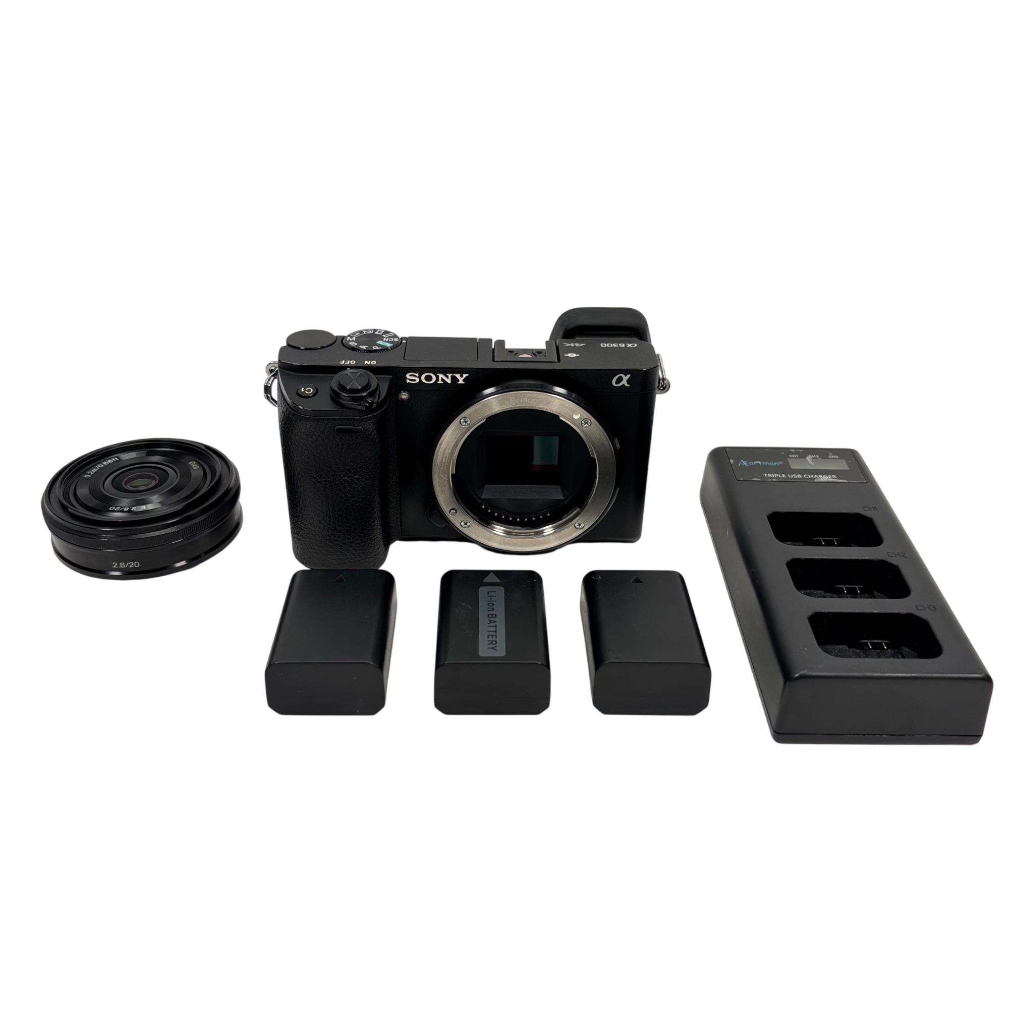 Sony Alpha a6300 mirrorless digital camera features a 24.2MP APS-C Exmor CMOS sensor and BIONZ X image processor, delivering high-resolution images with excellent detail and color accuracy. Equipped with an E-mount 20mm f/2.8 prime lens, this camera supports fast hybrid autofocus with 425 phase-detection points, enabling sharp and precise focus for both photos and 4K video recording. Its compact and lightweight design makes it ideal for versatile shooting in various environments.