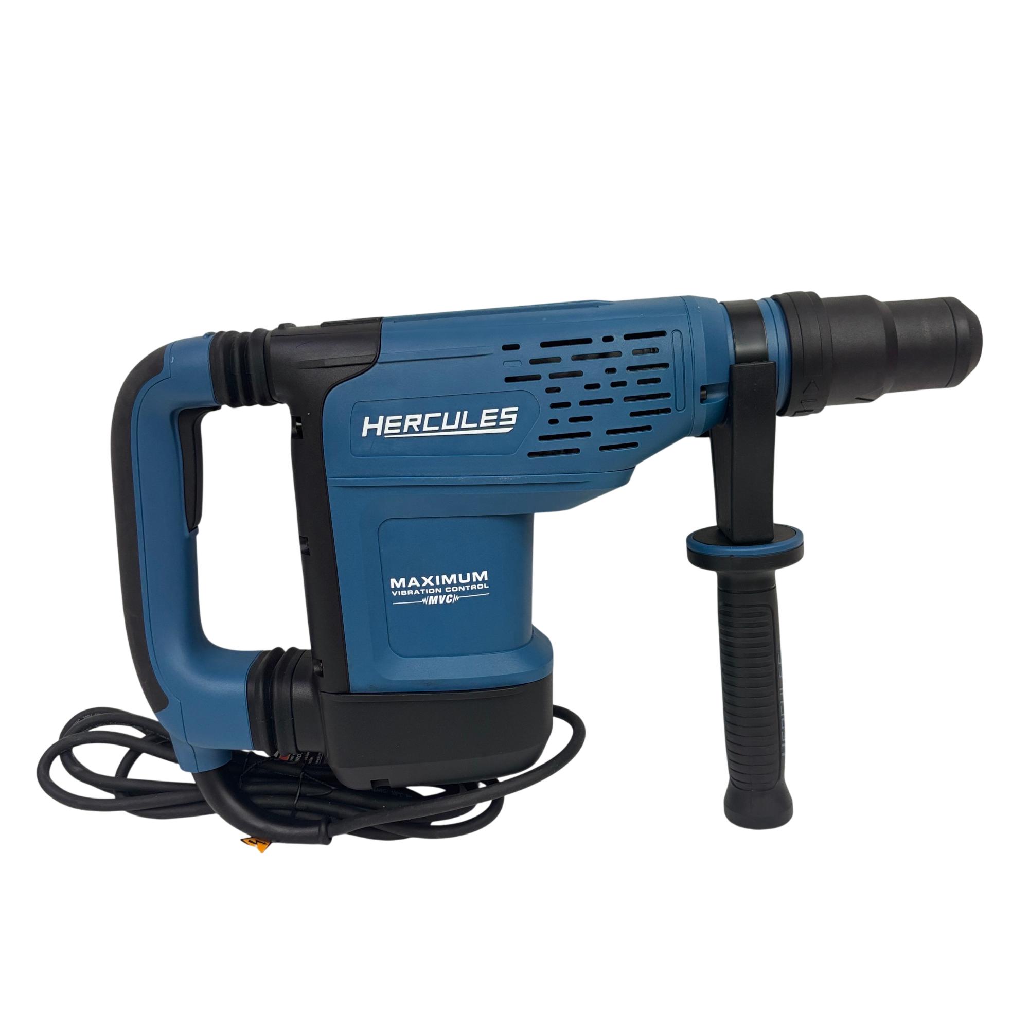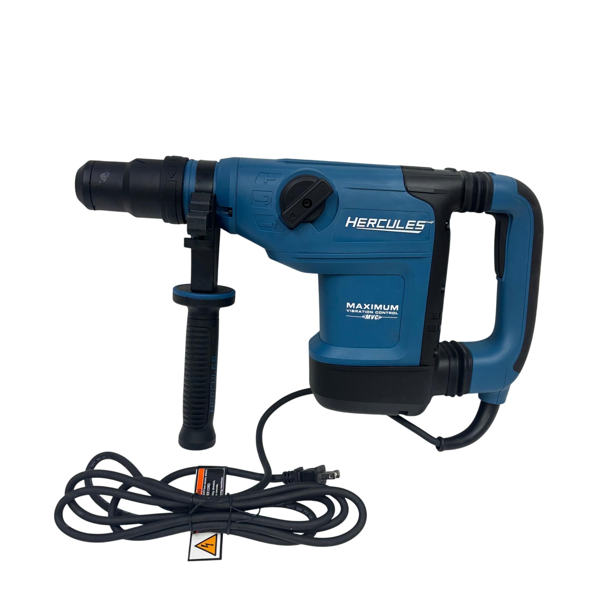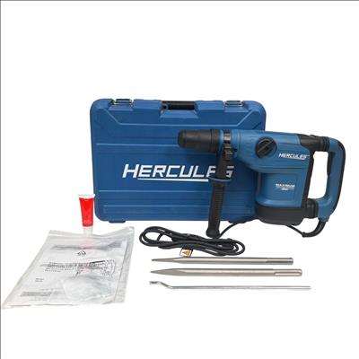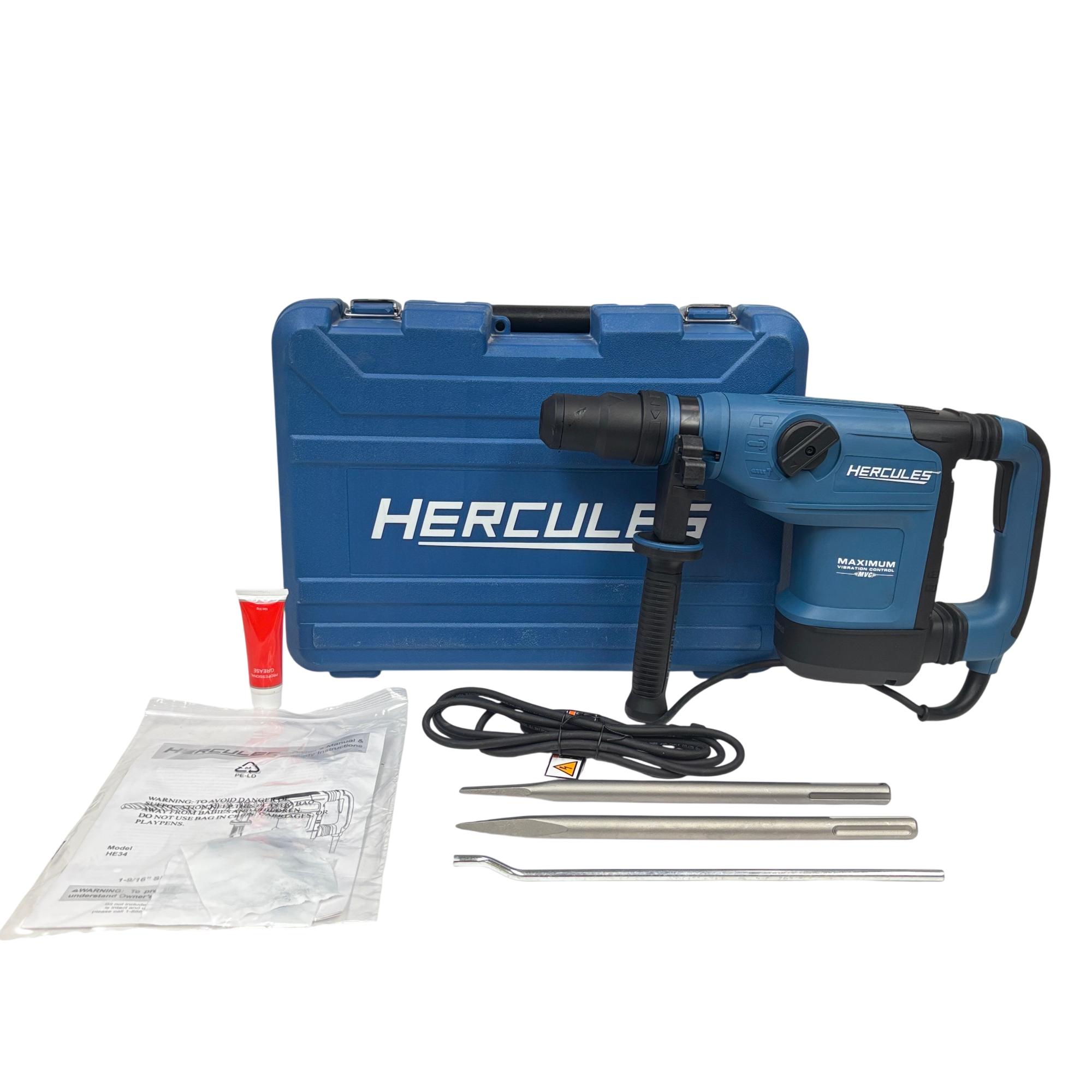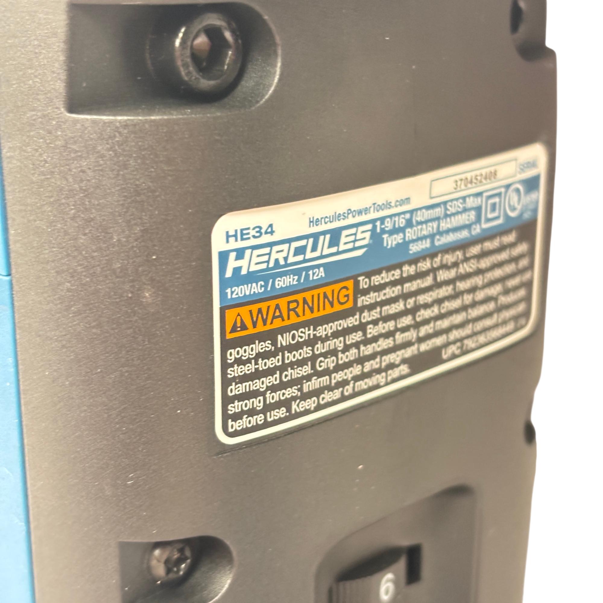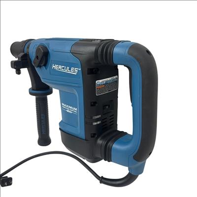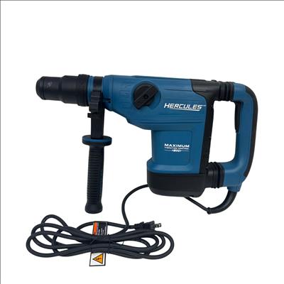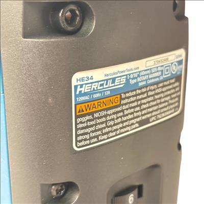 The Hercules HE34 1-9/16" SDS-Max Type Variable-Speed Rotary Hammer is a powerful corded tool designed for heavy-duty drilling and demolition tasks. Featuring a 12 Amp motor, it delivers variable speed control and maximum vibration management to improve user comfort and precision. This rotary hammer is engineered for use with SDS-Max bits, making it ideal for concrete and masonry applications in construction and industrial settings.