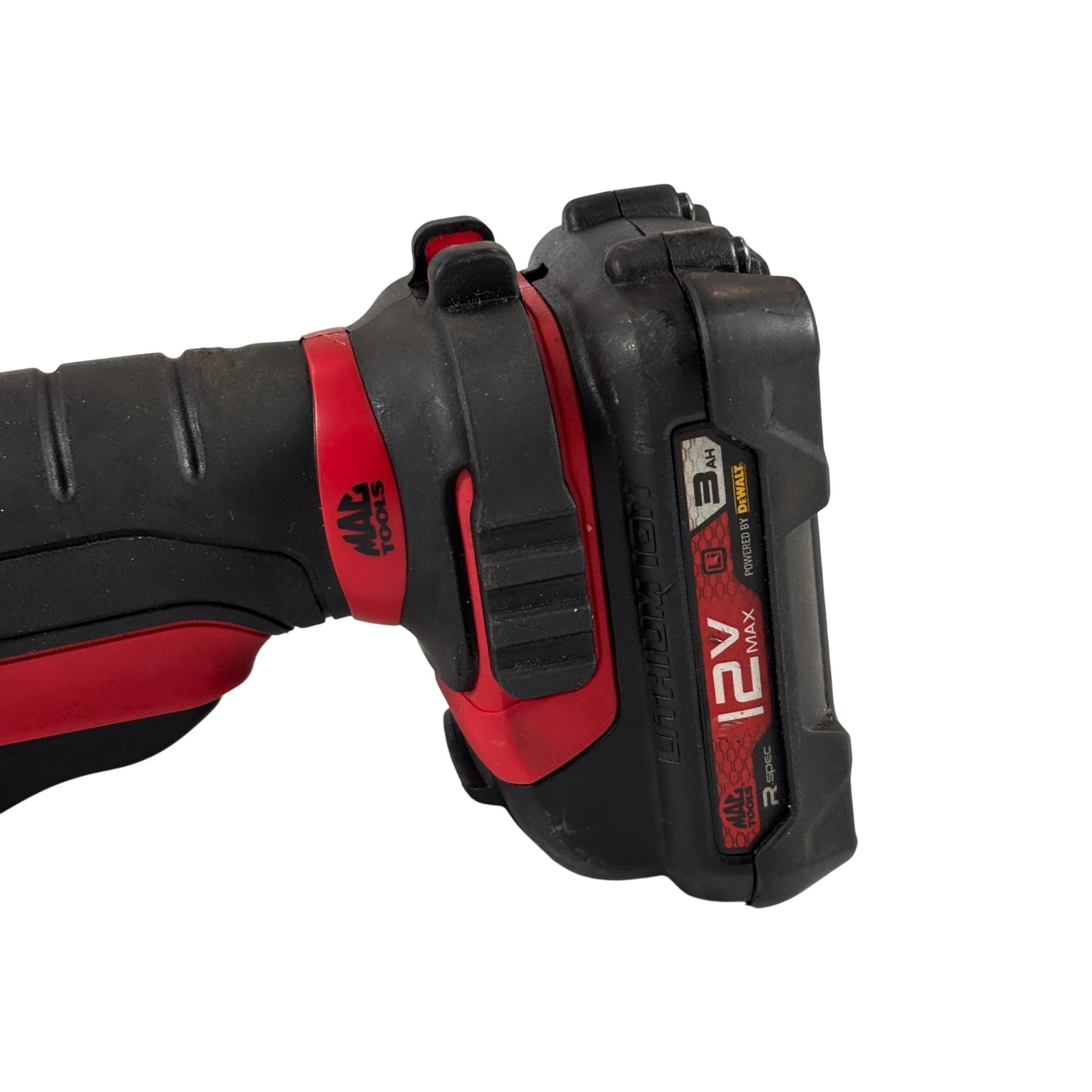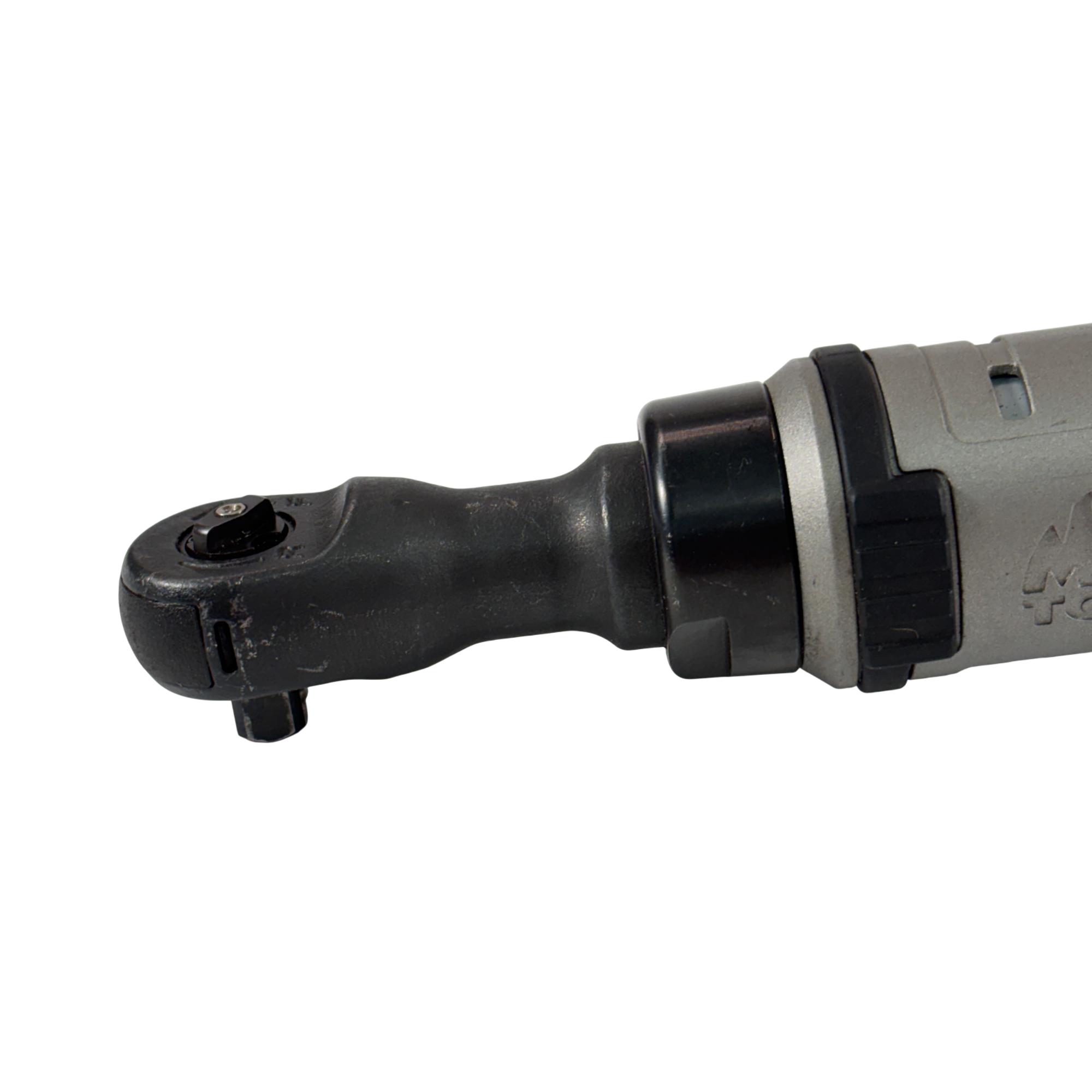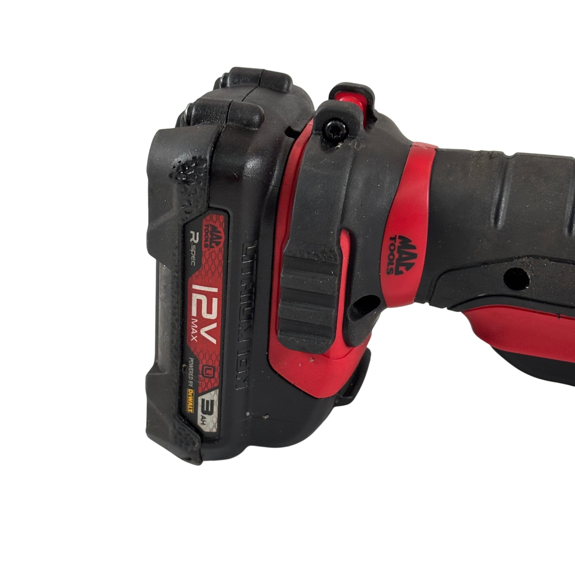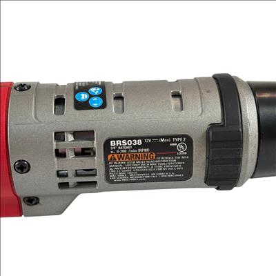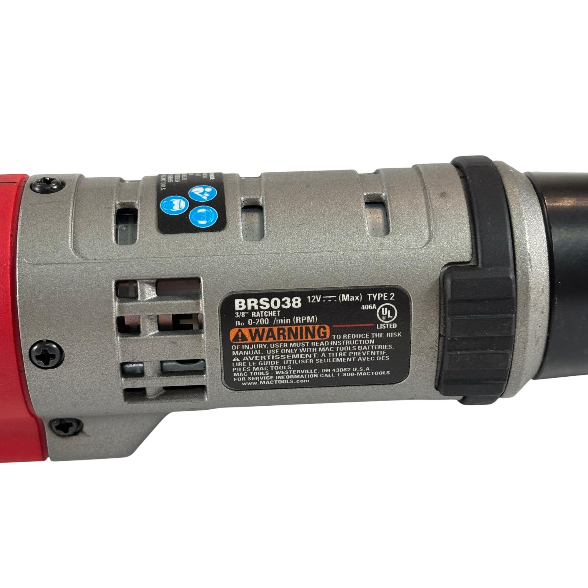 Mac Tools BRS038 12-Volt MAX 3/8" drive cordless ratchet wrench with a forward/reverse lever and variable-speed control for precise operation. Features a closed-head design, die-cast aluminum construction, and a glass-filled nylon body for durability and resistance to automotive fluids. Equipped with an anti-slip ergonomic grip, LED work light, electronic brake, and anti-marring bumper to protect both the tool and work surfaces.
