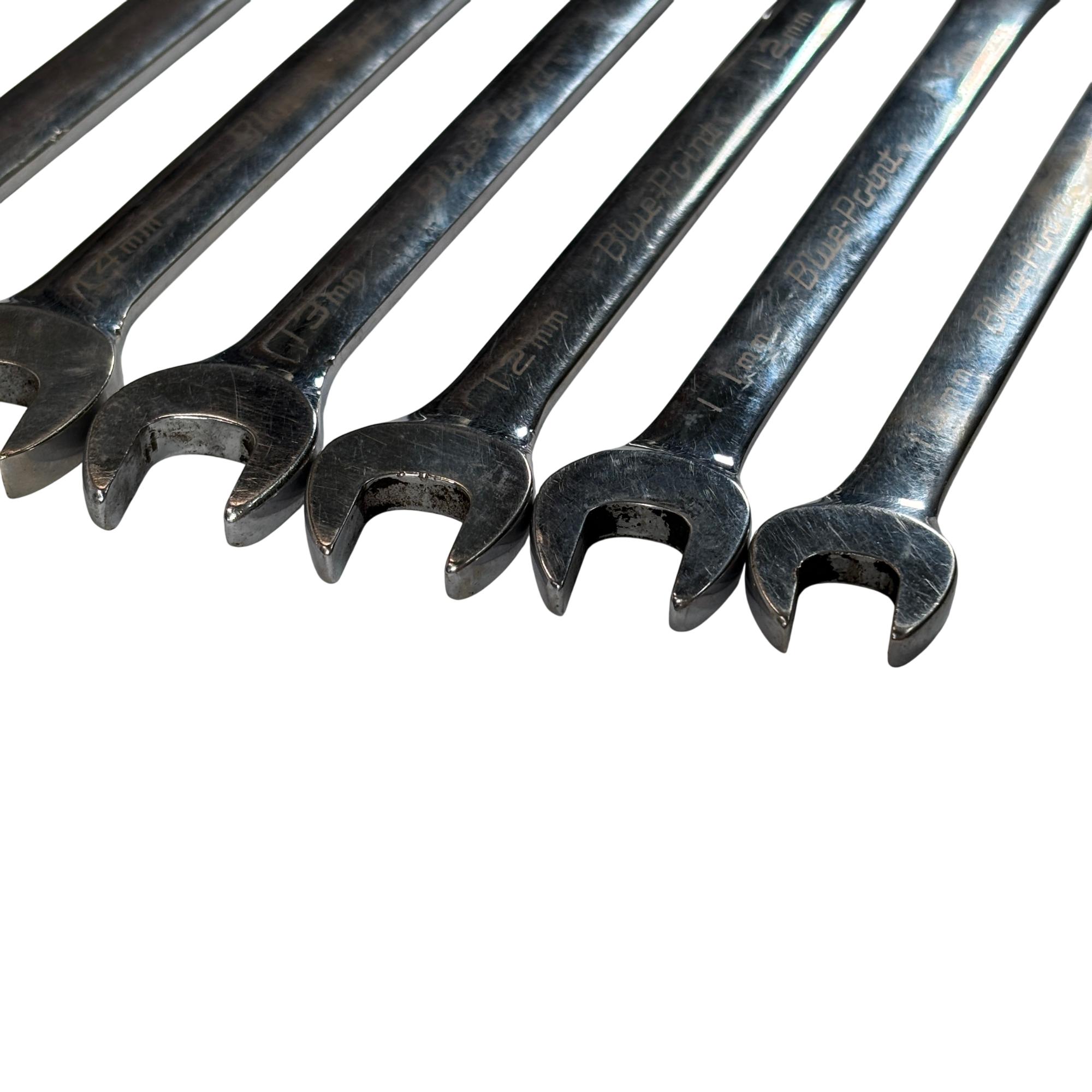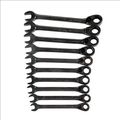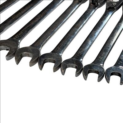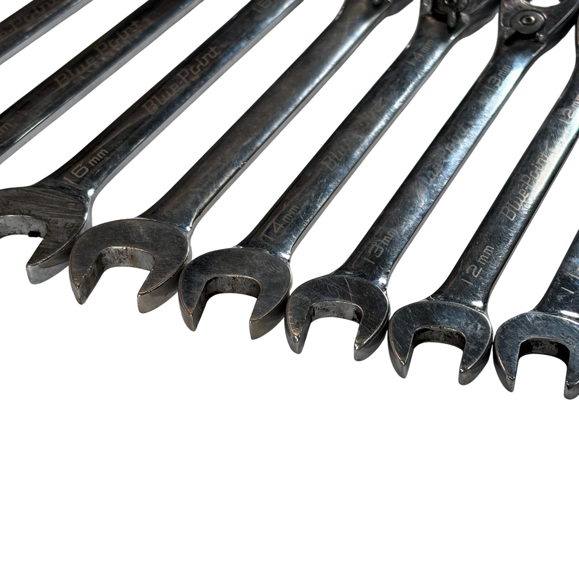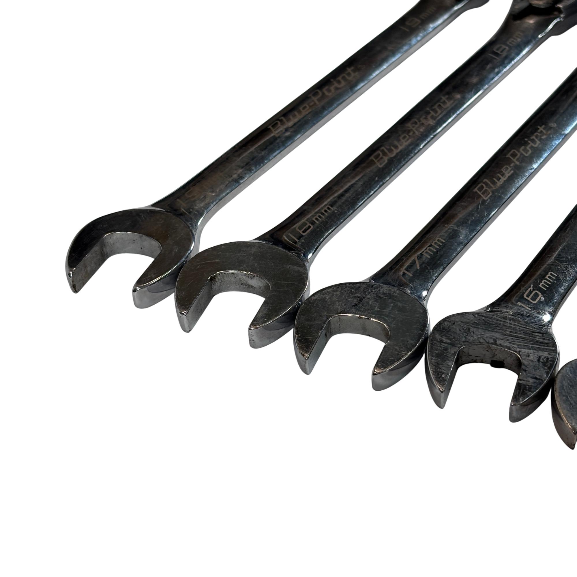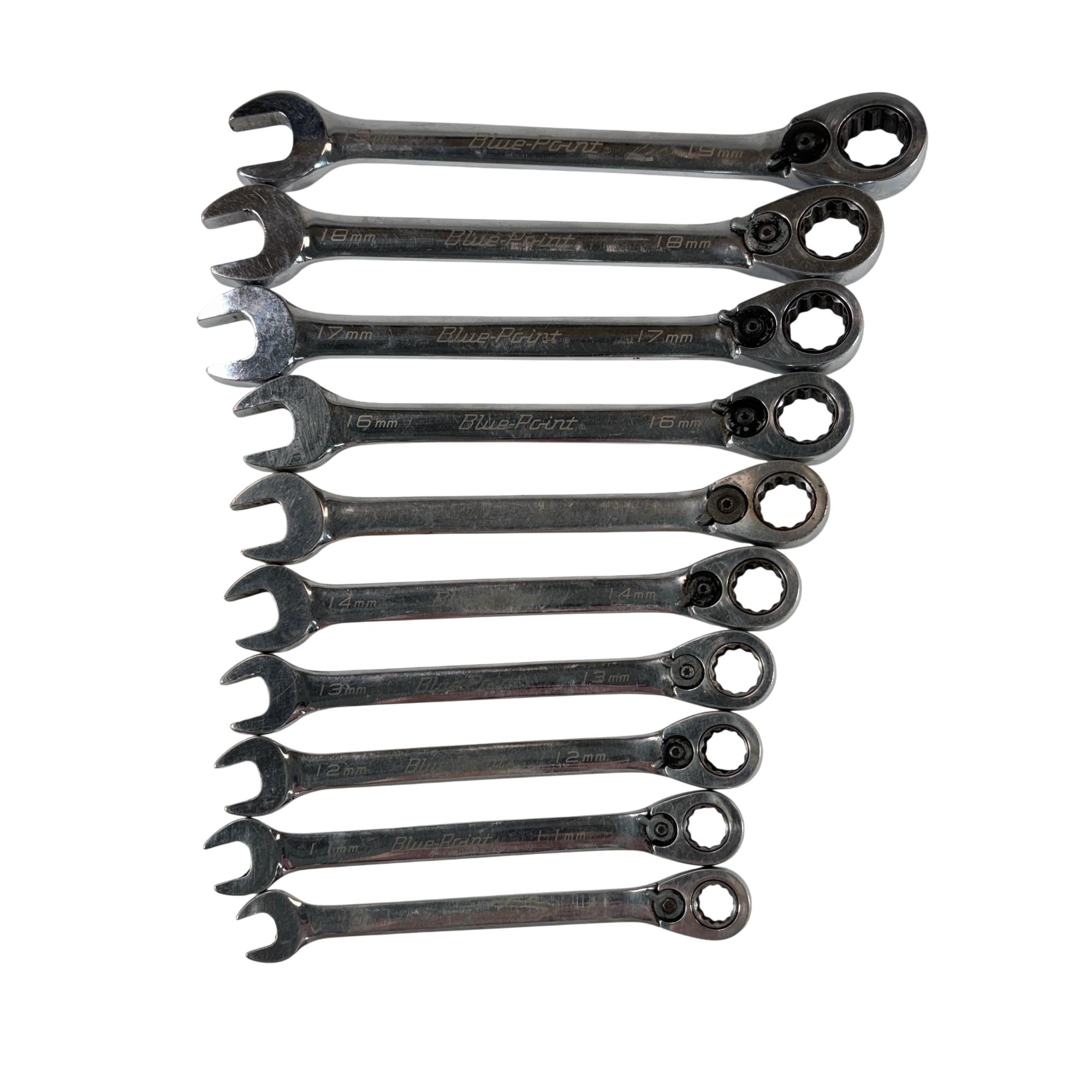 Blue-Point by Snap-on Tools 10-piece 12-point metric ratcheting combination wrench set with a 15-degree offset box end for improved knuckle clearance. The ratcheting mechanism provides fine tooth engagement for minimal swing arc and efficient fastener access, with a reversible box end for added convenience. Designed with a torque-enhancing box end configuration to reduce fastener rounding and improve grip, and finished in a durable nickel-chrome coating for long-lasting corrosion resistance.