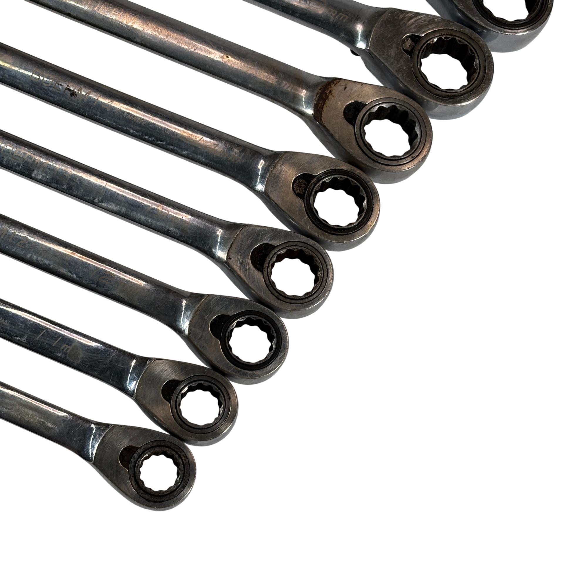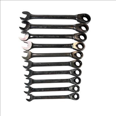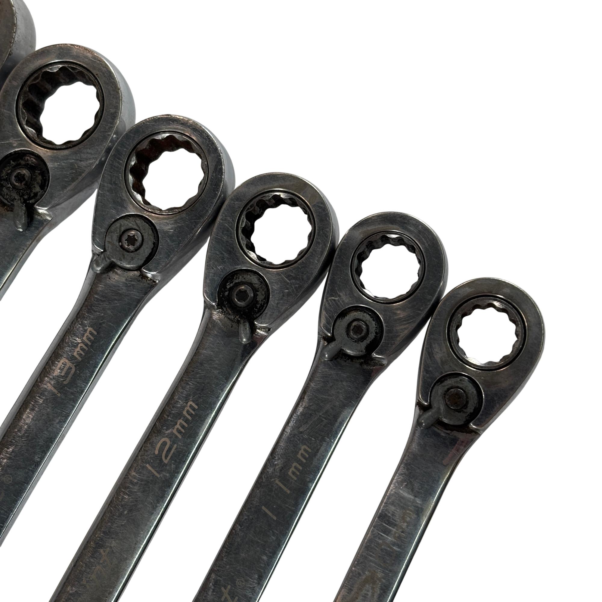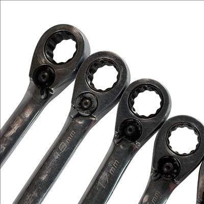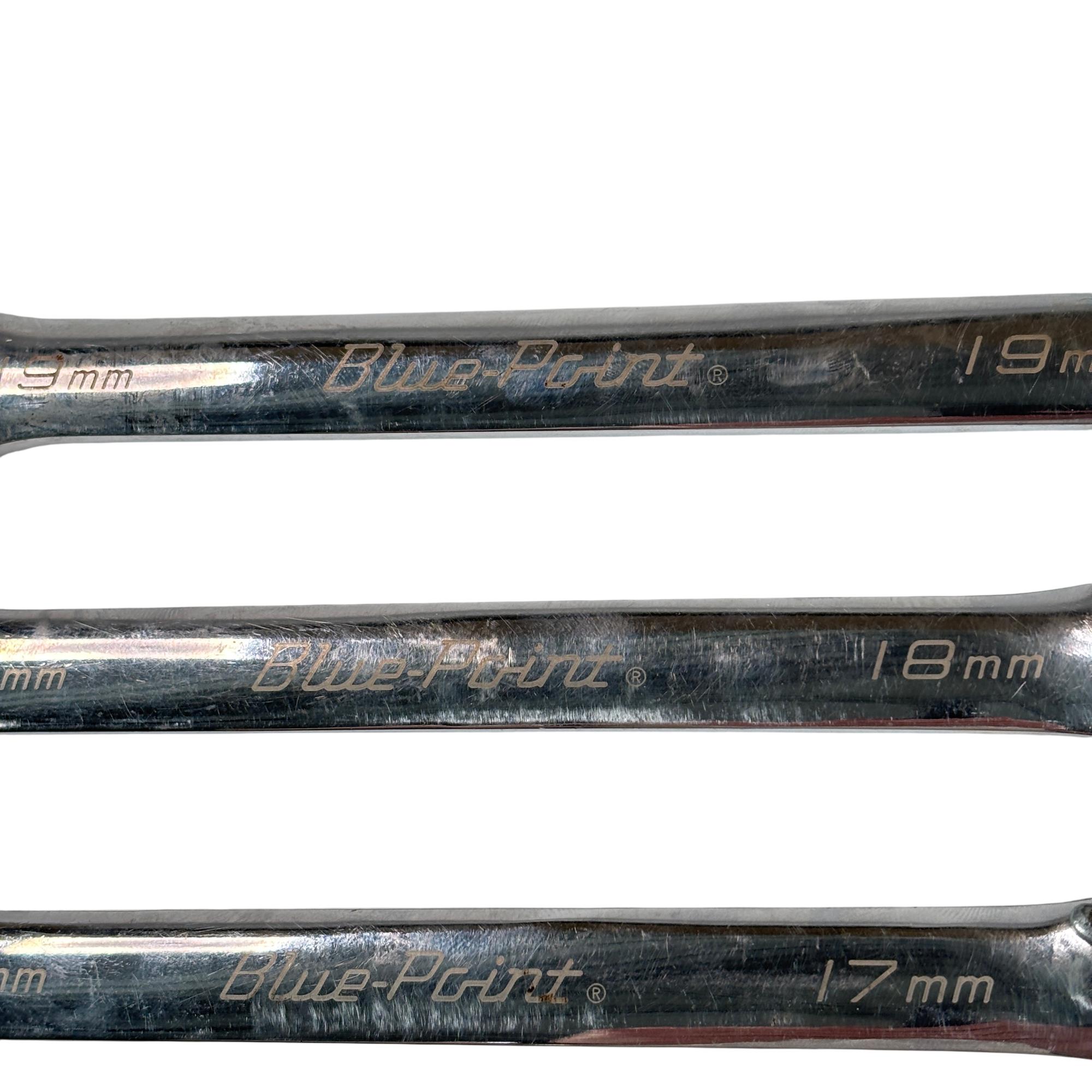 Blue-Point by Snap-on Tools 10-piece 12-point metric ratcheting combination wrench set with a 15-degree offset box end for improved knuckle clearance. The ratcheting mechanism provides fine tooth engagement for minimal swing arc and efficient fastener access, with a reversible box end for added convenience. Designed with a torque-enhancing box end configuration to reduce fastener rounding and improve grip, and finished in a durable nickel-chrome coating for long-lasting corrosion resistance.