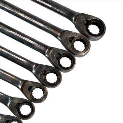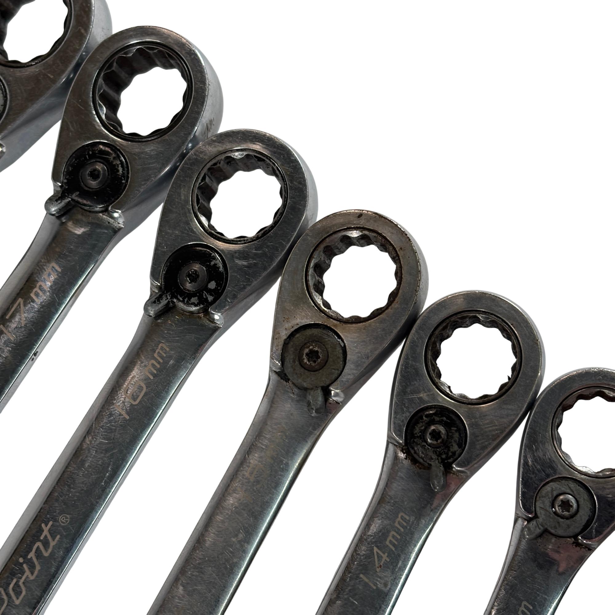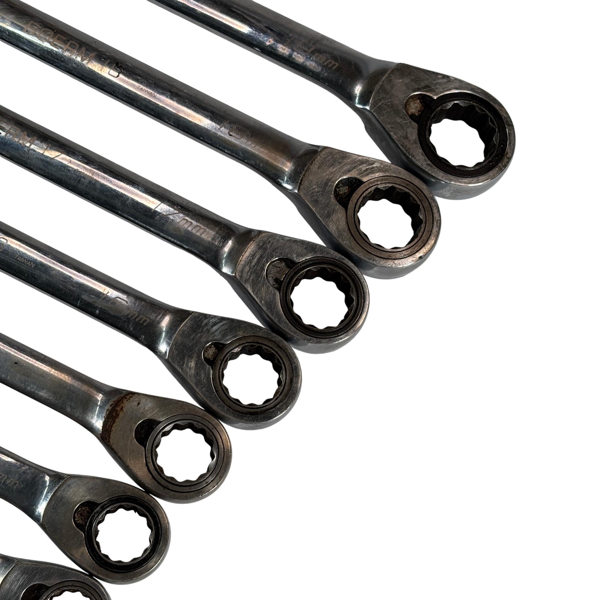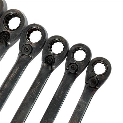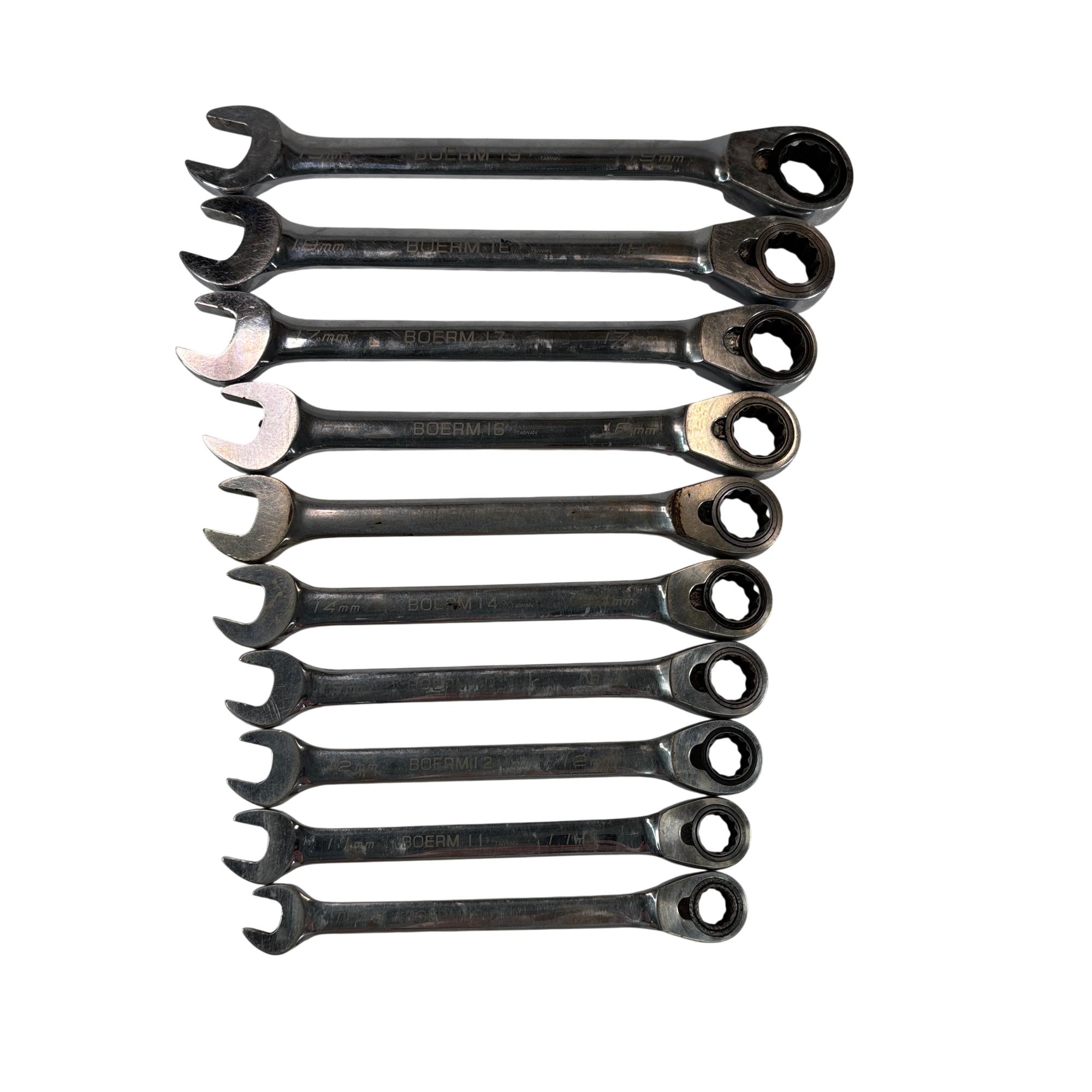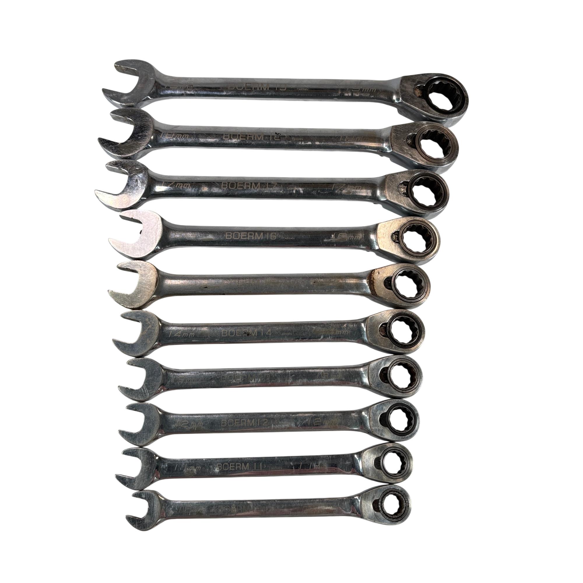 Blue-Point by Snap-on Tools 10-piece 12-point metric ratcheting combination wrench set with a 15-degree offset box end for improved knuckle clearance. The ratcheting mechanism provides fine tooth engagement for minimal swing arc and efficient fastener access, with a reversible box end for added convenience. Designed with a torque-enhancing box end configuration to reduce fastener rounding and improve grip, and finished in a durable nickel-chrome coating for long-lasting corrosion resistance.