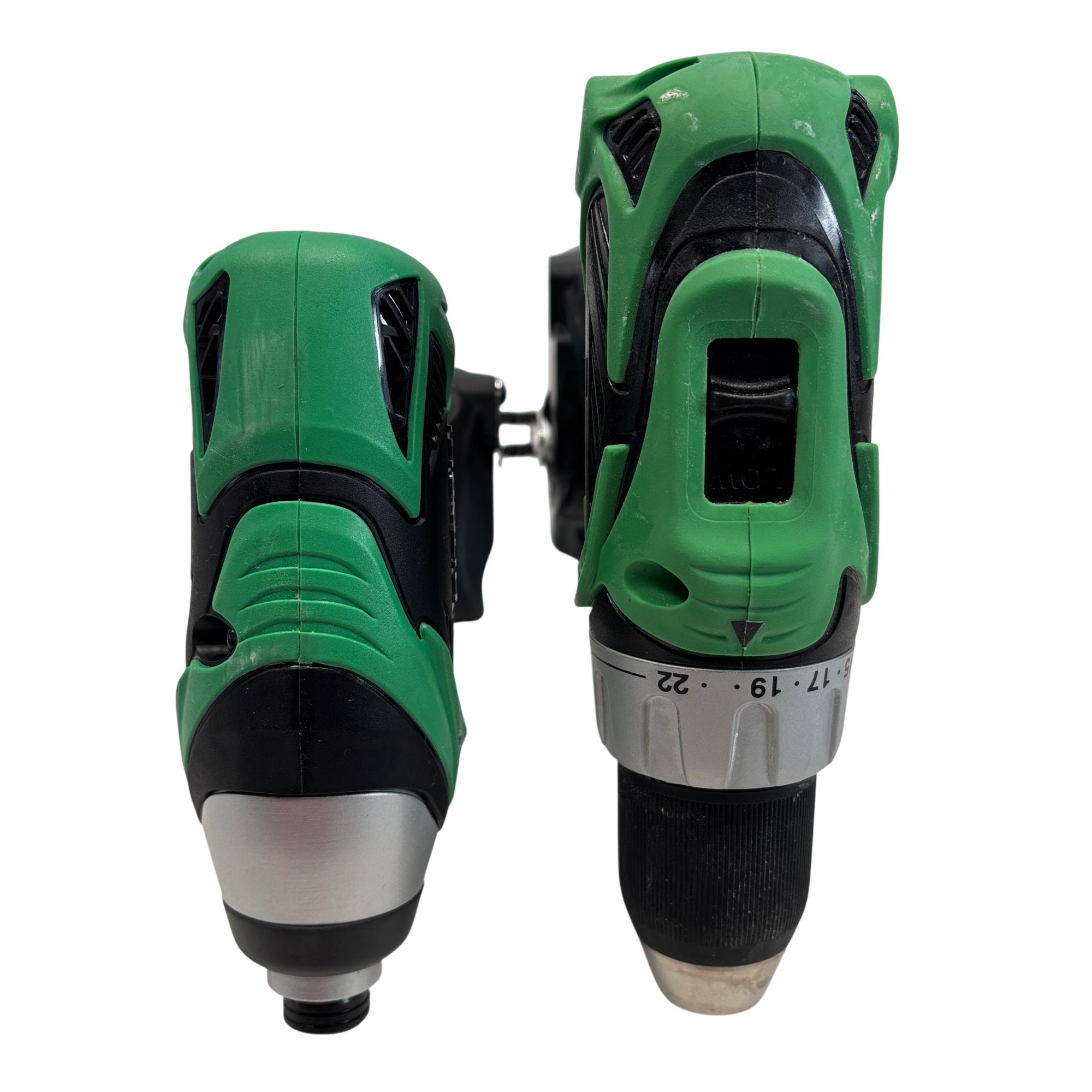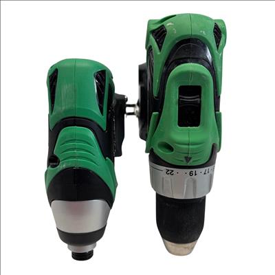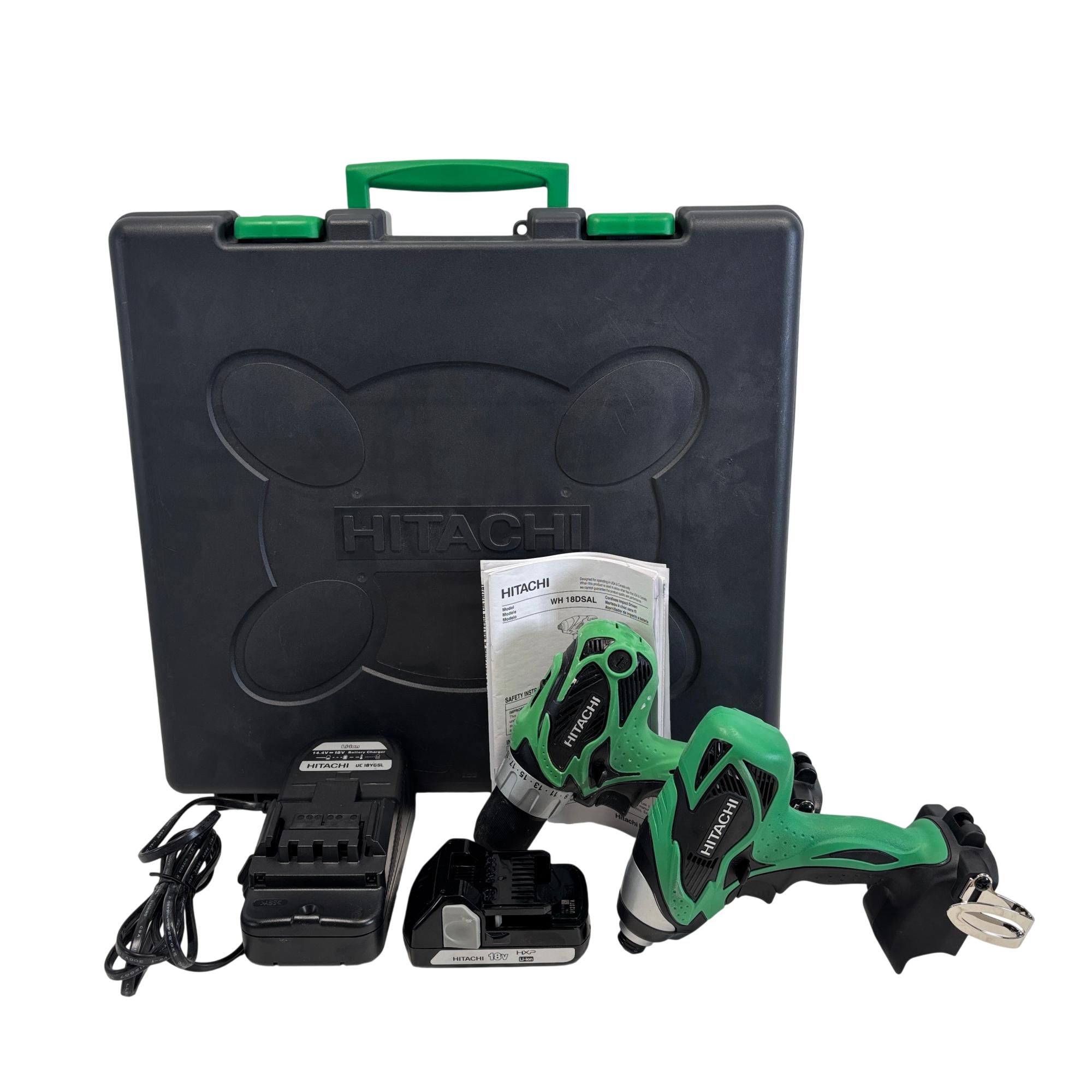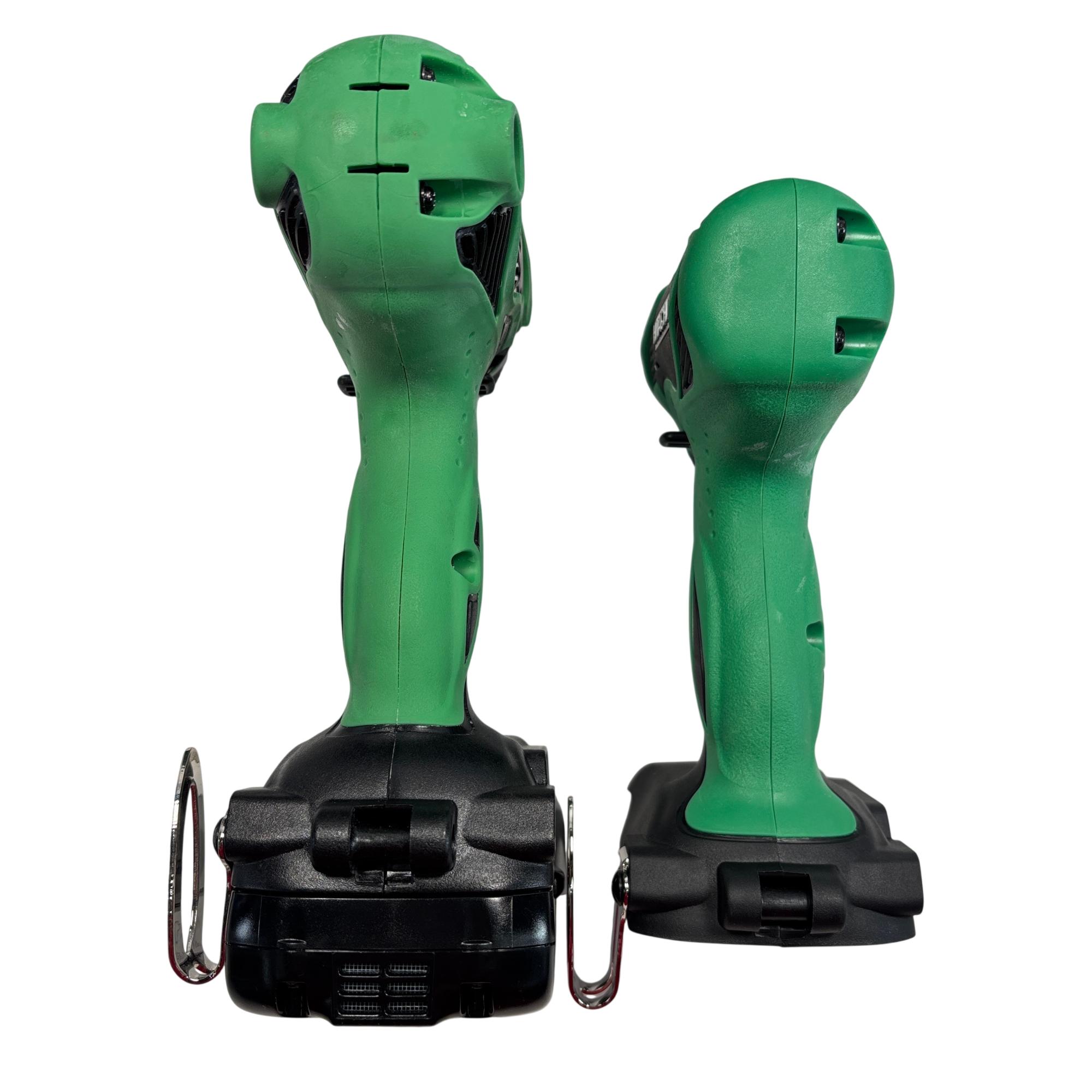 The Hitachi WH18DSAL/DS18DSAL 18V Cordless 1/4" Impact Driver and 1/2" Drill/Driver Kit delivers powerful performance with its 18-volt lithium-ion motors designed for efficient drilling and driving tasks. This green and black tool set features a compact design and ergonomic grips, making it ideal for both professional contractors and DIY enthusiasts needing reliable, cordless power tools for various applications.