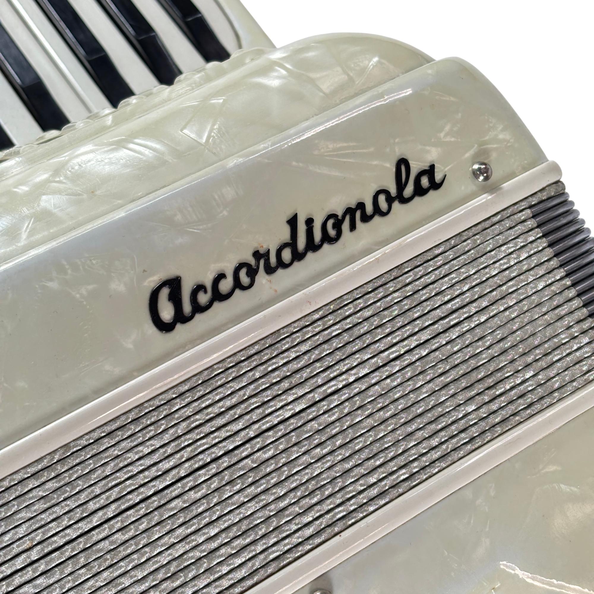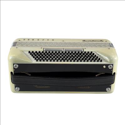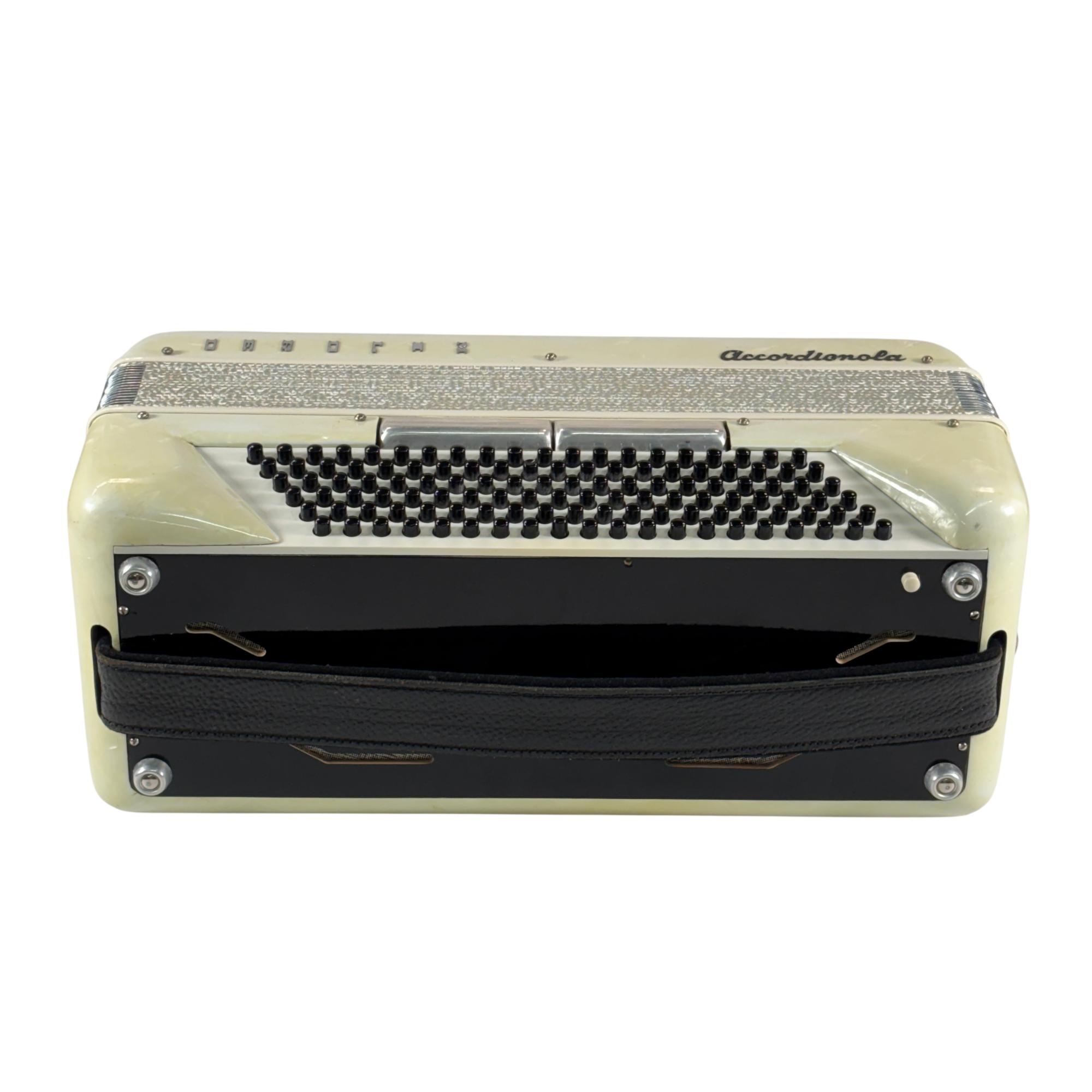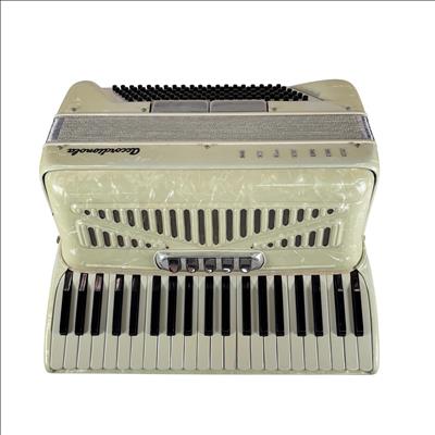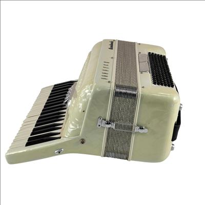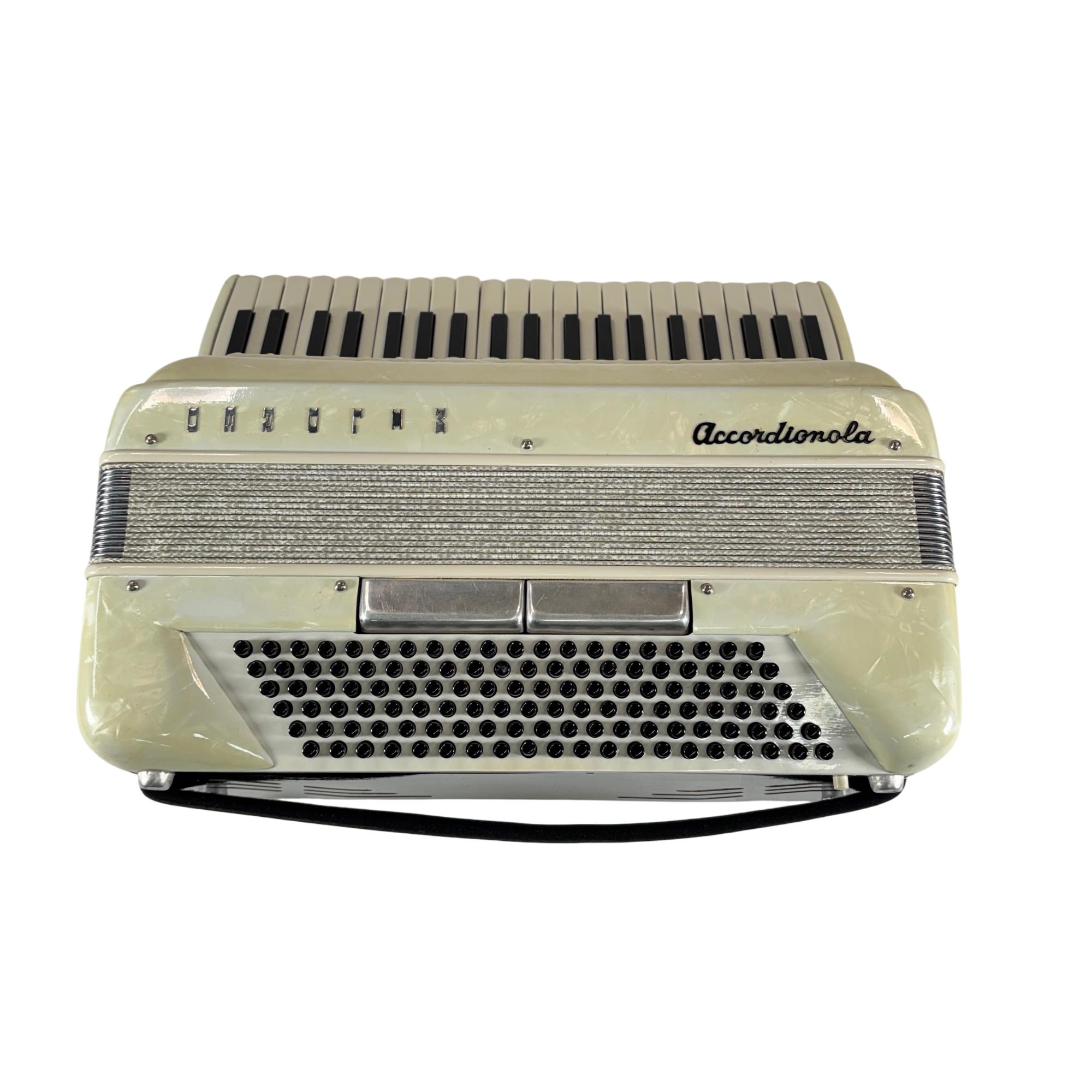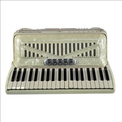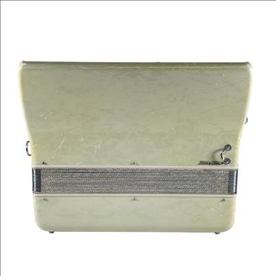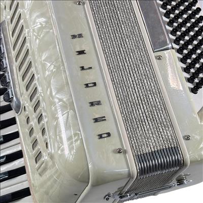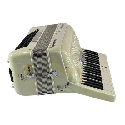 Pearl White Accordionola Italian Piano Accordion features a sleek white body with a silver handle, combining classic design with versatile musical functionality. This finely crafted accordion includes 41 piano keys, 72 bass buttons, and multiple registers, making it suitable for a range of musical styles. Its high-quality Italian construction ensures a rich, authentic sound favored by both beginners and experienced players.