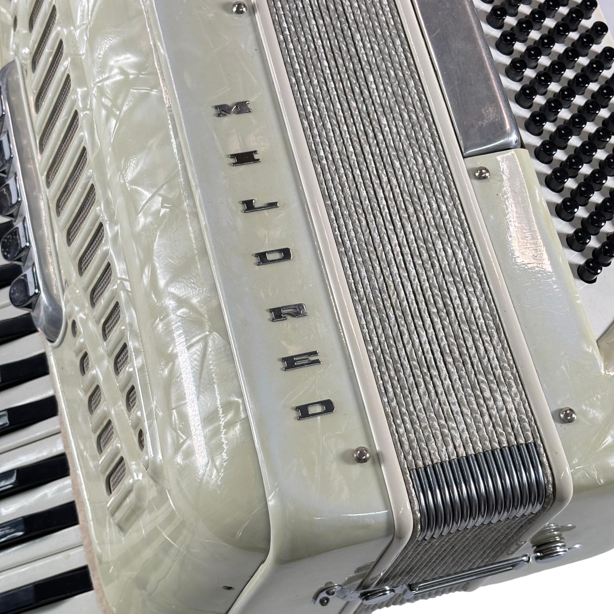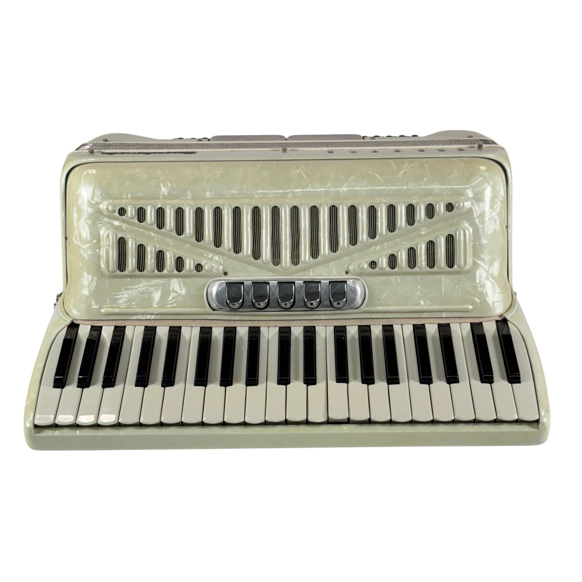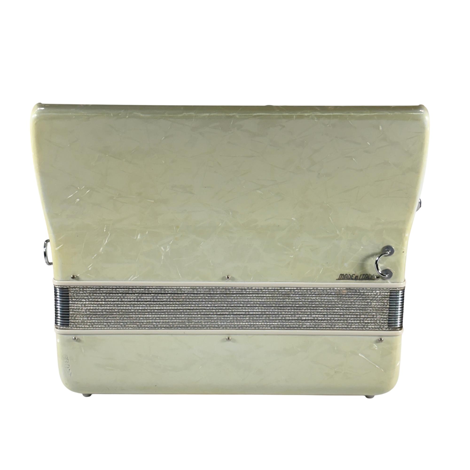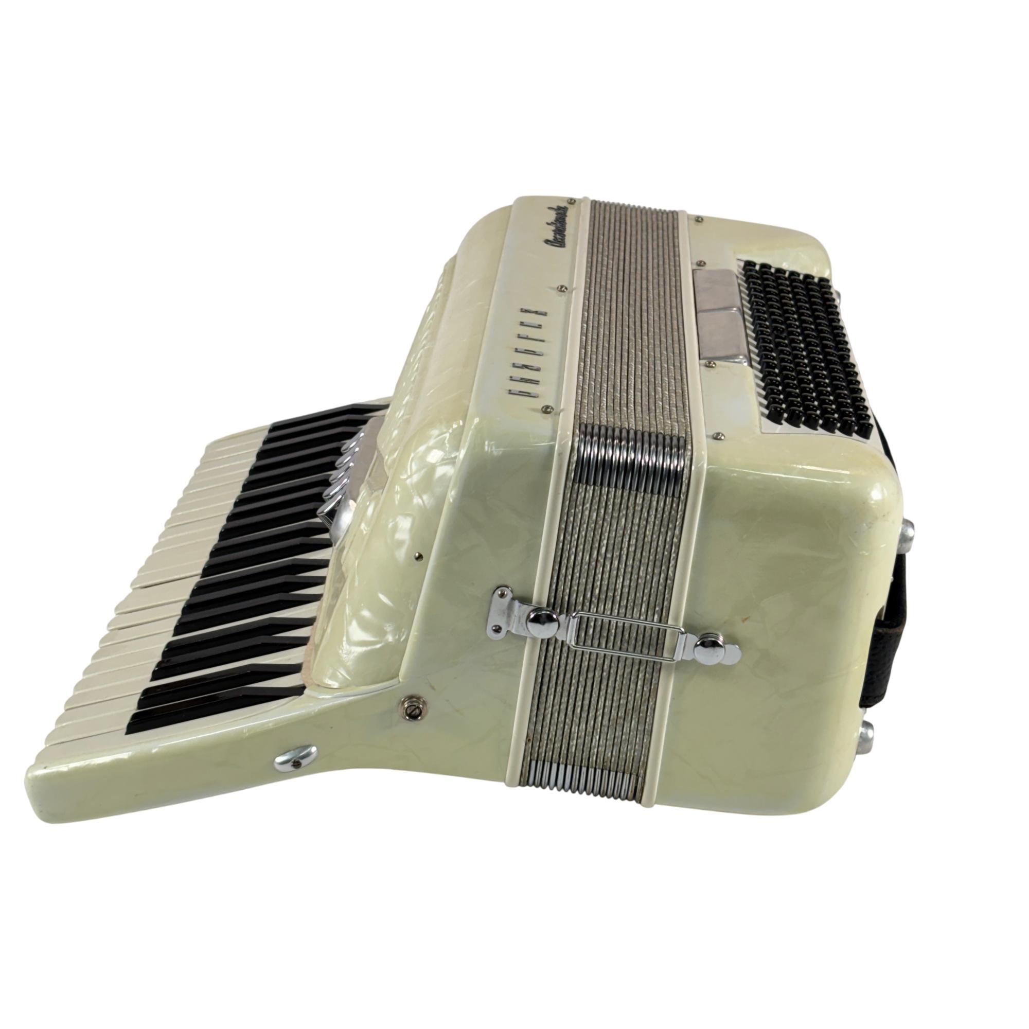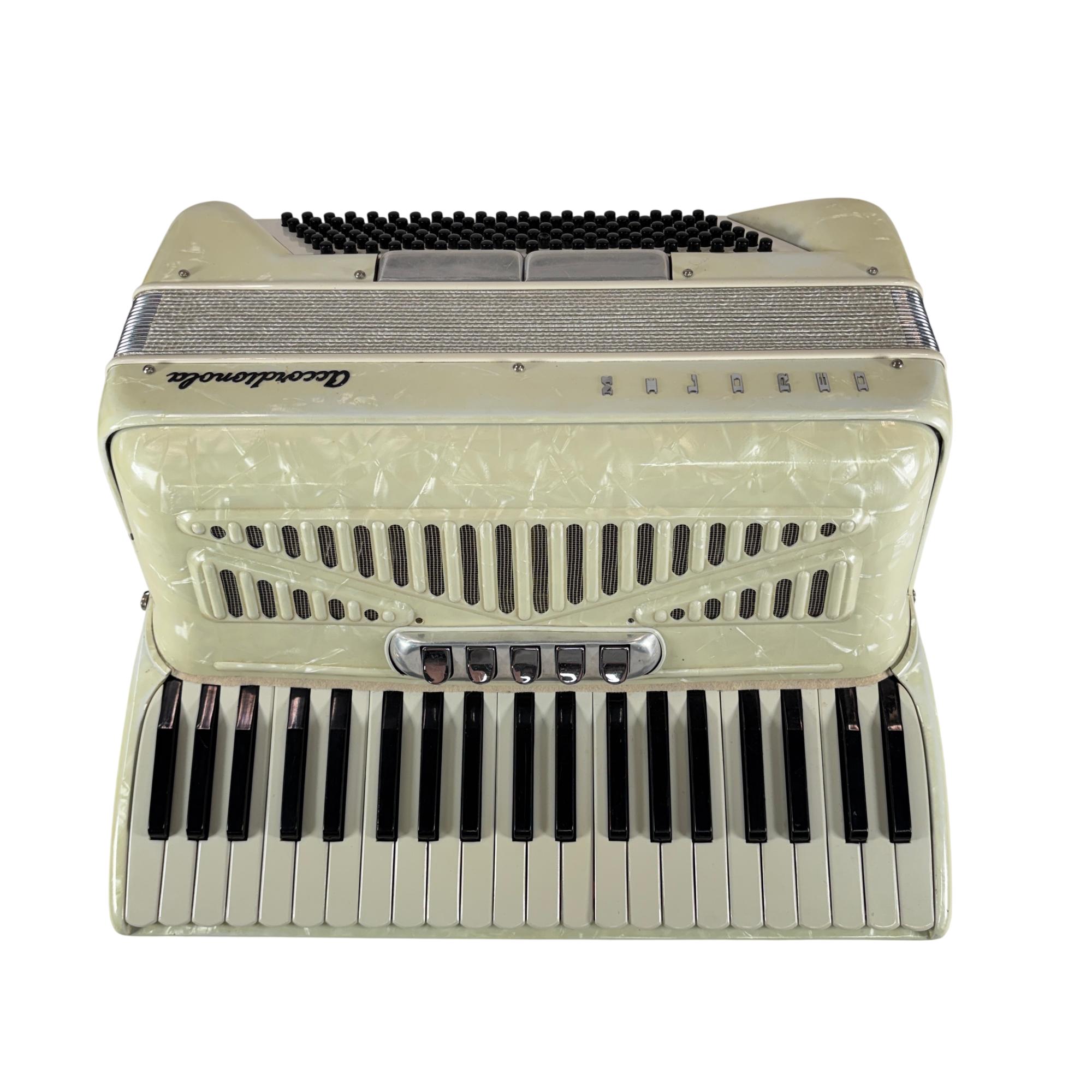 Pearl White Accordionola Italian Piano Accordion features a sleek white body with a silver handle, combining classic design with versatile musical functionality. This finely crafted accordion includes 41 piano keys, 72 bass buttons, and multiple registers, making it suitable for a range of musical styles. Its high-quality Italian construction ensures a rich, authentic sound favored by both beginners and experienced players.