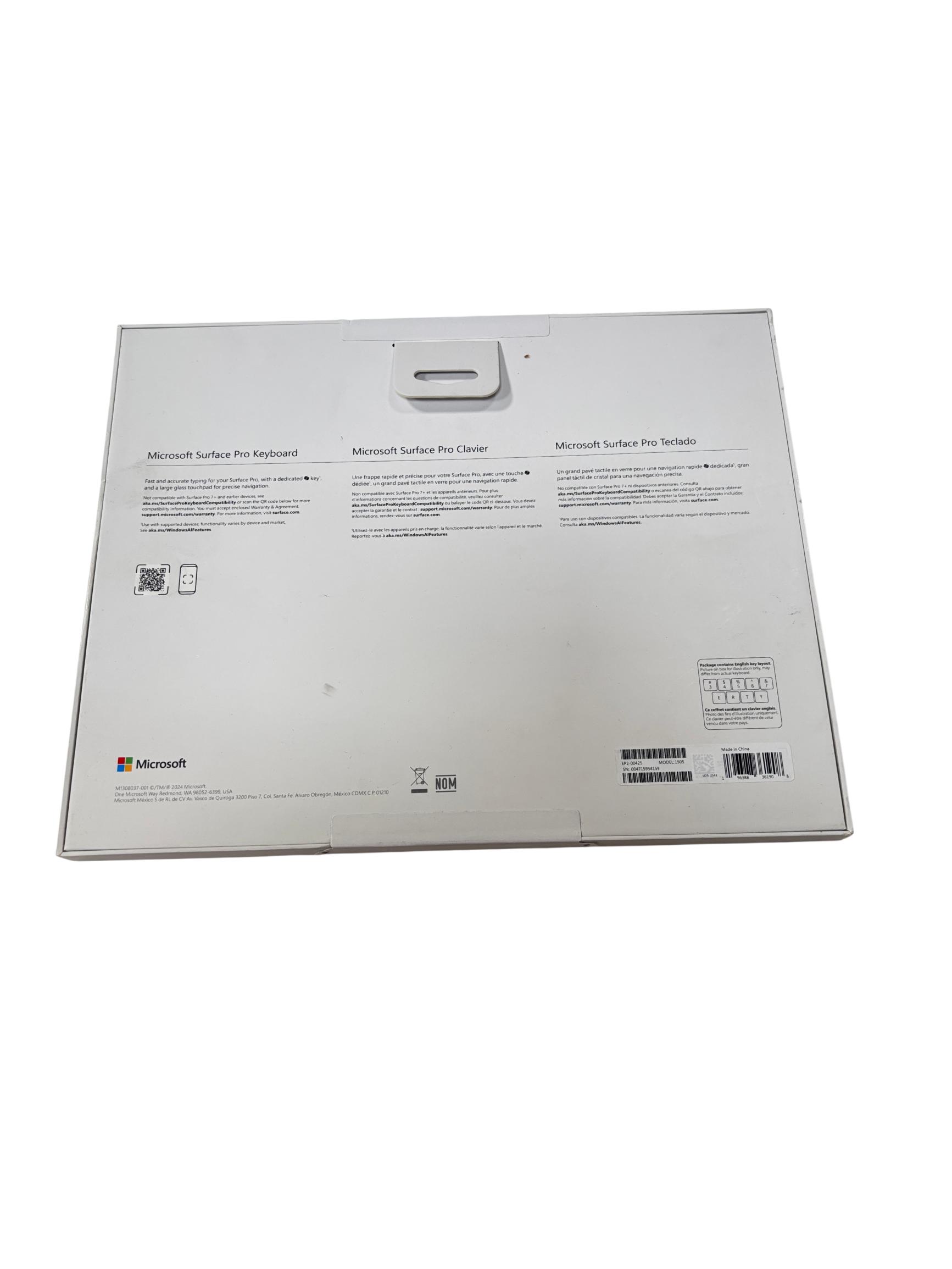 Microsoft Surface Pro Keyboard Model 1905 features a sleek black design with an English key layout optimized for fast and accurate typing. It includes a large glass touchpad for precise navigation and is designed specifically for compatible Surface Pro devices, enhancing productivity and ease of use in a compact form factor.