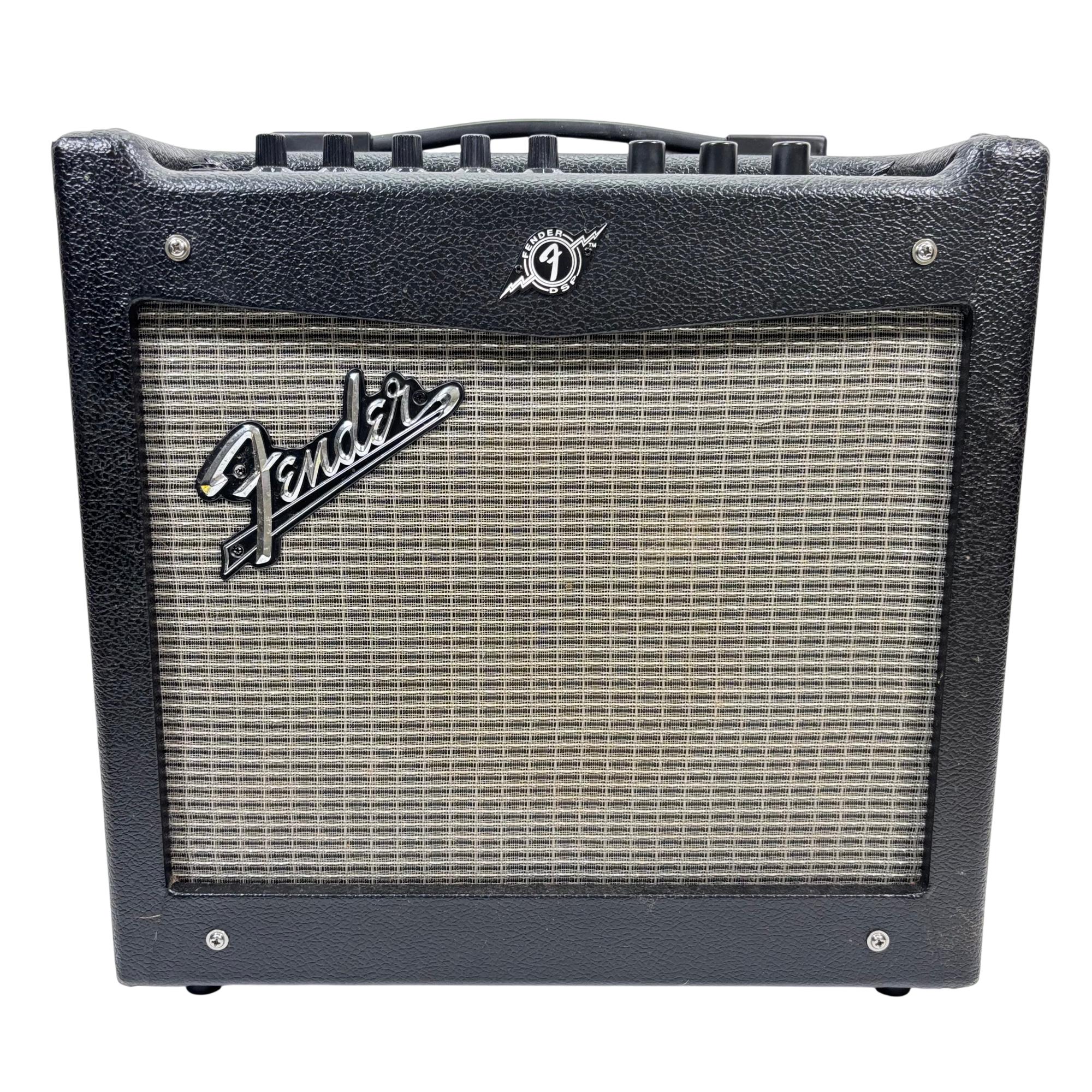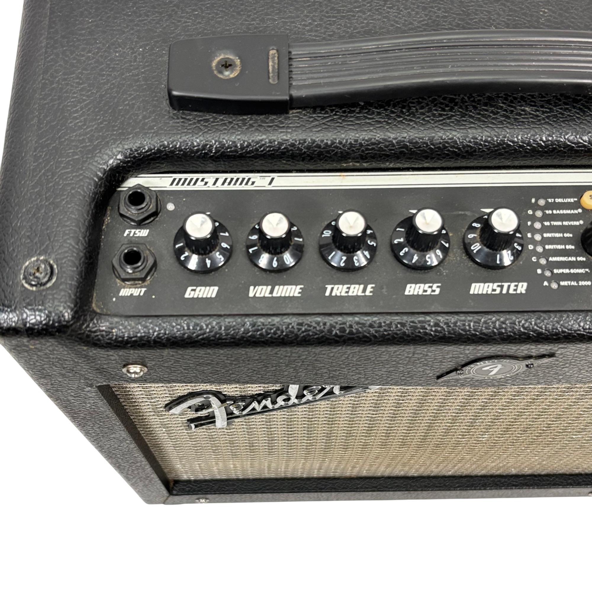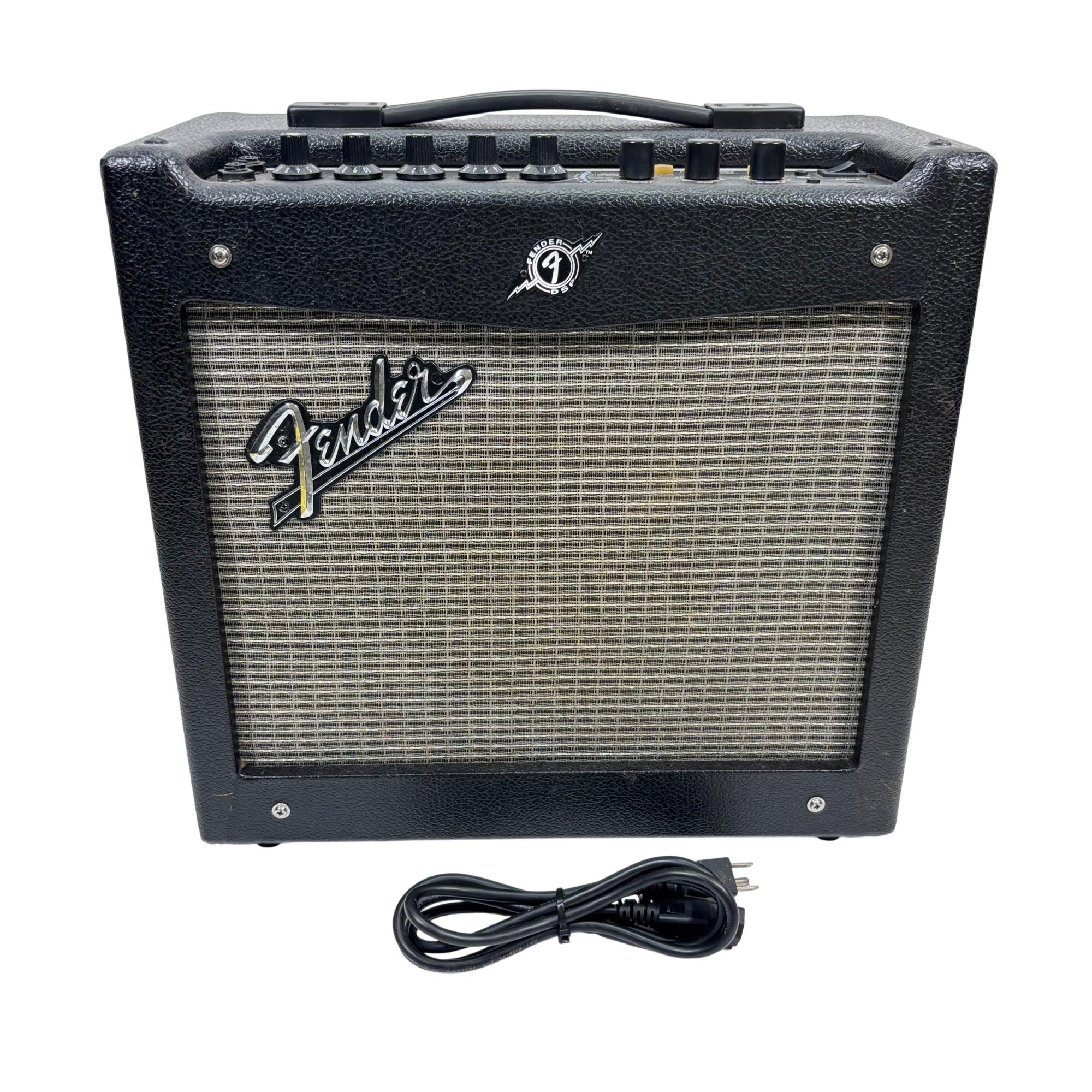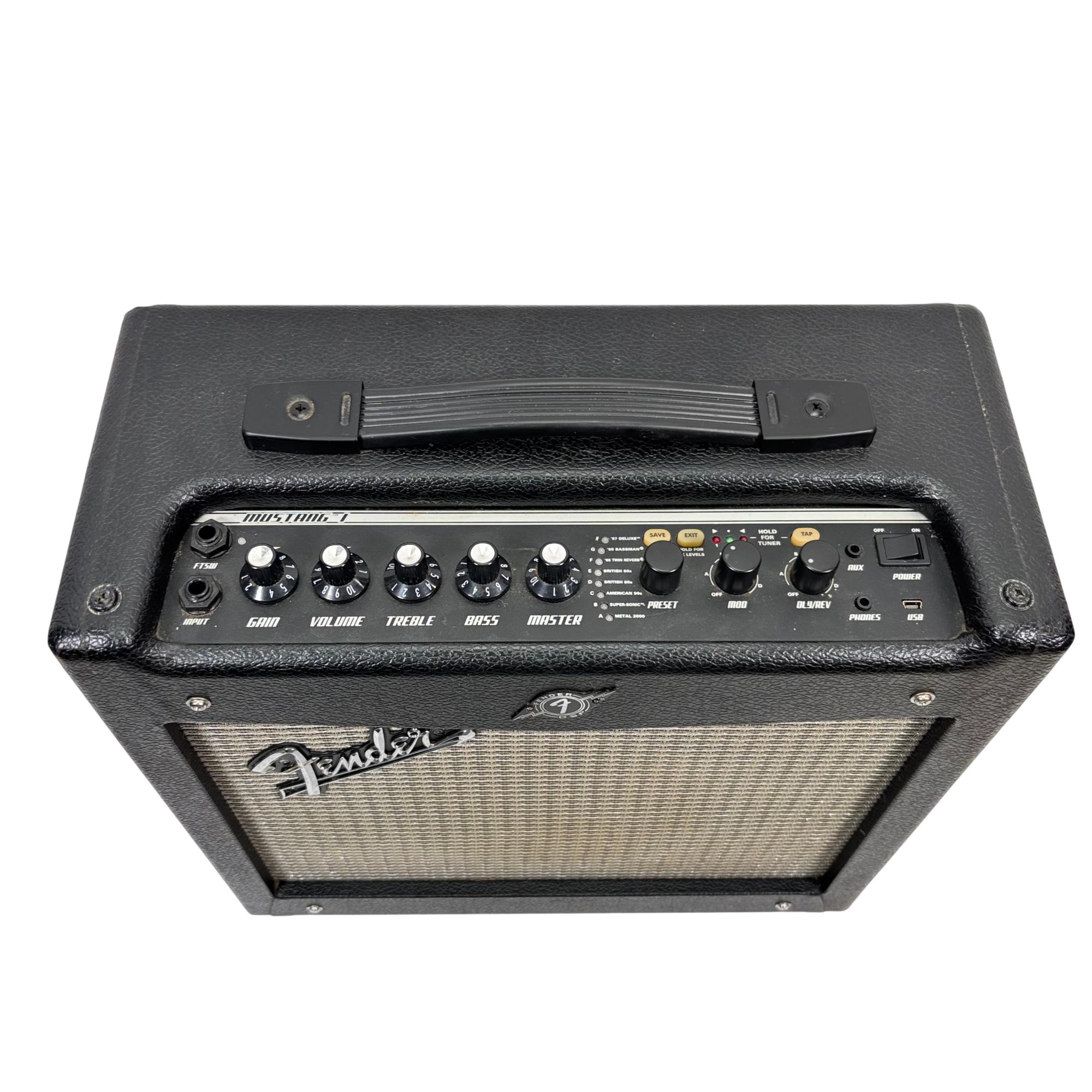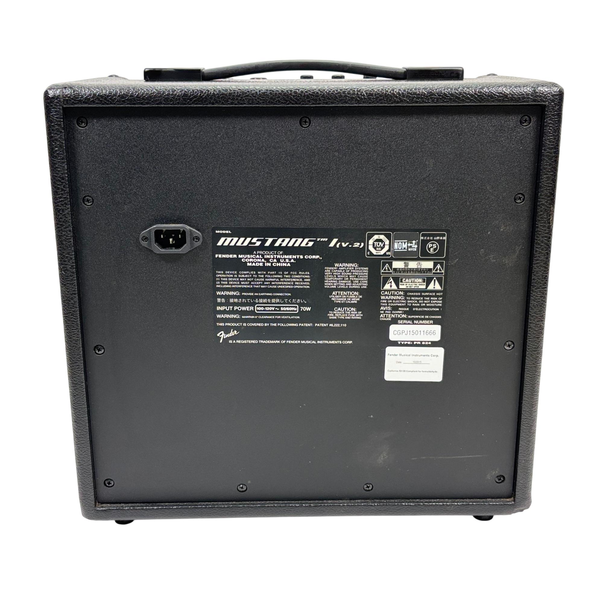 Fender Mustang I V.2 20W 1x8 Modeling Guitar Combo Amplifier delivers versatile sound shaping with digital modeling technology and intuitive controls including gain, volume, treble, bass, and master settings. This compact amplifier features a single 8-inch speaker designed to provide clear tone and powerful output suitable for practice and small performances.