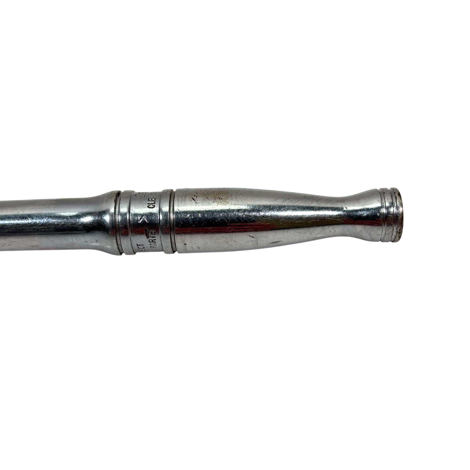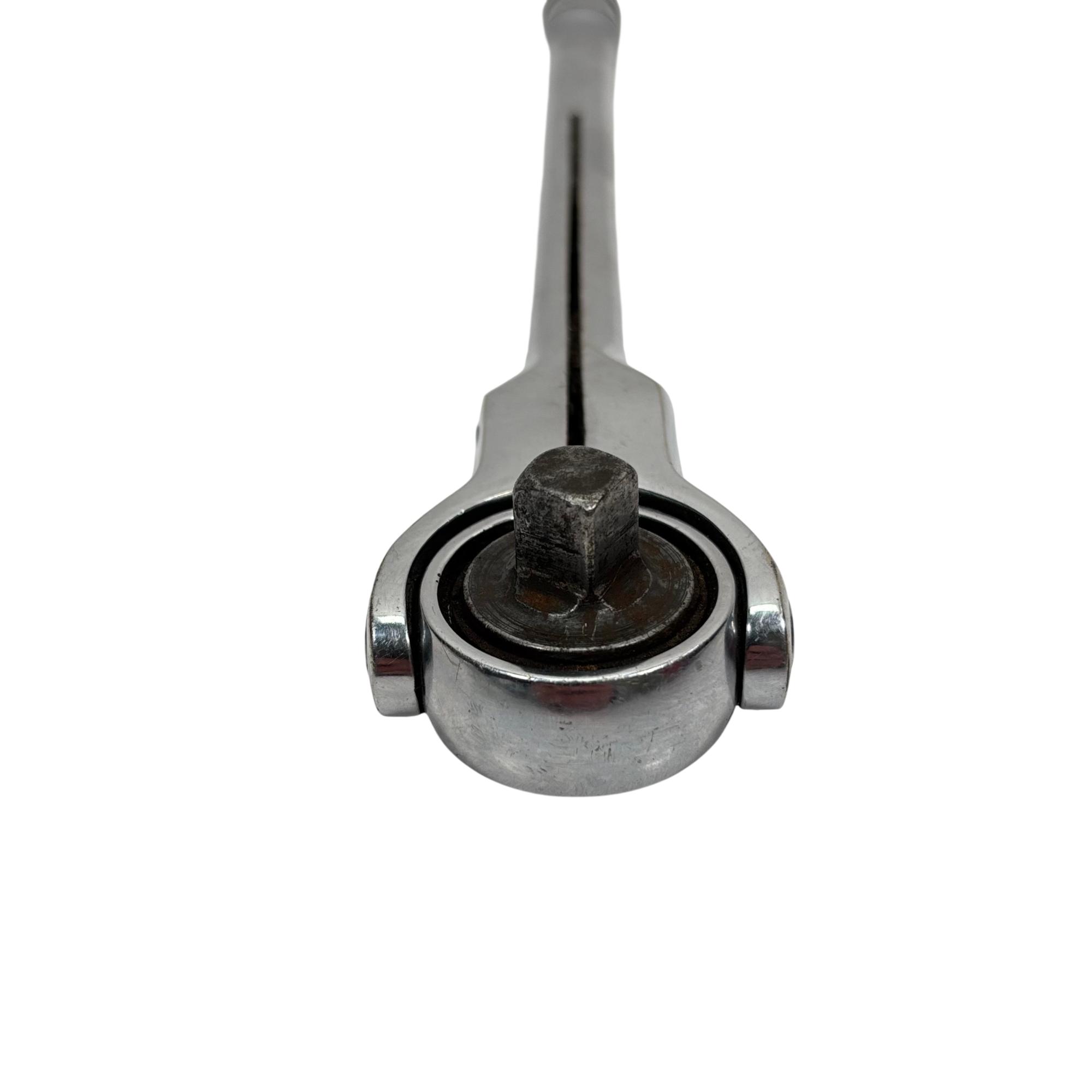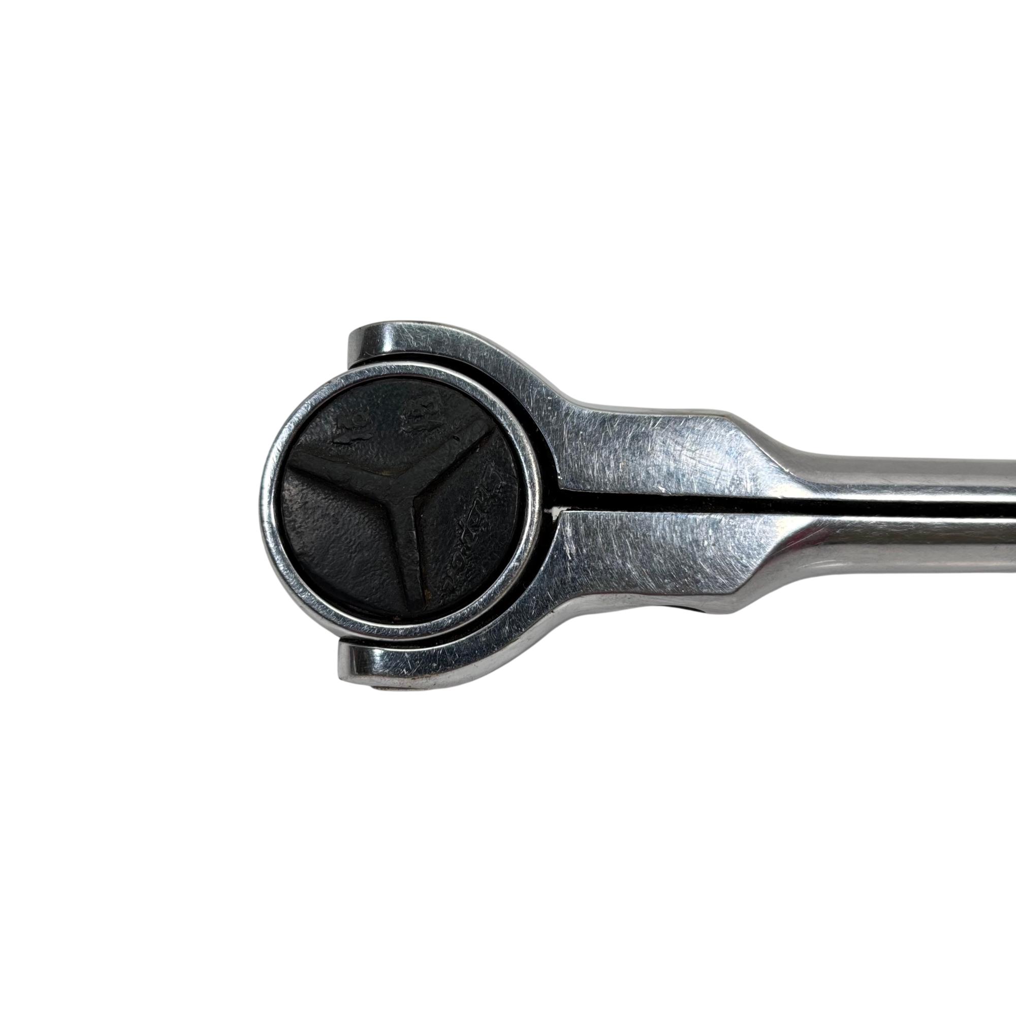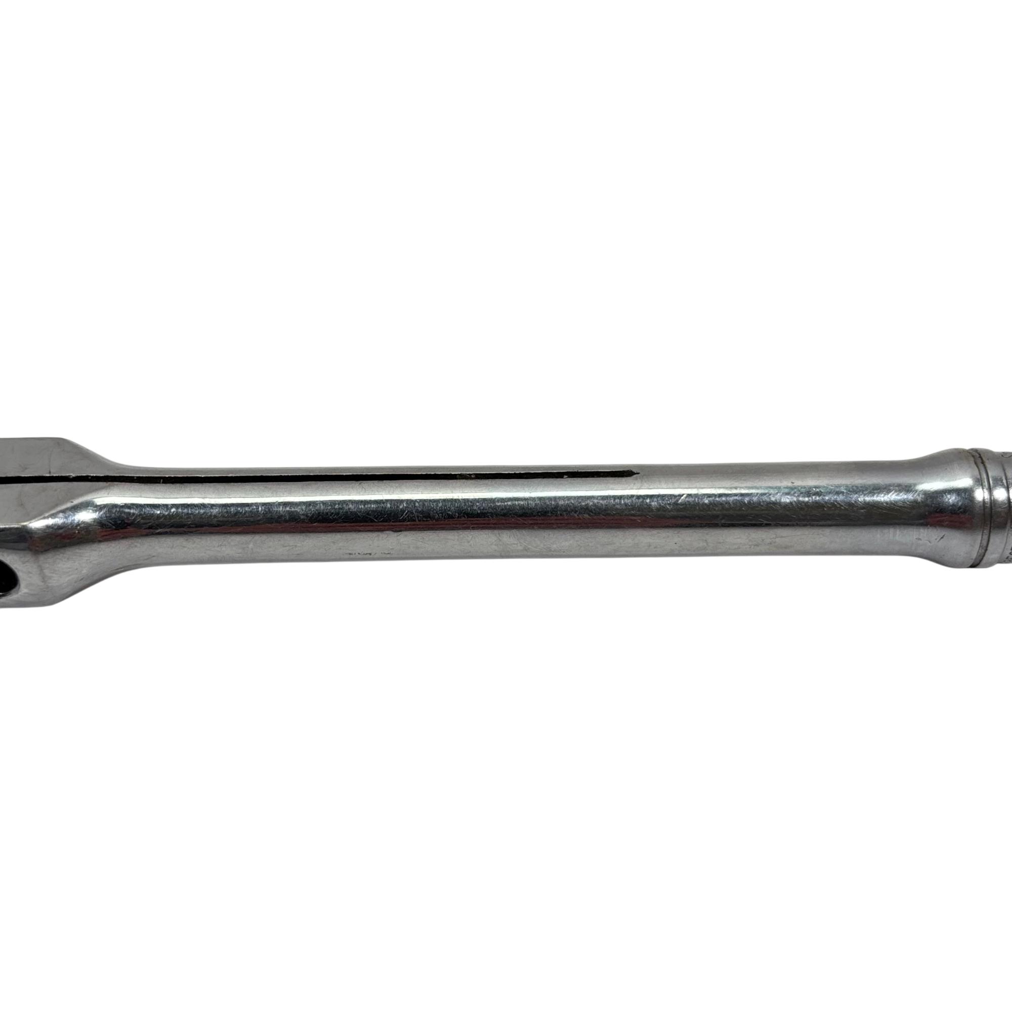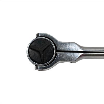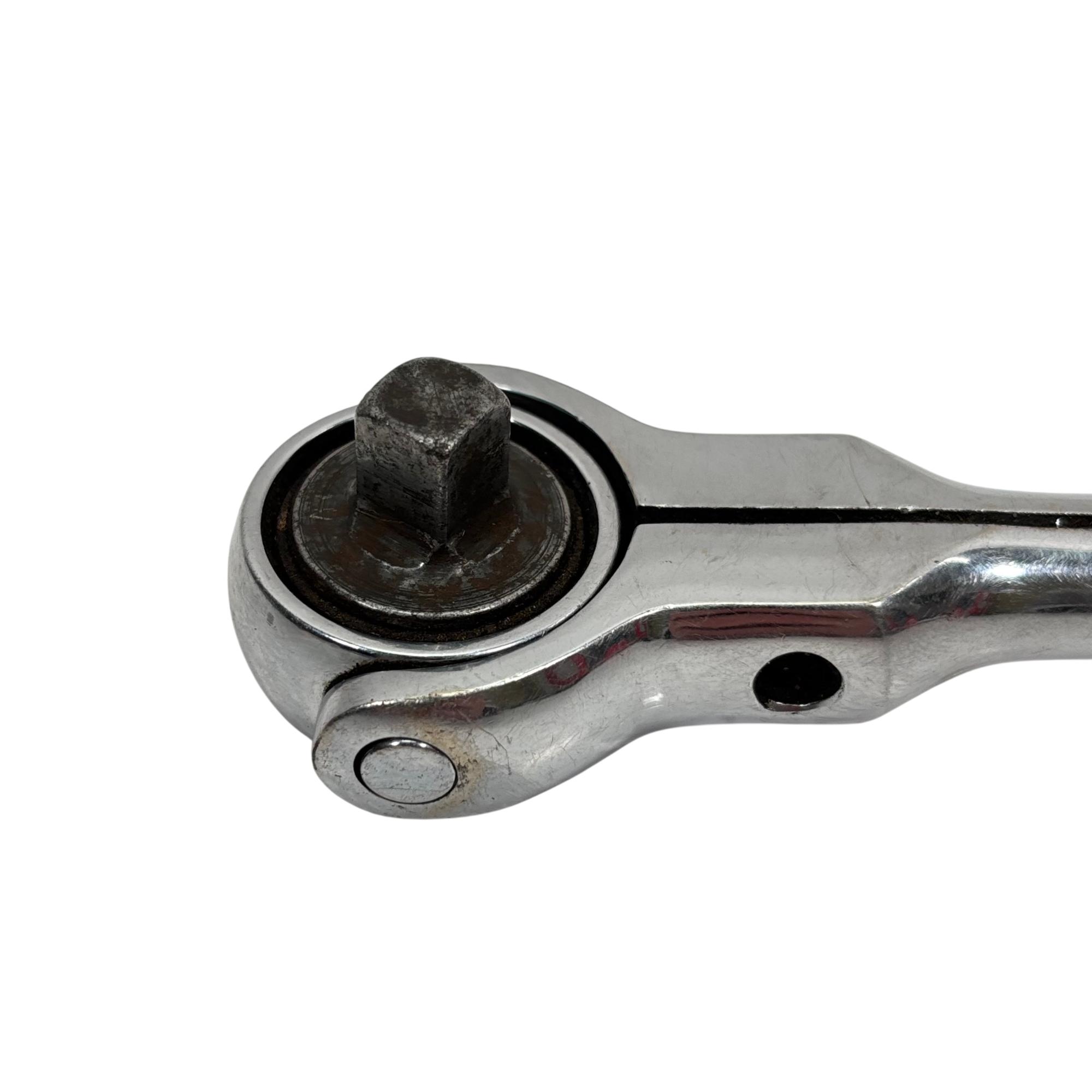 Snap-on Tools F748 3/8" Drive Swivel Head Ratchet features a chrome finish with a round flex head for enhanced maneuverability in tight spaces. Designed with a swivel head, this ratchet allows for flexible positioning and precise socket turning, making it ideal for automotive and mechanical applications.
