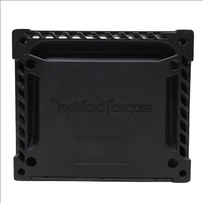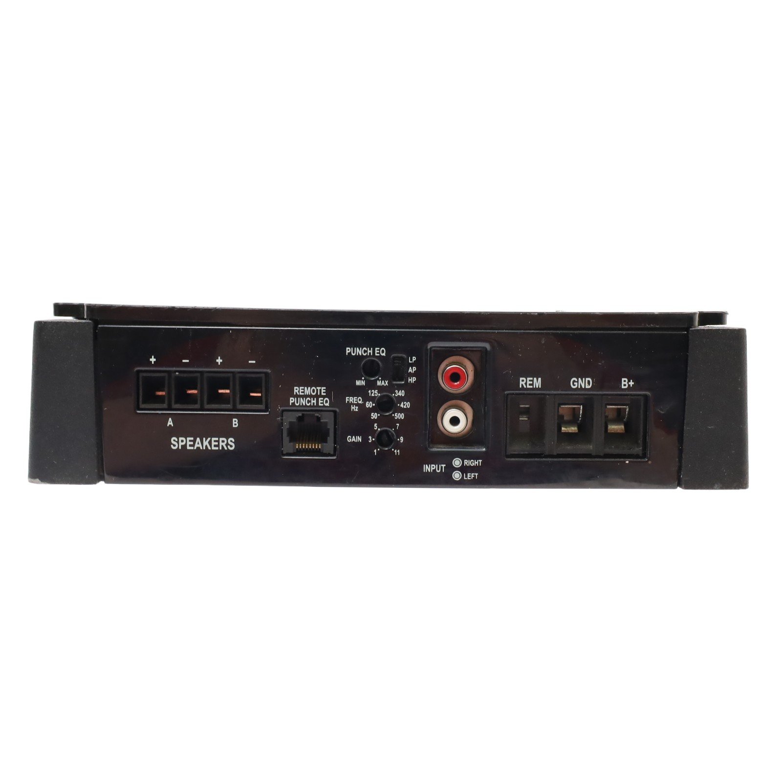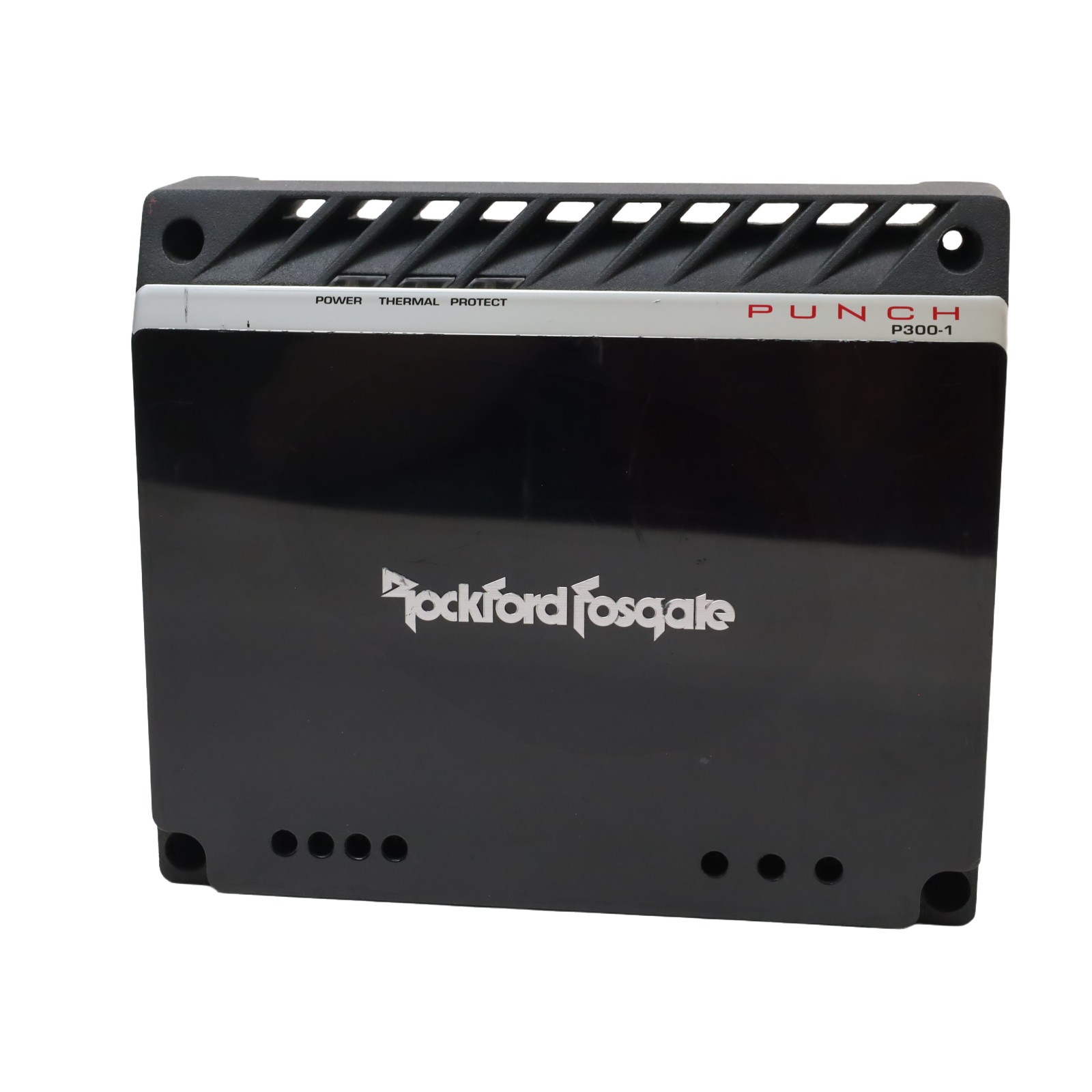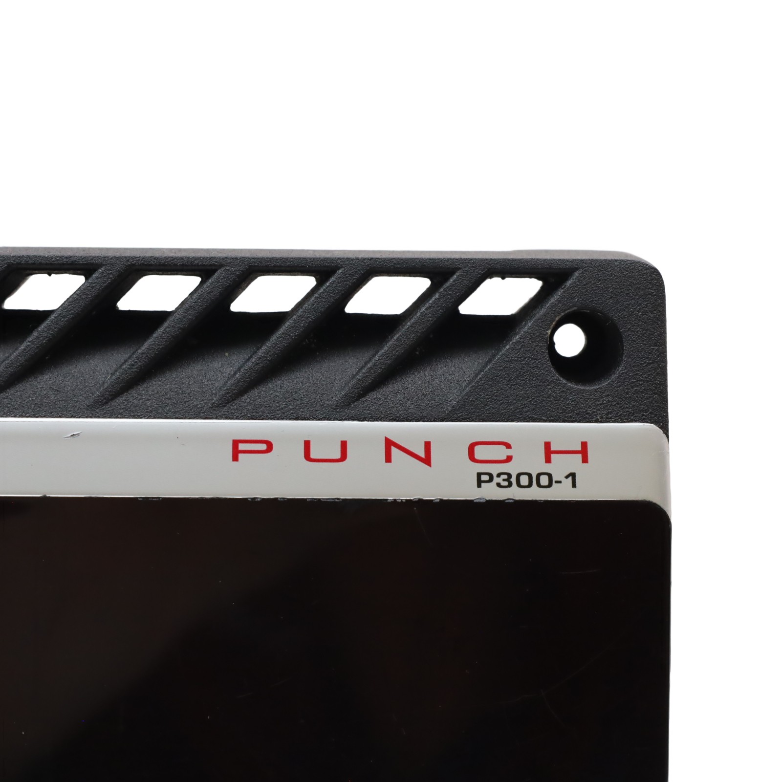 A mono subwoofer amplifier delivering 150 watts RMS x 1 at 4 ohms, and 300 watts RMS x 1 at 2 ohms. It features a Class-AB amplifier design with MOSFET power and output stages, and incorporates a Dynamic Thermal Management cooling system to maintain optimal performance. Adjustable high- and low-pass filters (50-500 Hz, 12 dB/octave) are included, alongside variable bass and treble boost controls (0-18 dB at 45 Hz, 0-12 dB at 12K Hz).